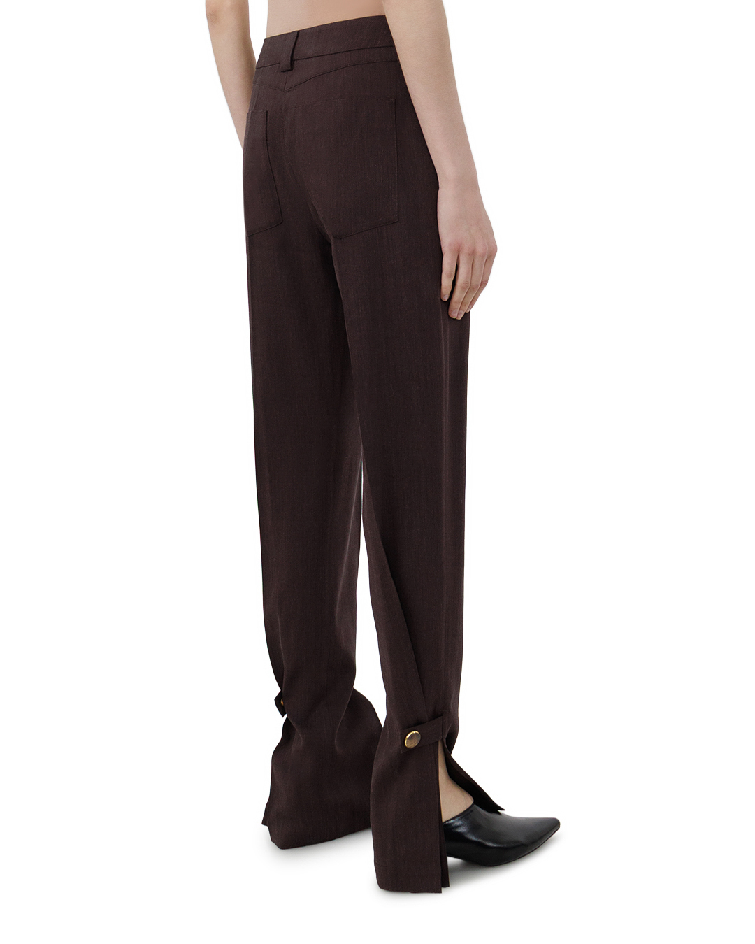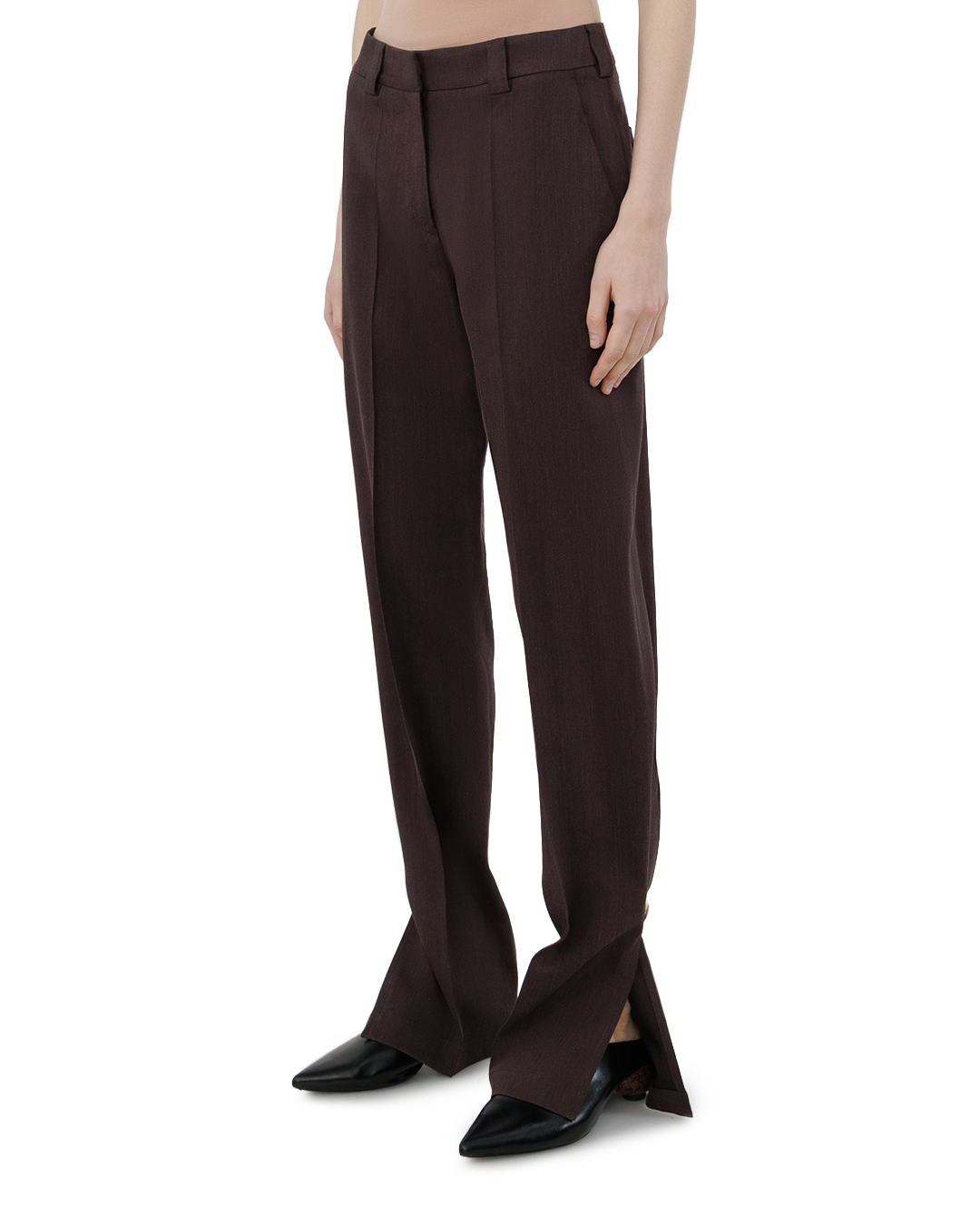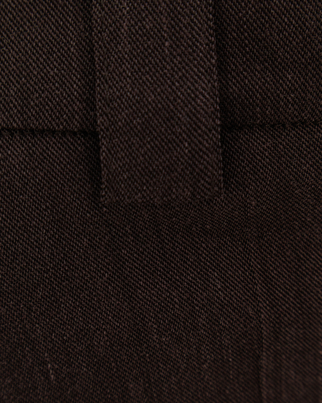 Эти брюки — образец сдержанной элегантности. Классический крой с лёгким расширением к низу создаёт сбалансированный силуэт, а глубокий коричневый оттенок придаёт образу респектабельности. Аккуратные стрелки подчёркивают строгость линий, а защипы на талии добавляют изысканности и визуально корректируют фигуру. Особого внимания заслуживают разрезы у подола — они вносят ноту современного шика, не нарушая общей классики образа. Пояс выполнен с чёткими складками, что подчёркивает тщательность пошива. Ровная фактура ткани и аккуратная обработка швов говорят о высоком качестве изделия. Такой элемент гардероба станет основой для стильных деловых и вечерних образов, добавляя им утончённости и грации.