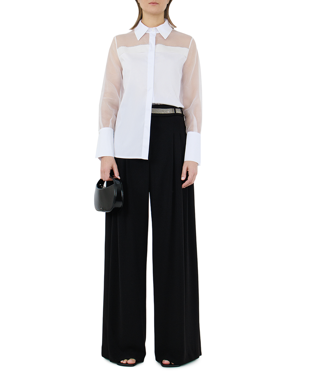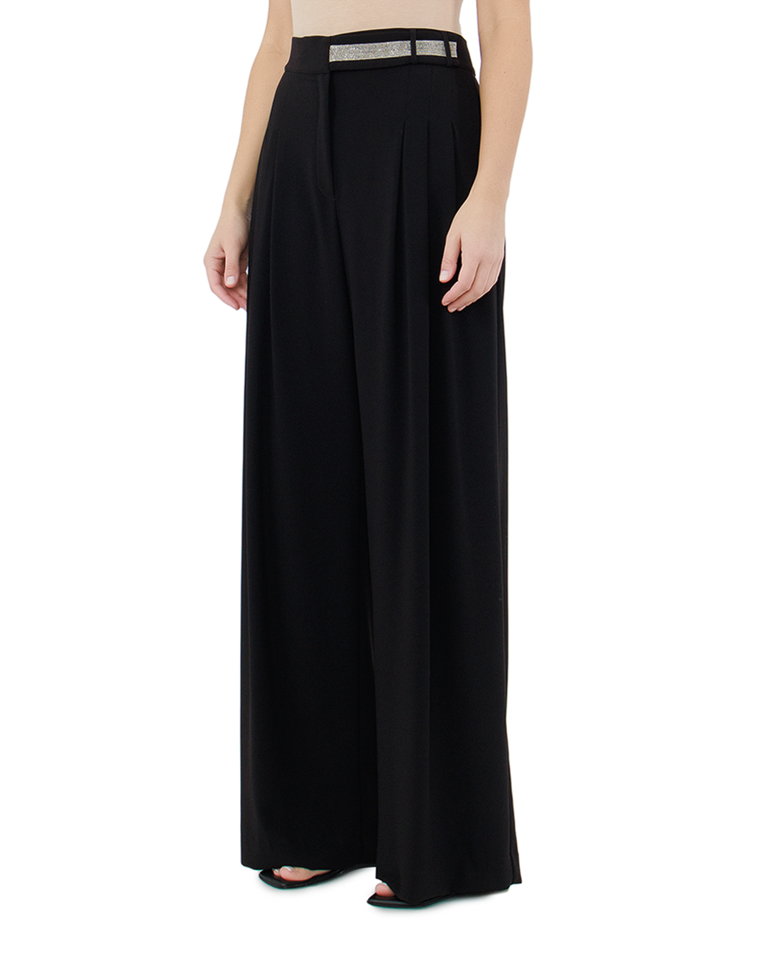 Эти брюки от D.EXTERIOR воплощают сдержанную элегантность с ноткой роскоши, добавляемой благодаря отделке металлической нитью на поясе. Модель выполнена из мягкой и струящейся ткани, которая создаёт изысканный силуэт и обеспечивает свободу движений. Чёрный цвет вносит классическую универсальность, позволяя брюкам стать основой для разнообразных образов. Пояс, украшенный металлической нитью, добавляет стильный акцент и привлекает внимание благодаря блеску и текстурному контрасту. Свободный силуэт с легкой драпировкой подчёркивает женственность, а крупные складки визуально удлиняют ноги, создавая утончённый образ. Эти брюки превосходно подойдут как для вечерних выходов, так и для утончённых деловых встреч, внося в ансамбль изысканность и авторский стиль.