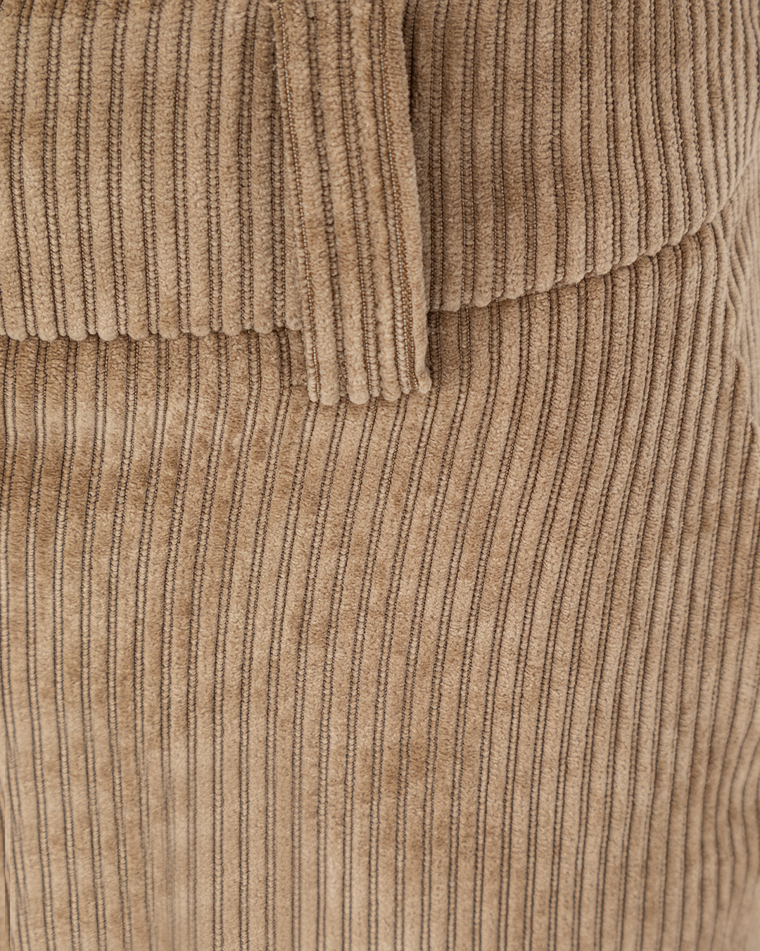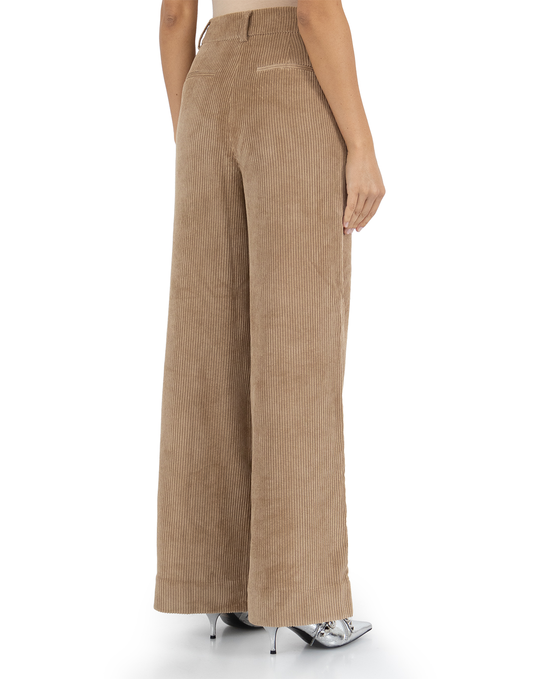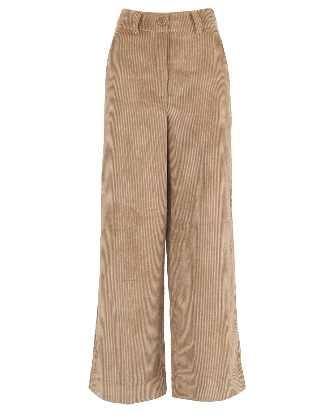 Эти брюки изготовленны из мягкой вельветовой ткани, модель имеет высокую талию и удобный широкий крой. Они дополнены двумя прорезными карманами сзади, косыми передними карманами и застежкой на молнию и пуговицу спереди.