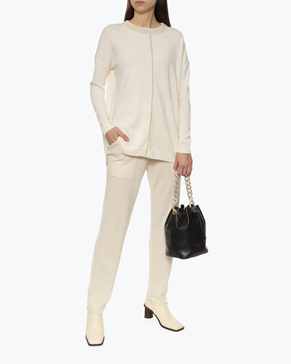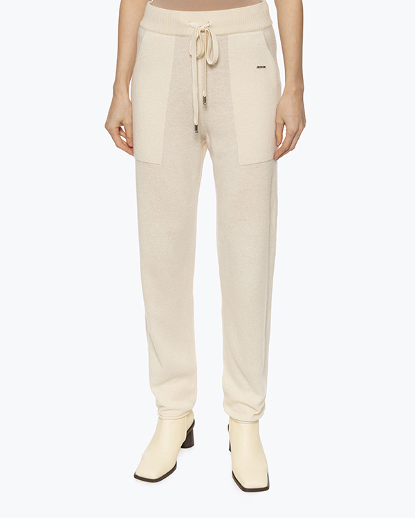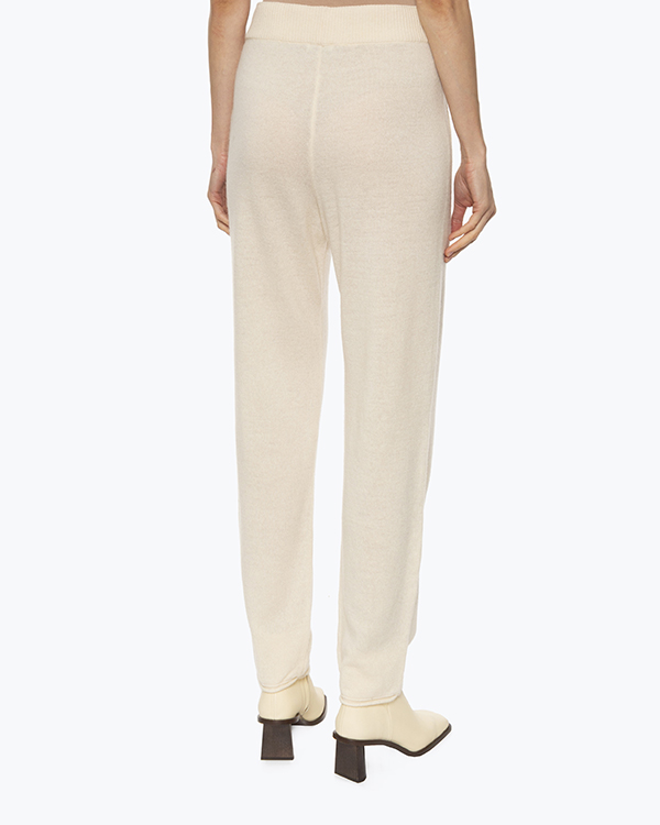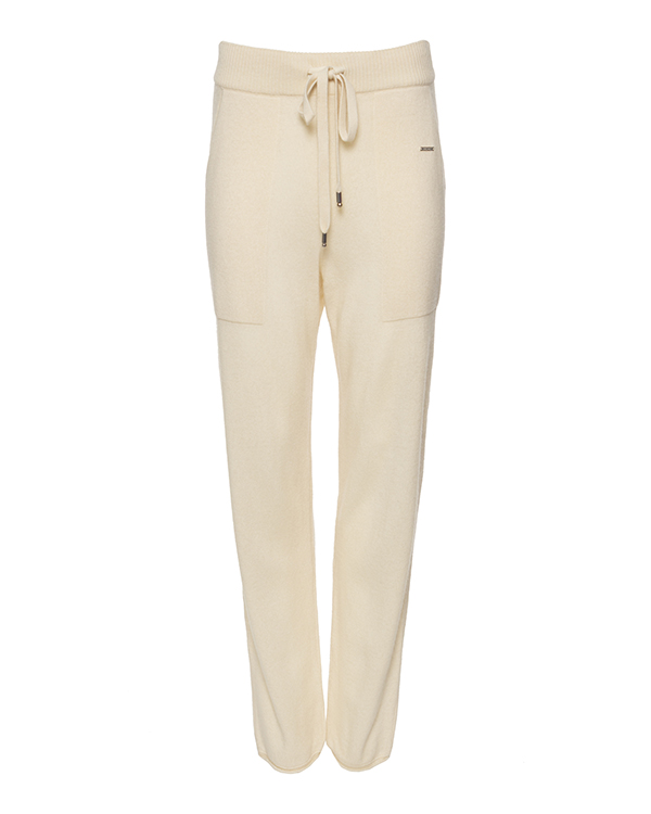 Брюки из нежного вязаного кашемира молочного оттенка. Эластичное изделие прямого силуэта с широкой линией пояса с завязками.
