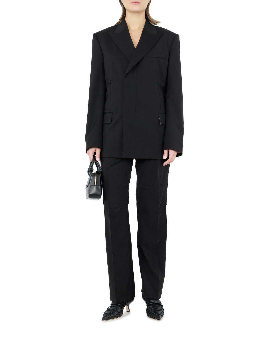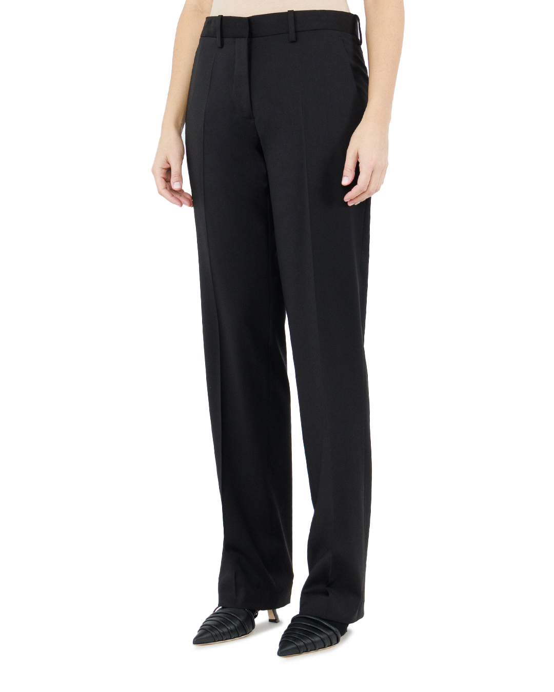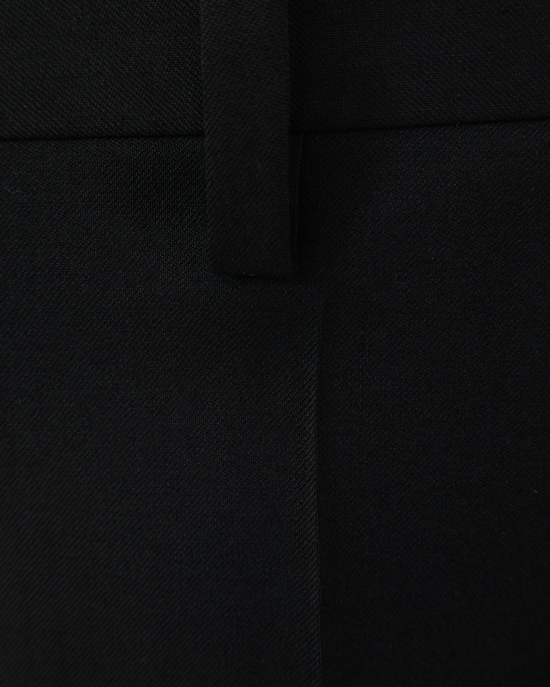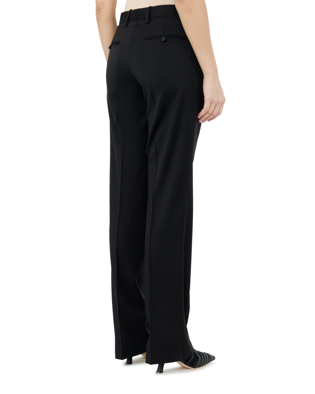 Прямые брюки из вирджинской шерсти, два вшитых кармана по бокам, два прорезных кармана на пуговицах сзади, потайная застежка спереди