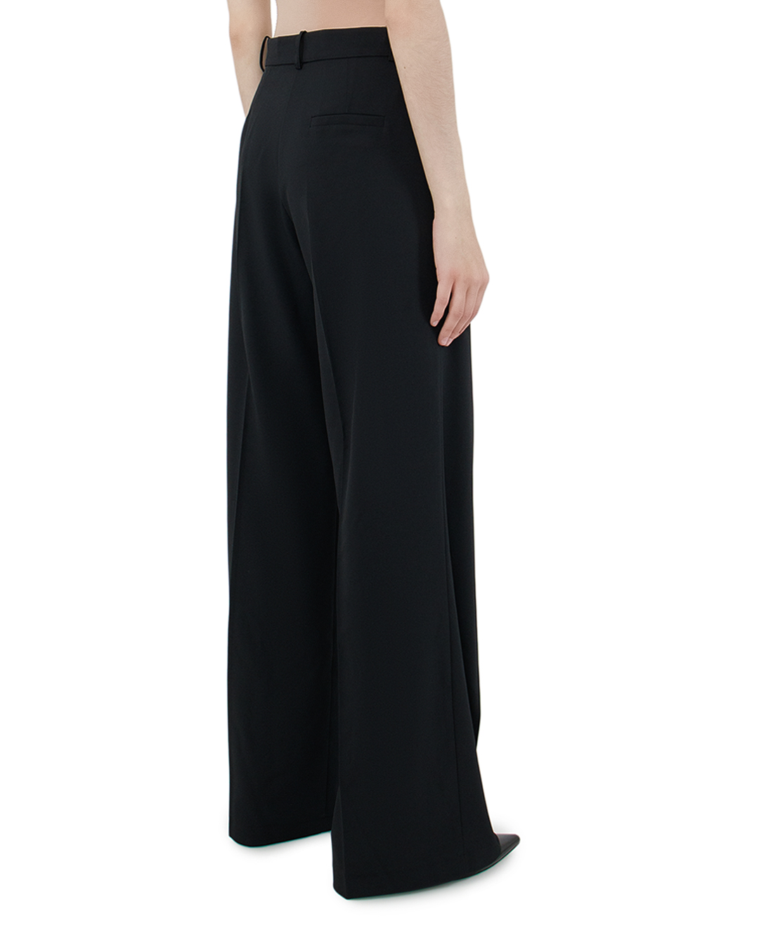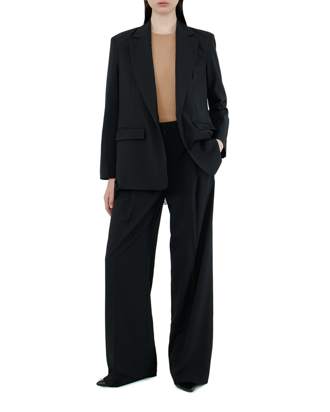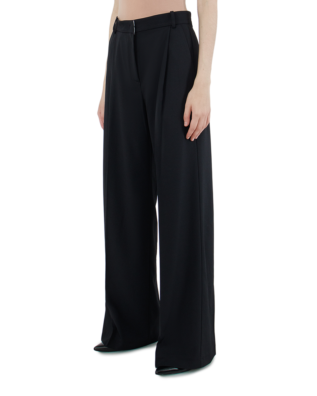 Эти брюки — олицетворение сдержанной элегантности и современной классики. Глубокий черный тон и изысканная драпировка подчеркивают их универсальность и стиль, делая их идеальной деталью гардероба для любого случая. Высокая талия и широкий силуэт обеспечивают гармоничное удлинение фигуры, создавая эффект грациозности и легкости. Брюки дополнены выразительными складками спереди, которые добавляют объем и динамику в силуэт, сохраняя при этом строгость линий. Качественная отделка включает в себя тщательно обработанные швы и слегка расширенные брючины, что позволяет собрать небольшие сборки у щиколотки, придавая образу современную нотку. Традиционная застежка на молнию и металлическую пуговицу добавляет изделию классический штрих. Эти брюки оснащены изысканными шлёвками для ремня, что позволяет адаптировать аксессуары под ваш стиль. Они великолепно гармонируют с блузами и жакетами, акцентируя внимание на безупречном вкусе и уверенности своего обладателя.