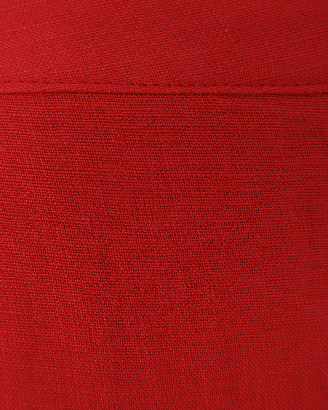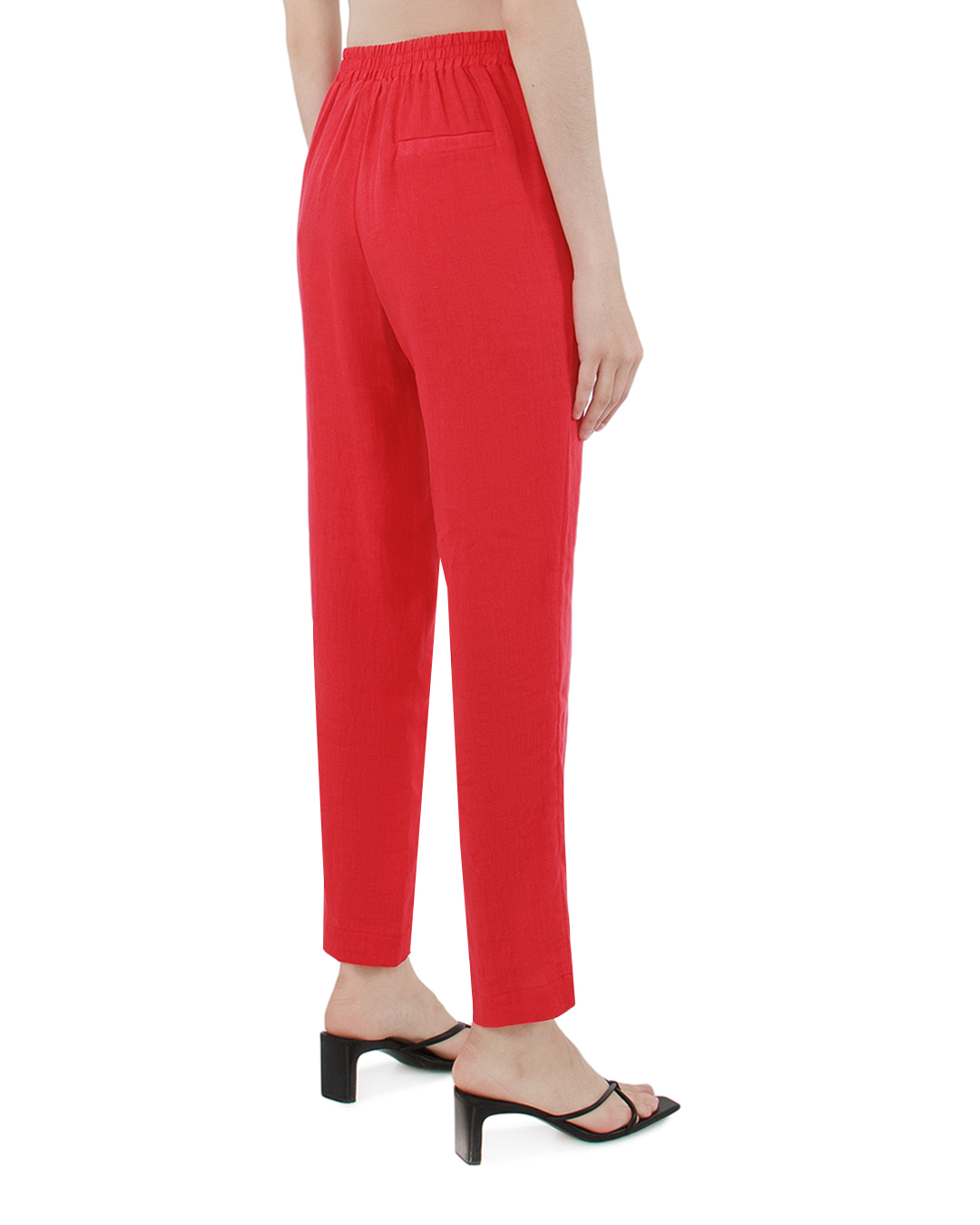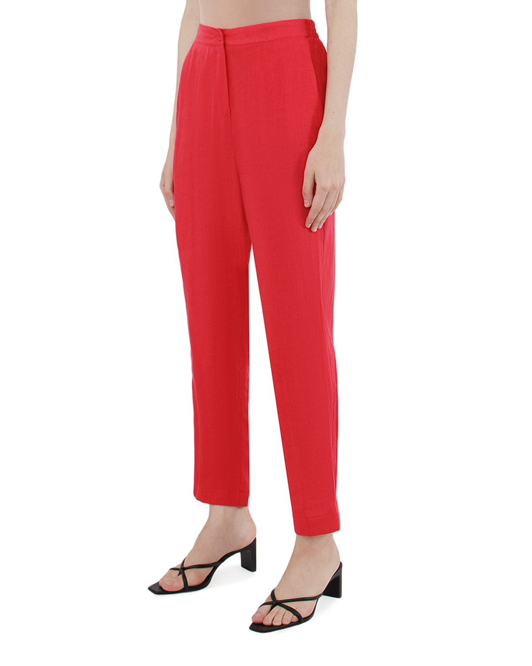 Эти брюки воплощают собой элегантность и современный минимализм. Выполненные из гладкой красной ткани, они подчеркивают строгость и утонченность стиля. Средняя посадка и прямой крой создают универсальный силуэт, подходящий как для деловых, так и для повседневных образов. Передняя застежка на пуговицу и молнию придает изделию классическое очарование, обеспечивая удобство и функциональность. Брюки дополнены аккуратными боковыми карманами, что добавляет практичности без нарушения чистоты линии. Особое внимание уделено вытачкам и швам, которые искусно моделируют фигуру и обеспечивают идеальную посадку. Плавные линии и минималистичная отделка делают изделие универсальным базовым элементом гардероба. Эти брюки прекрасно сочетаются с элегантными блузами и жакетами, подчеркивая утонченность и стиль их обладателя. Они станут незаменимым элементом для создания разнообразных и гармоничных образов.