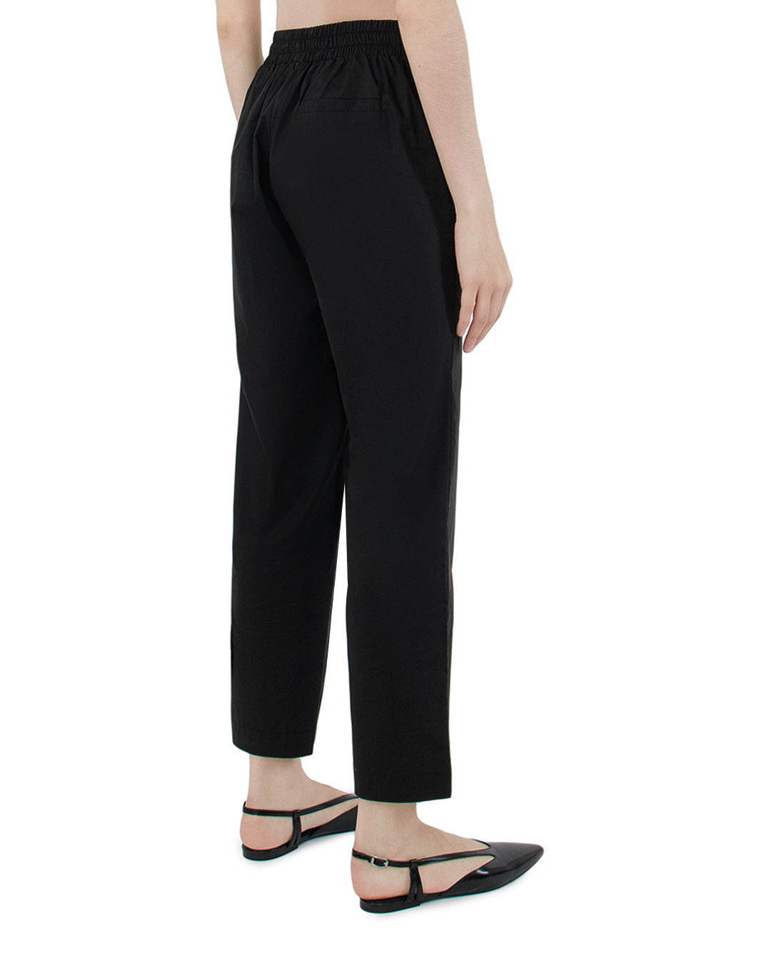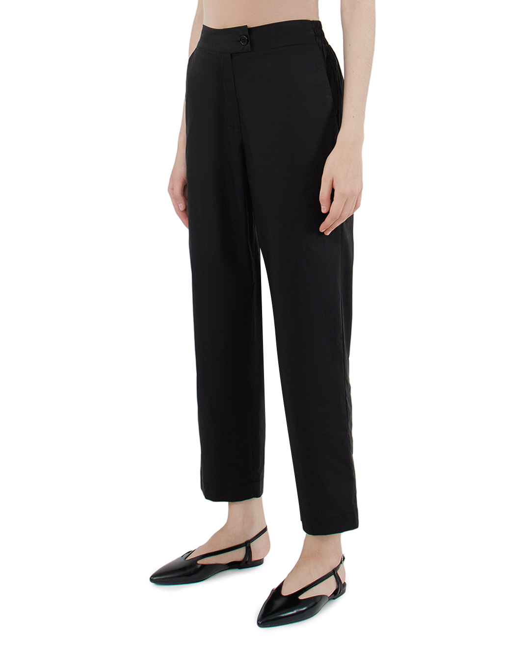 Эти брюки воплощают собой элегантность и современный минимализм. Выполненные из гладкой черной ткани, они подчеркивают строгость и утонченность стиля. Средняя посадка и прямой крой создают универсальный силуэт, подходящий как для деловых, так и для повседневных образов. Передняя застежка на пуговицу и молнию придает изделию классическое очарование, обеспечивая удобство и функциональность. Брюки дополнены аккуратными боковыми карманами, что добавляет практичности без нарушения чистоты линии. Особое внимание уделено вытачкам и швам, которые искусно моделируют фигуру и обеспечивают идеальную посадку. Плавные линии и минималистичная отделка делают изделие универсальным базовым элементом гардероба. Эти брюки прекрасно сочетаются с элегантными блузами и жакетами, подчеркивая утонченность и стиль их обладателя. Они станут незаменимым элементом для создания разнообразных и гармоничных образов.