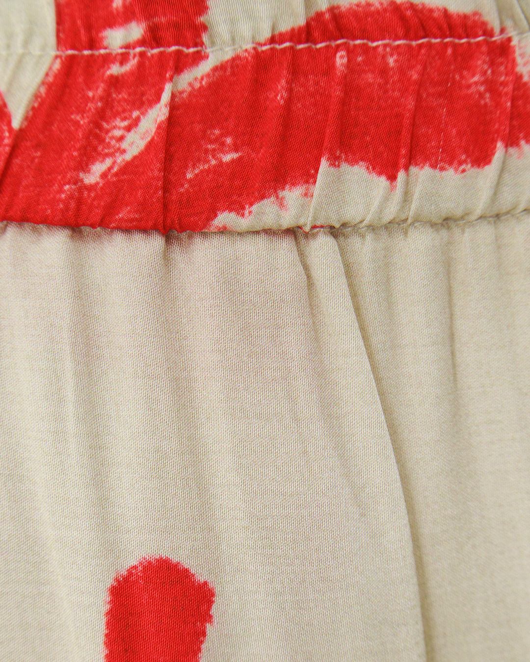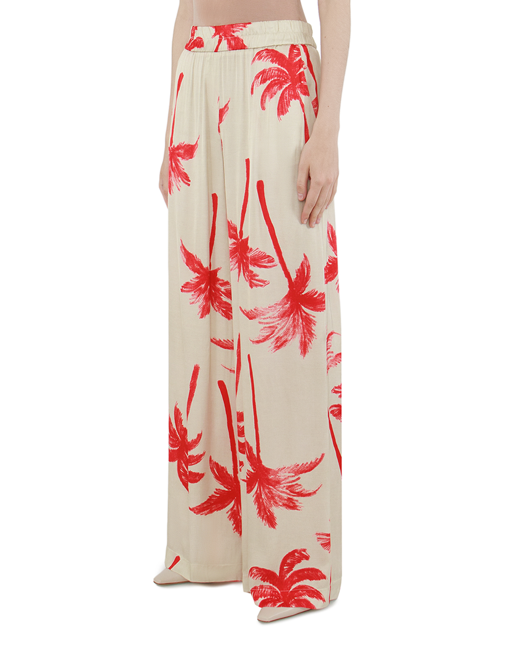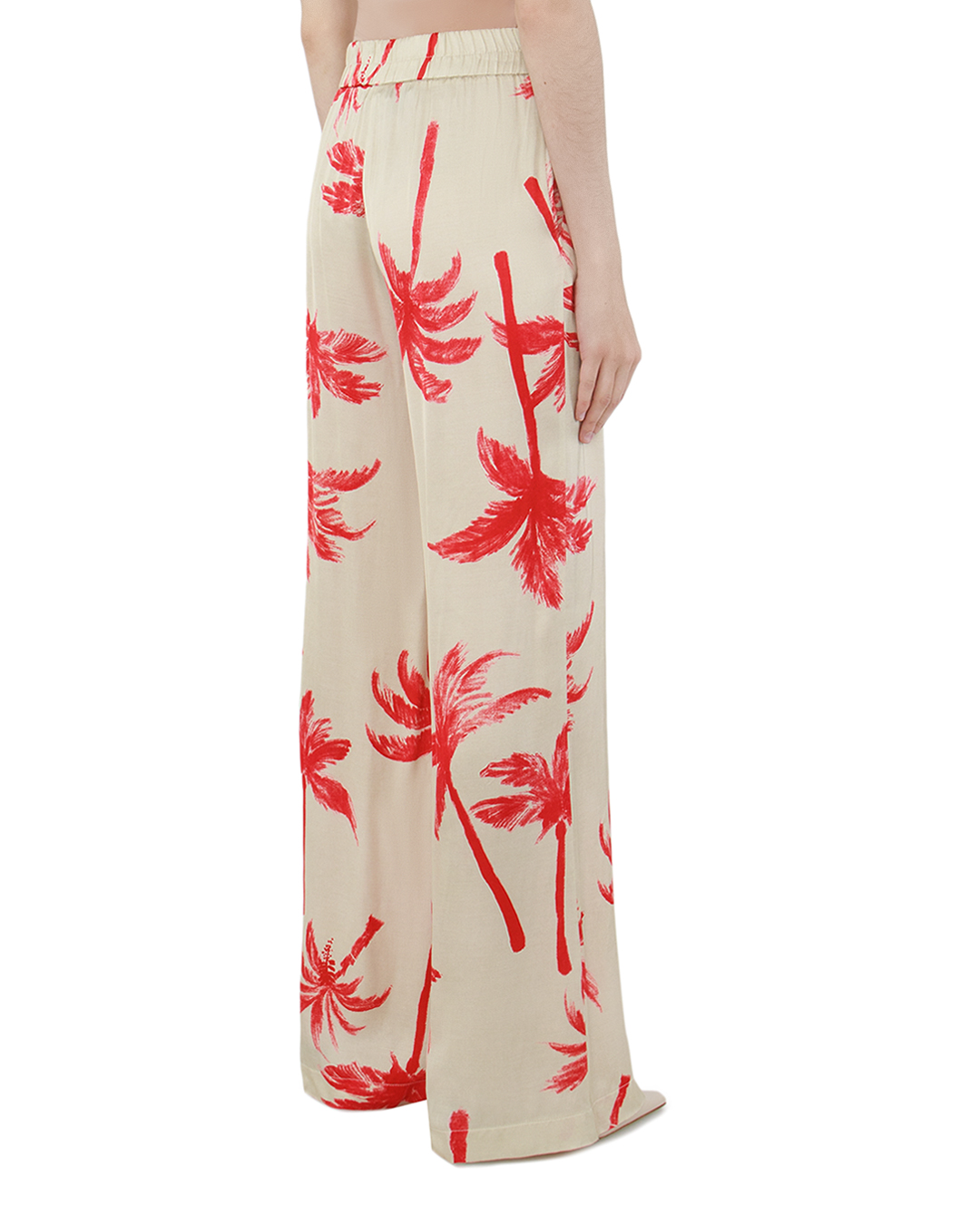 Эти брюки излучают атмосферу летнего дня благодаря своему яркому и свежему дизайну. Выполненные из легкой и дышащей ткани, они украшены выразительным принтом с пальмами в насыщенном красном оттенке на нежном кремовом фоне. Такой принт вносит динамику и уникальный характер в образ, идеально подходя для теплого сезона. Высокая посадка и широкий крой создают струящийся силуэт, который визуально удлиняет ноги и придает фигуре грациозность. Резинка на поясе обеспечивает комфорт и идеально подходит для создания расслабленного, но стильного образа. Отсутствие лишних деталей фокусирует внимание на принте, делая его центральным элементом. Свободные штанины позволяют коже дышать, обеспечивая максимальный комфорт в жаркие дни. Эти брюки будут великолепно смотреться в сочетании с однотонными топами и минималистичными аксессуарами, подчеркивая их выразительность и создавая гармоничные летние образы.