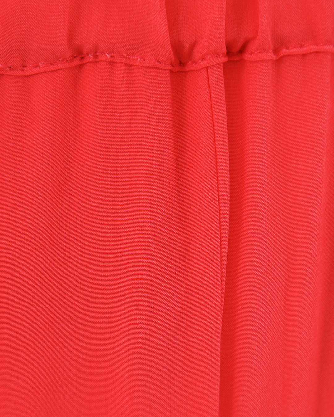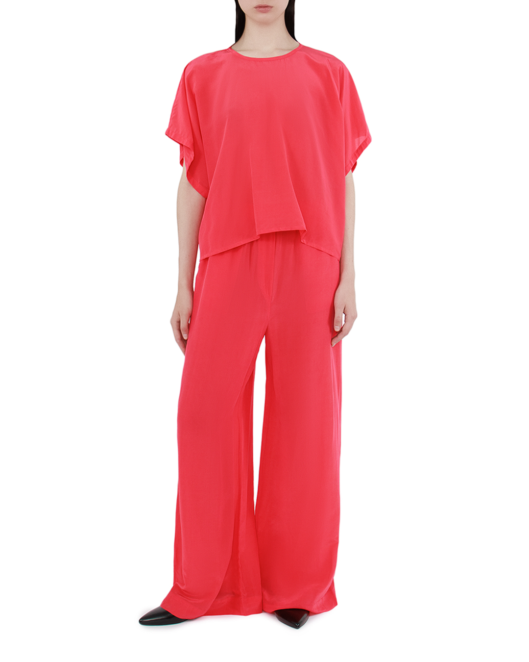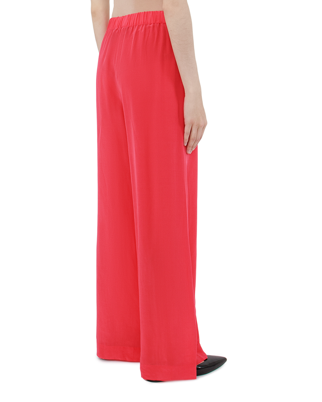 Эти брюки — настоящий символ яркости и уверенности. Богатый коралловый оттенок мгновенно привлекает внимание и создает настроение свежести и жизнерадостности. Изготовленные из легкой и струящейся ткани, они дарят ощущение невесомости и свободы. Высокая талия и свободный фасон с широкими штанинами подчеркивают утонченность образа, визуально удлиняя силуэт. Эластичный пояс обеспечивает удобную посадку и адаптируется под особенности фигуры, делая изделие практичным и комфортным. Безупречная отделка и плавные швы усиливают эксклюзивность дизайна. Брюки дополнены скрытыми боковыми карманами, которые сохраняют их лаконичный внешний вид, добавляя при этом функциональность. Идеальные для создания смелых и стильных образов, эти брюки комбинируются с уникальными блузами и аксессуарами, позволяя экспрессивно выразить индивидуальный стиль и обновить гардероб яркими акцентами.