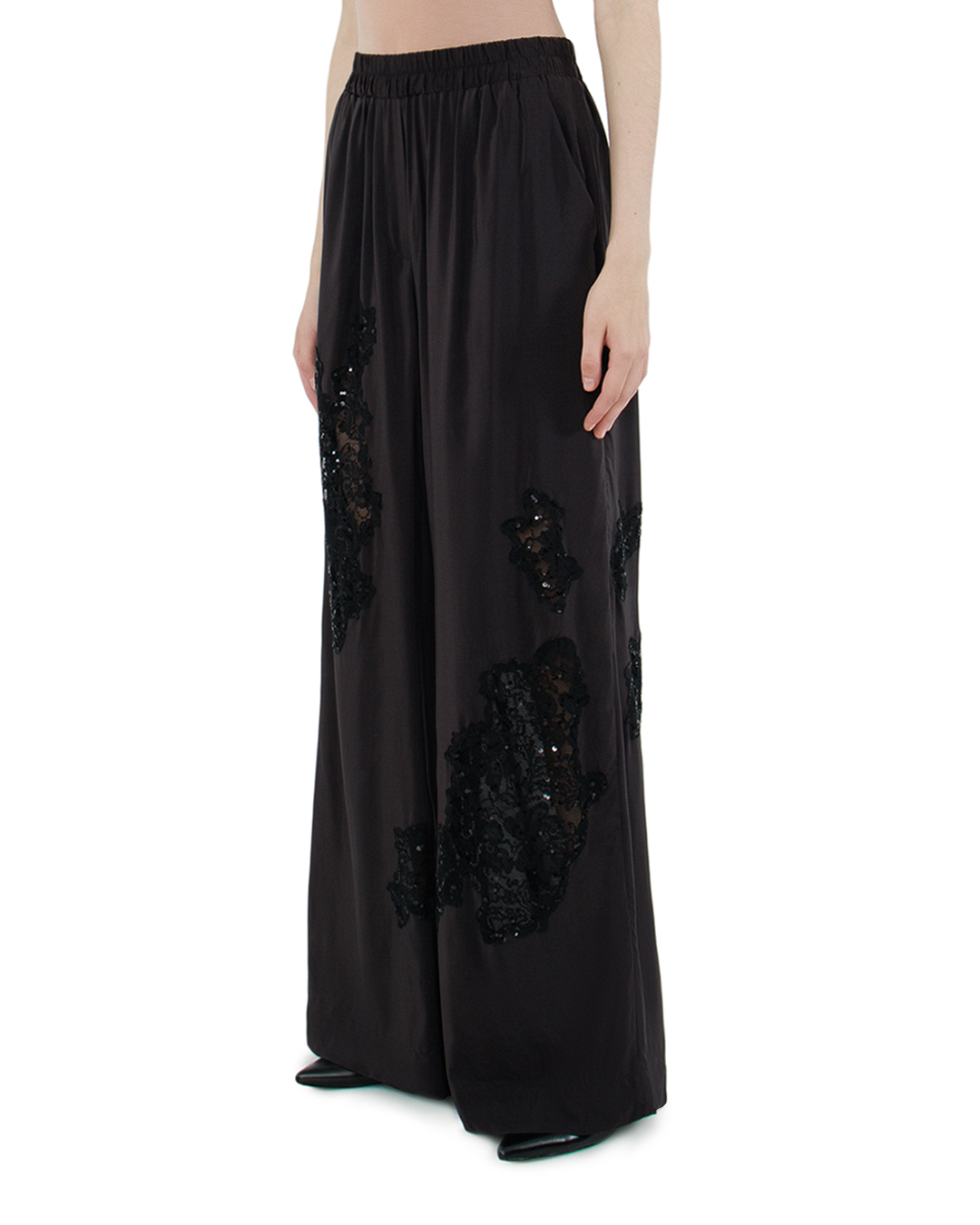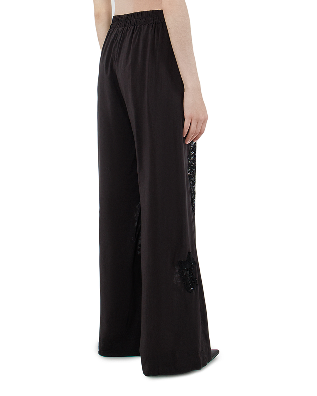 Эти брюки — истинное воплощение вечерней изысканности и авангардного стиля. Выполненные в элегантном черном цвете, они привлекают внимание своим роскошным дизайном. Широкий крой и струящаяся ткань подчеркивают легкость и грацию движений, создавая эффект непринужденности и свободы. Особое внимание заслуживают аппликации из кружева с пайетками, которые асимметрично расположены по брючинам. Эти детали добавляют текстурности и праздничного блеска, создавая объемные акценты и игру света на поверхности ткани. Эластичный пояс обеспечивает комфортную посадку и адаптируется к любому типу фигуры, что делает эти брюки универсальными и удобными. Безусловная эстетика и внимание к деталям подчеркивают высокое качество исполнения. Созданные для тех, кто не боится выделяться, эти брюки идеально подойдут для вечернего выхода или особенного мероприятия. Они будут великолепно сочетаться с лаконичным верхом, позволяя кружевным деталям стать главным акцентом образа.
