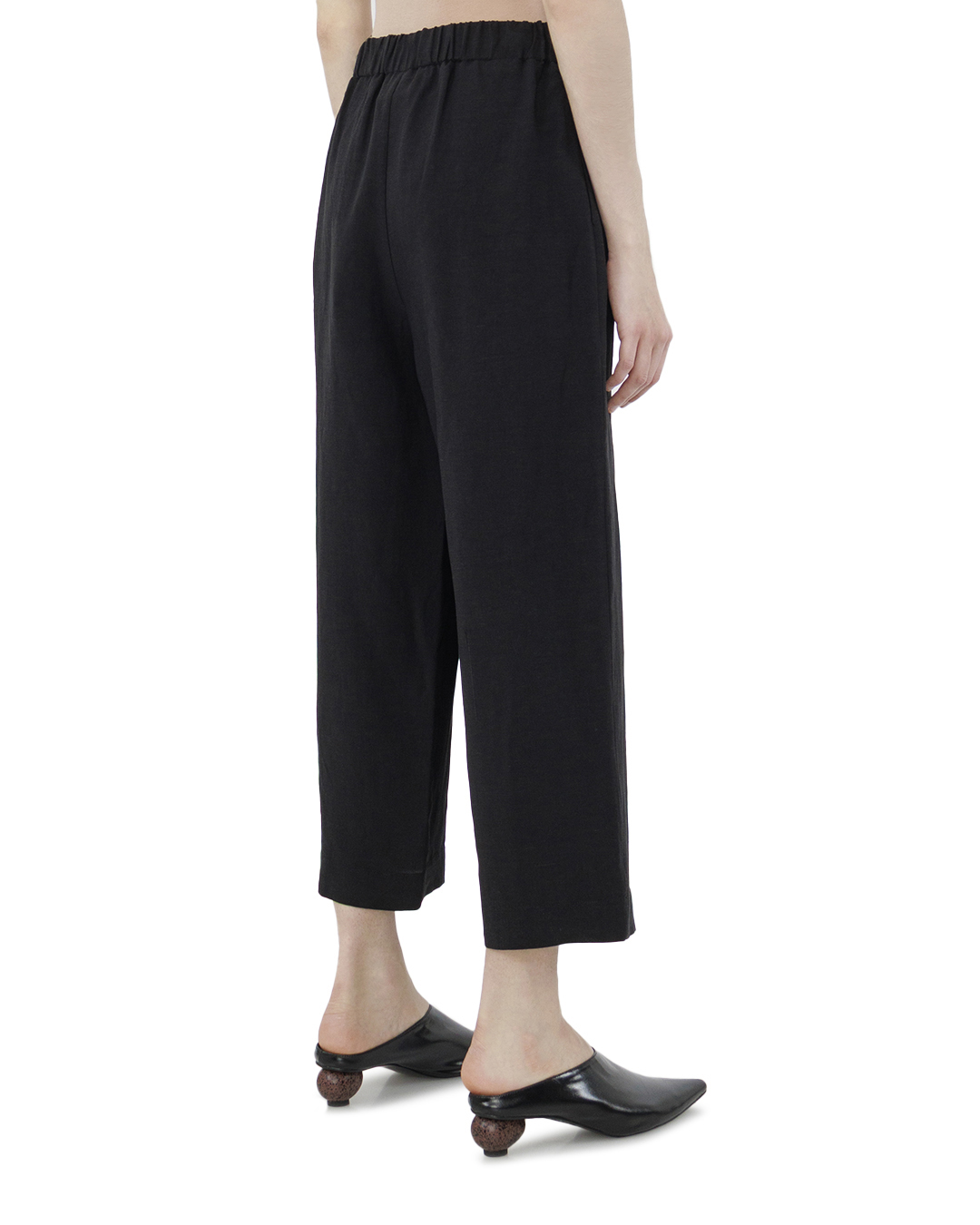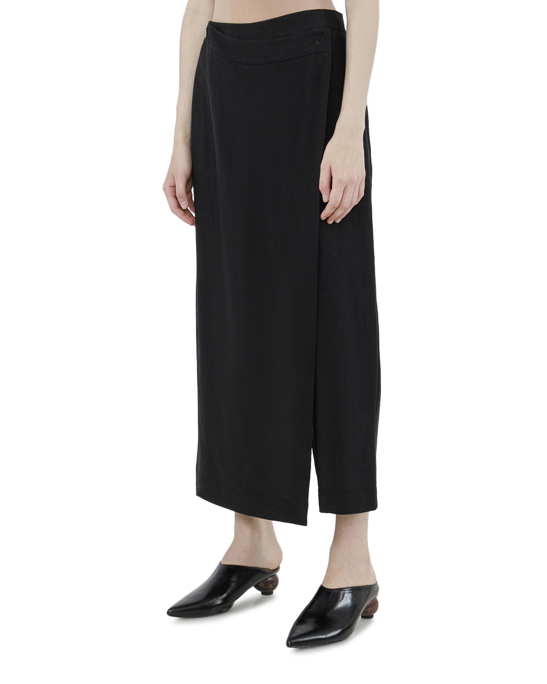 Эти белоснежные брюки олицетворяют собой утонченную легкость и современную элегантность. Сшитые из мягкой, дышащей ткани, они предлагают воздушный силуэт, идеально подходящий для теплых дней. Широкие штанины создают эффект легкого драпирования, добавляя динамики и непринужденности в общий образ. Высокая посадка акцентирует линию талии, подчеркивая женственность и изящность фигуры. Особое внимание привлекает элегантная складка, плавно переходящая из пояса вниз по ноге, создавая иллюзию запаха и придавая модели оригинальность и стиль. Черный цвет, символизирующий универсальность, делает эти брюки базовым элементом гардероба, который легко комбинируется с разными топами и аксессуарами. Эти брюки — идеальный выбор для создания легкого и изысканного образа, где комфорт и стиль стоят на первом месте.