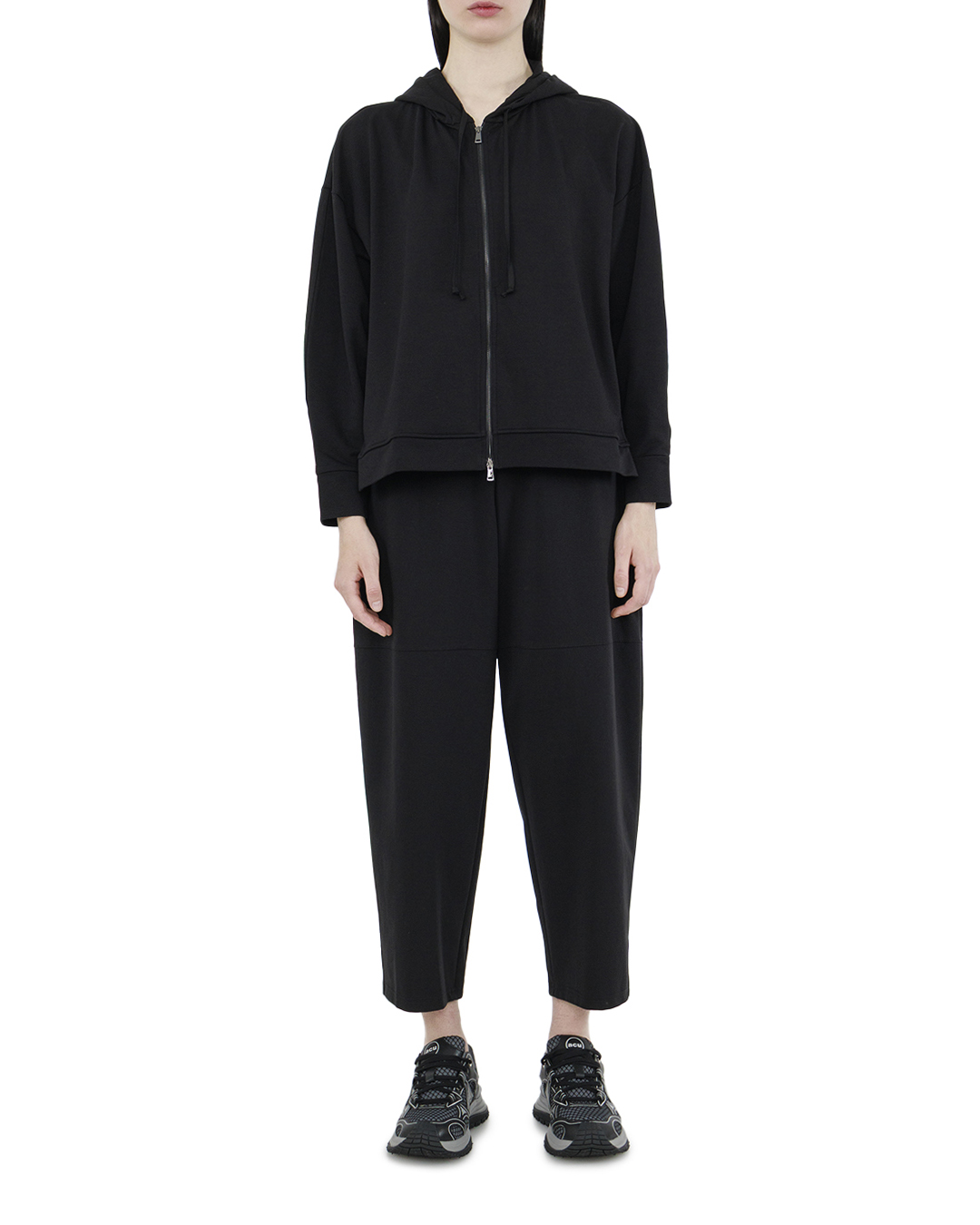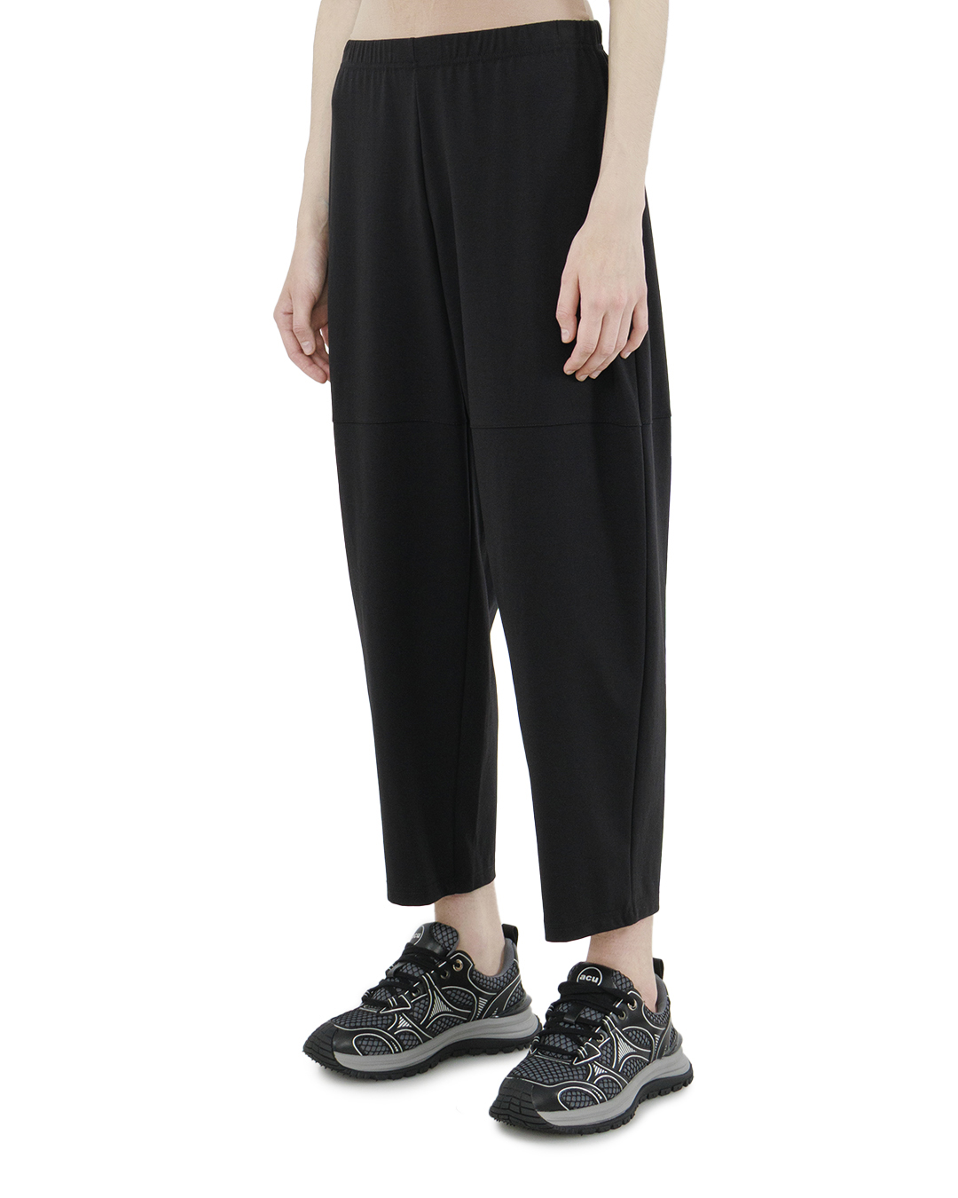 Эти стильные брюки сочетает в себе современный комфорт и минималистичную элегантность. Созданные из мягкой, эластичной ткани, они обеспечивают свободу движений и непринужденный стиль, делая их идеальным выбором для активного дня. Эластичный пояс привносит нотку легкости в посадку, адаптируясь под индивидуальные особенности фигуры и обеспечивая удобство. На штанинах заметны горизонтальные декоративные швы, которые добавляют интерес и визуальную структуру, делая образ более динамичным и многослойным. Слегка укороченная длина брюк подчеркивает современность модели, позволяя играть с выбором обуви, будь то кроссовки для кэжуал образа или обувь на каблуке для более элегантного стиля. Чёрный цвет, выбранный для этой модели, остаётся безупречной основой гардероба, легко сочетающейся с различными цветами и текстурами. Эти брюки — это универсальная основа, которая позволяет создавать разноплановые и стильные образы.