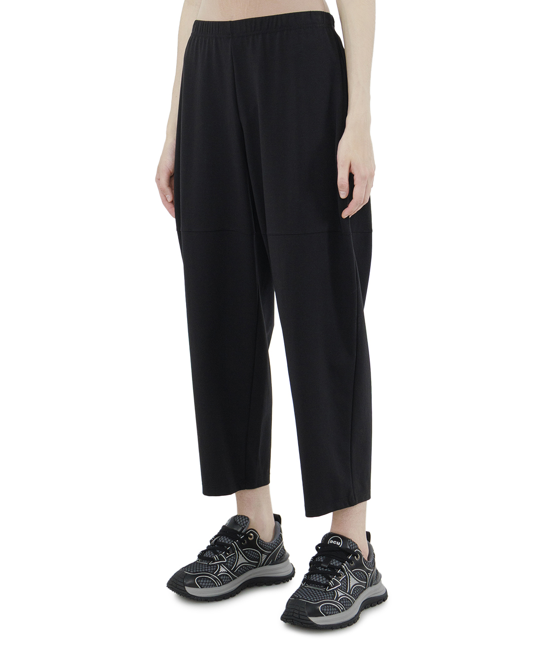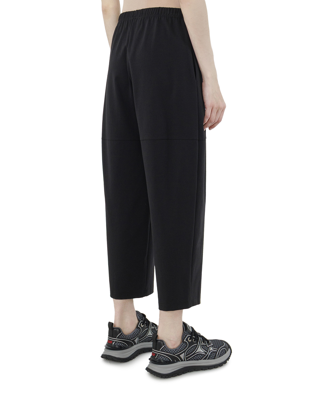 Эти брюки привносят в образ нотку непринужденной изысканности и современного удобства. Изготовленные из мягкой, струящейся ткани, они предлагают свободный, расслабленный силуэт, отлично подходящий для повседневной элегантности. Эластичный пояс позволяет модели идеально подстраиваться под фигуру, обеспечивая комфорт и легкость в носке. Брюки обладают укороченной длиной, что позволяет продемонстрировать стильную обувь и добавить динамичности в образ. Декоративные вертикальные швы на передней части добавляют структурированность и визуально вытягивают силуэт, подчёркивая архитектурные линии дизайна. Черный цвет модели — это воплощение универсальности и утонченности, позволяющий легко сочетать брюки с разнообразными топами и аксессуарами, создавая как кэжуал, так и более элегантные ансамбли. Эти брюки — идеальный выбор для городской жизни, где стиль и удобство идут рука об руку.