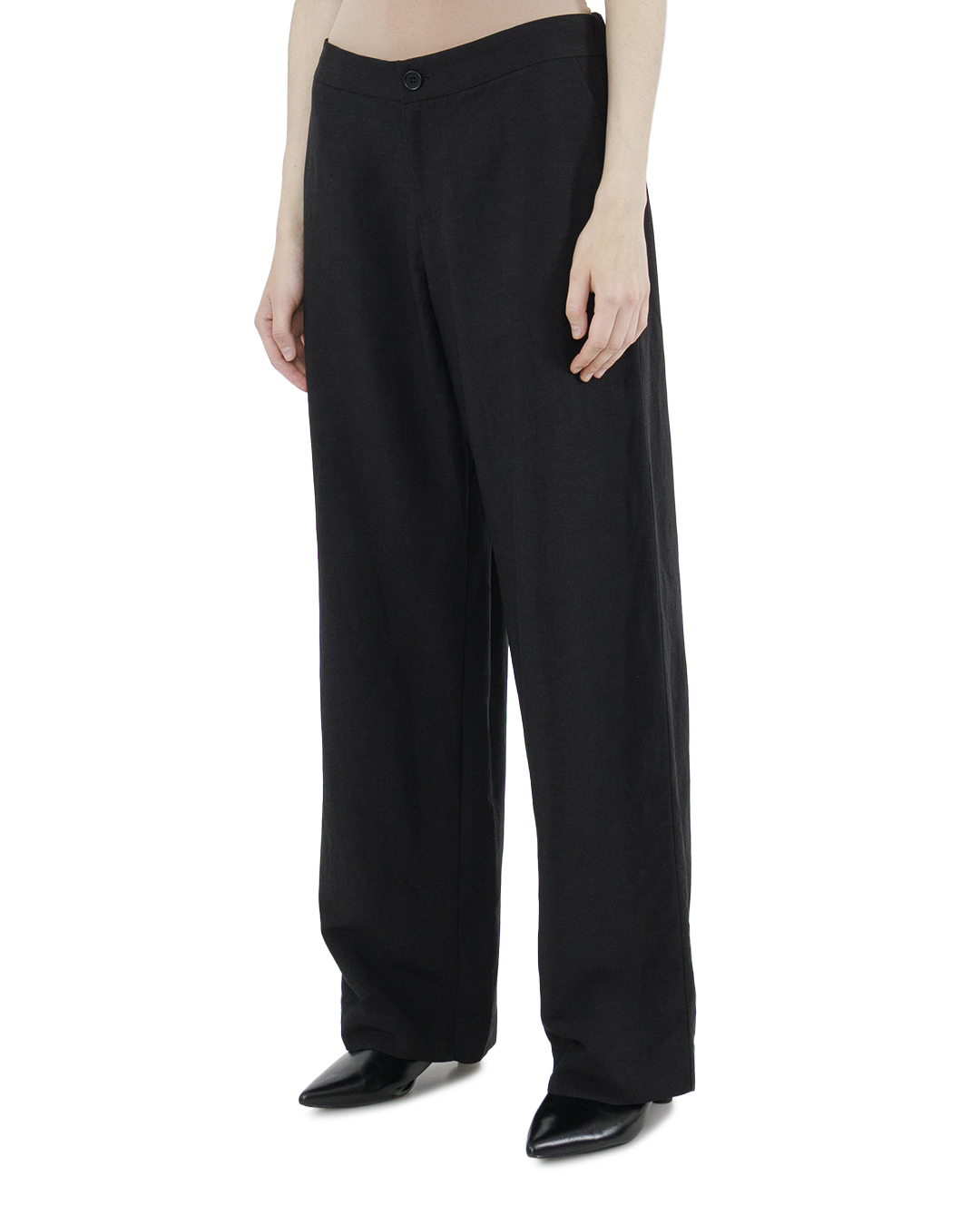 Эти элегантные брюки олицетворяют классический стиль с современным акцентом. Изготовленные из плотной и качественной ткани, они обеспечивают идеальную посадку и структуру, подчеркивая достоинства фигуры. Высокая талия создает утонченный силуэт, а широкие штанины плавно ниспадают, добавляя образу степенность и стильную лёгкость. Этот крой визуально удлиняет ноги и придаёт образу декоративный объем. Деталь отделки в виде аккуратно выполненной застёжки на пуговицу добавляет модели изысканности и служит функциональным элементом, удерживающим форму пояса. Этот минималистичный акцент не отвлекает от основного силуэта, сохраняя чистоту линий и элегантность. Глубокий чёрный цвет придаёт брюкам универсальность, легко сочетаемость с любыми топами и аксессуарами, создавая основу для создания разнообразных образов — от делового до вечернего. Эти брюки — символ утончённого стиля и уверенности.