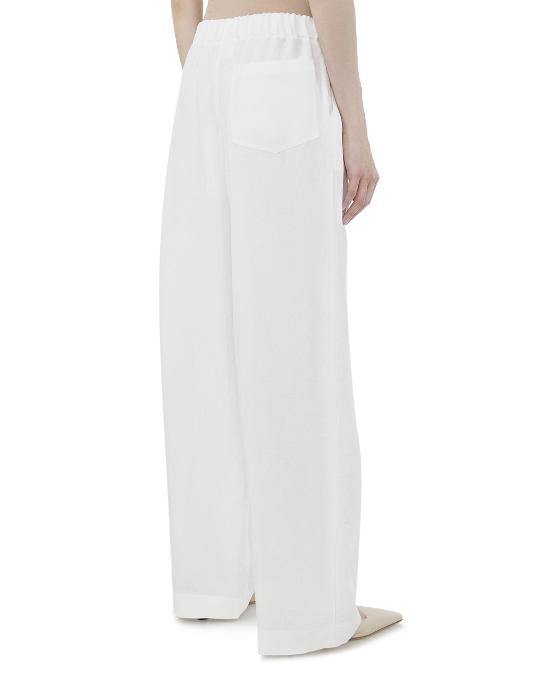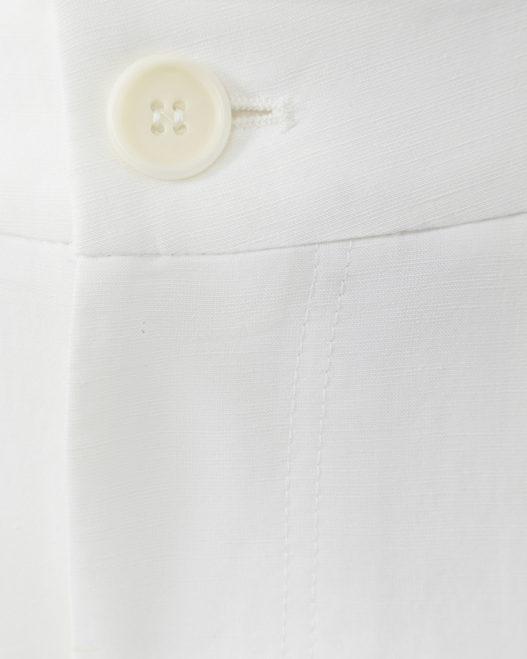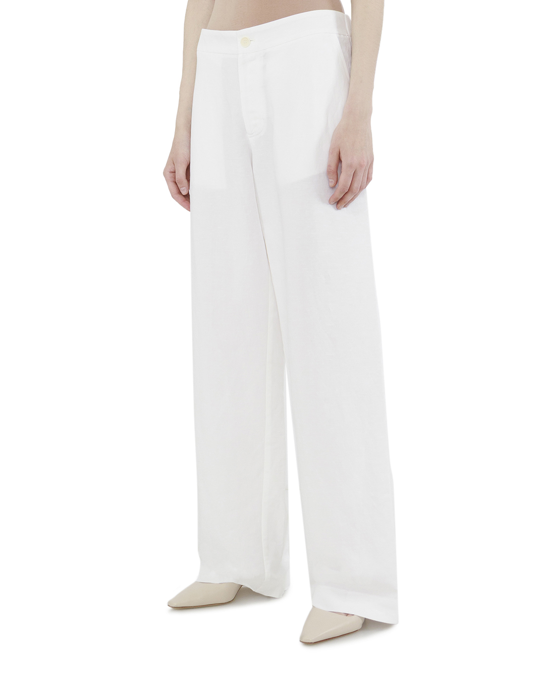 Эти белоснежные брюки представляют собой эталон легкости и элегантности. Изготовленные из дышащего материала, они обеспечивают комфорт даже в самые теплые дни, создавая свободный и летящий силуэт. Высокая посадка и широкий пояс подчеркивают линию талии, создавая изящный контраст с плавно расширяющимися штанинами. Этот крой визуально удлиняет ноги, придавая фигуре стройность и утонченность. Аккуратная застежка на пуговицу и молния скрыты для достижения минималистичного вида, обеспечивая чистоту линий. Такие продуманные детали подчеркивают внимание к деталям и превосходство дизайна. Белый цвет придает брюкам свежесть и универсальность, позволяя легко комбинировать их с различными стилями и цветами. Это идеальный выбор для тех, кто стремится к универсальному гардеробу, где каждый элемент излучает стиль и качество.