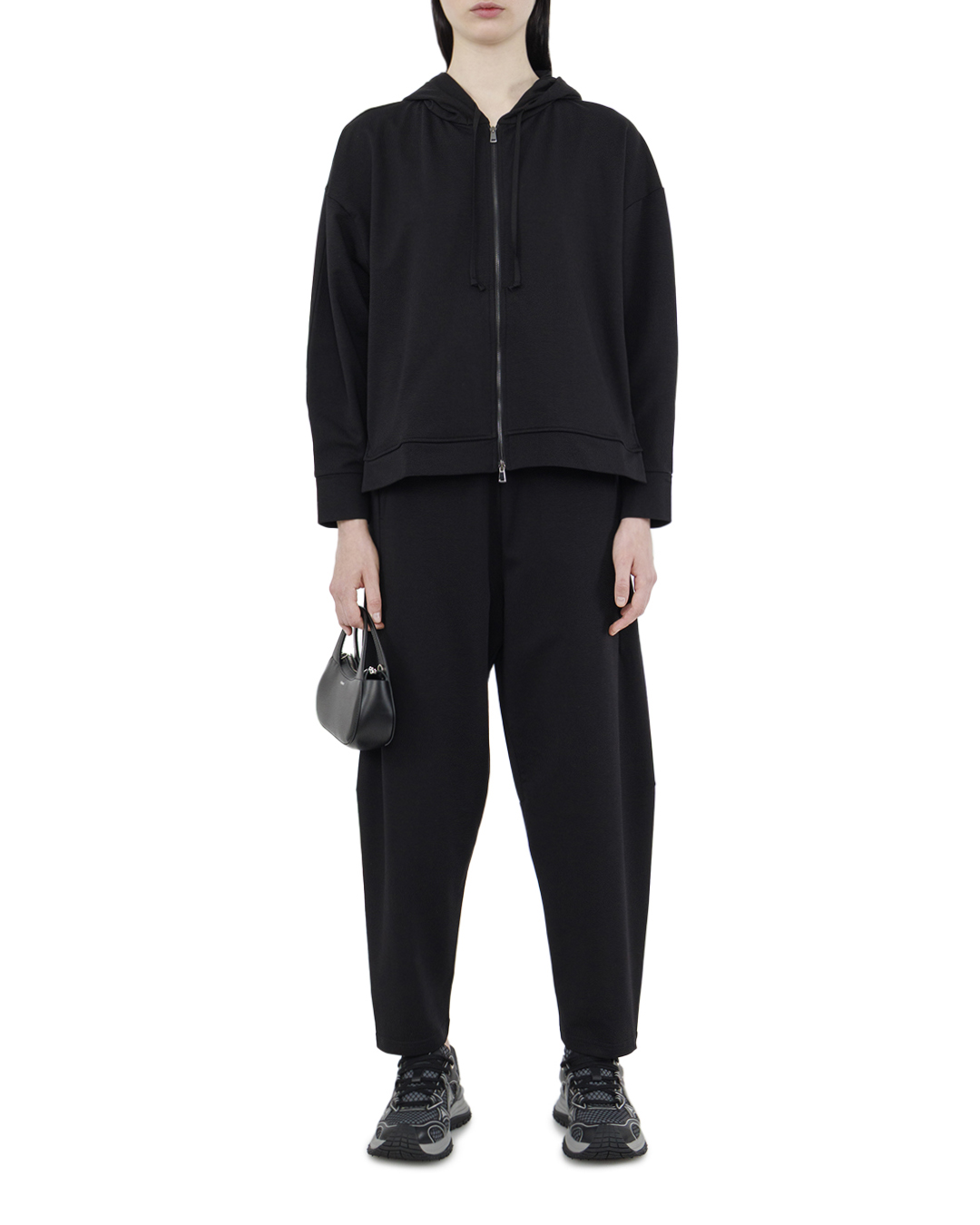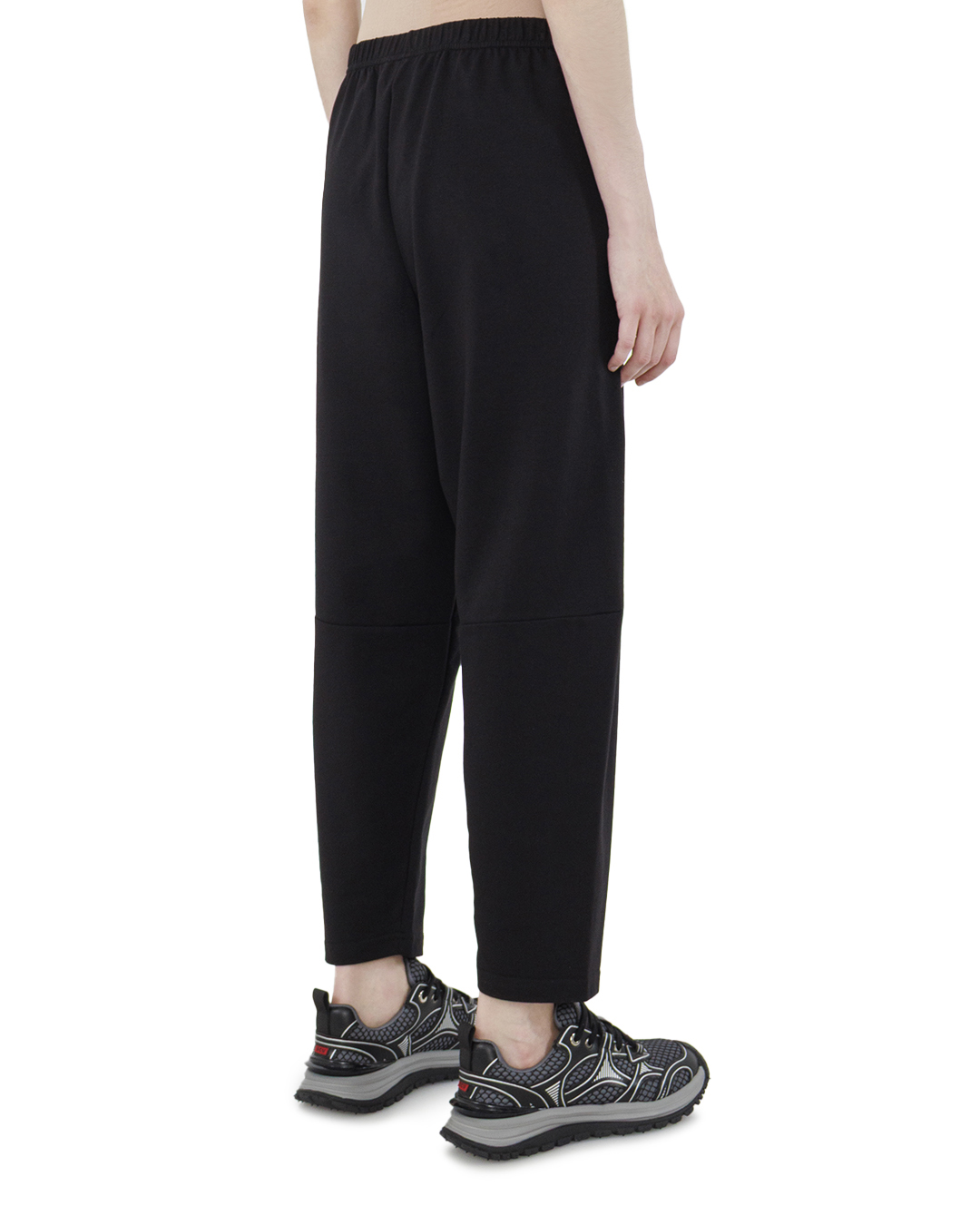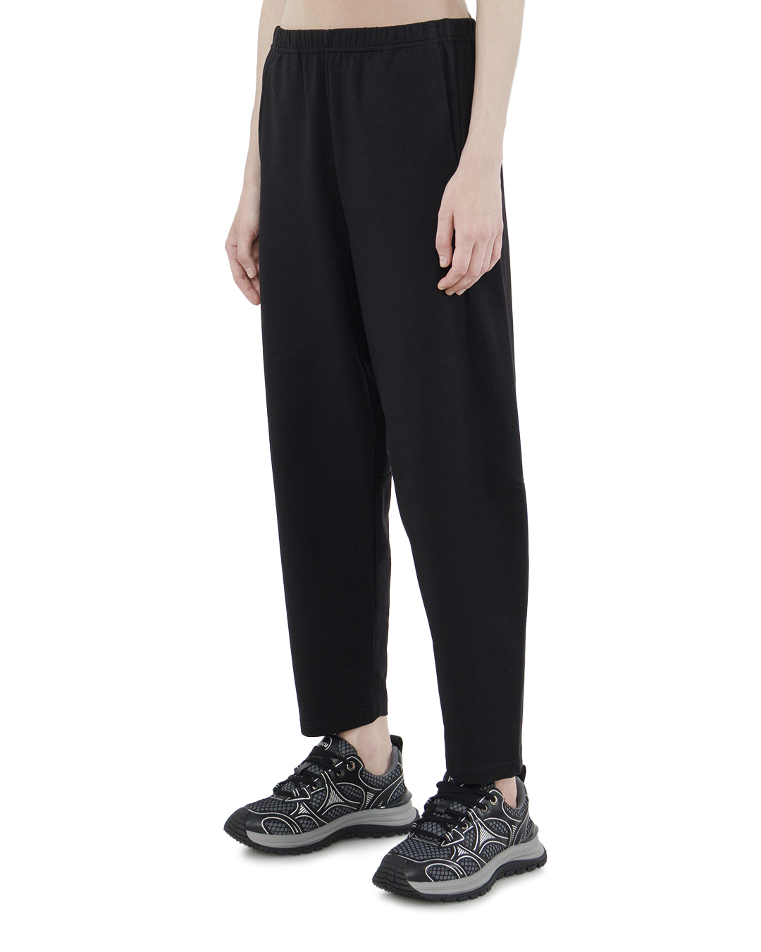 Эти брюки олицетворяют современный минимализм и функциональный стиль. Изготовленные из мягкой и эластичной ткани, они предлагают комфорт и свободу движений, идеально подходя для динамичного образа жизни. Эластичный пояс обеспечивает удобную посадку и легкость при носке, придавая образу непринужденность. Брюки имеют слегка зауженные штанины, что создаёт динамичный и современный силуэт, подчеркивая линию ног. Детали отделки сведены к минимуму, что позволяет сосредоточиться на чистоте линий и универсальности стиля. Черный цвет добавляет модели универсальности и лёгкости в комбинировании с другими элементами гардероба. Эти брюки — отличный выбор для тех, кто ценит стиль без лишних деталей, оставляя возможность для выразительных акцентов в дополнениях и аксессуарах. Идеальные для кэжуал образов, они адаптируются под любые повседневные задачи и события.
