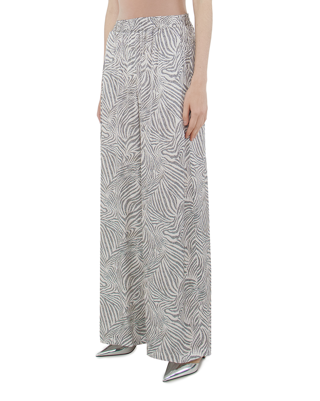 Эти брюки выделяются своим эффектным дизайном благодаря оригинальному узору, напоминающему изысканный животный принт. Они выполнены из лёгкого и струящегося материала, который придаёт ощущение комфорта и свободы. Широкие штанины создают шарм и элегантность, плавно ниспадая до самого пола. Эластичная талия обеспечивает идеальную посадку и комфорт в движении, делая брюки универсальными для различных типов фигуры. Плиссированные детали вдоль талии добавляют текстурный акцент и визуально удлиняют ноги, подчёркивая силуэт. Детали отделки превосходно проработаны: аккуратные швы и качественная текстура ткани. Принт в сдержанной цветовой гамме обеспечивает возможность комбинирования с яркими топами или классическими блузами. Это идеальный выбор для создания выразительных и запоминающихся образов, подчёркивающих индивидуальность обладателя.