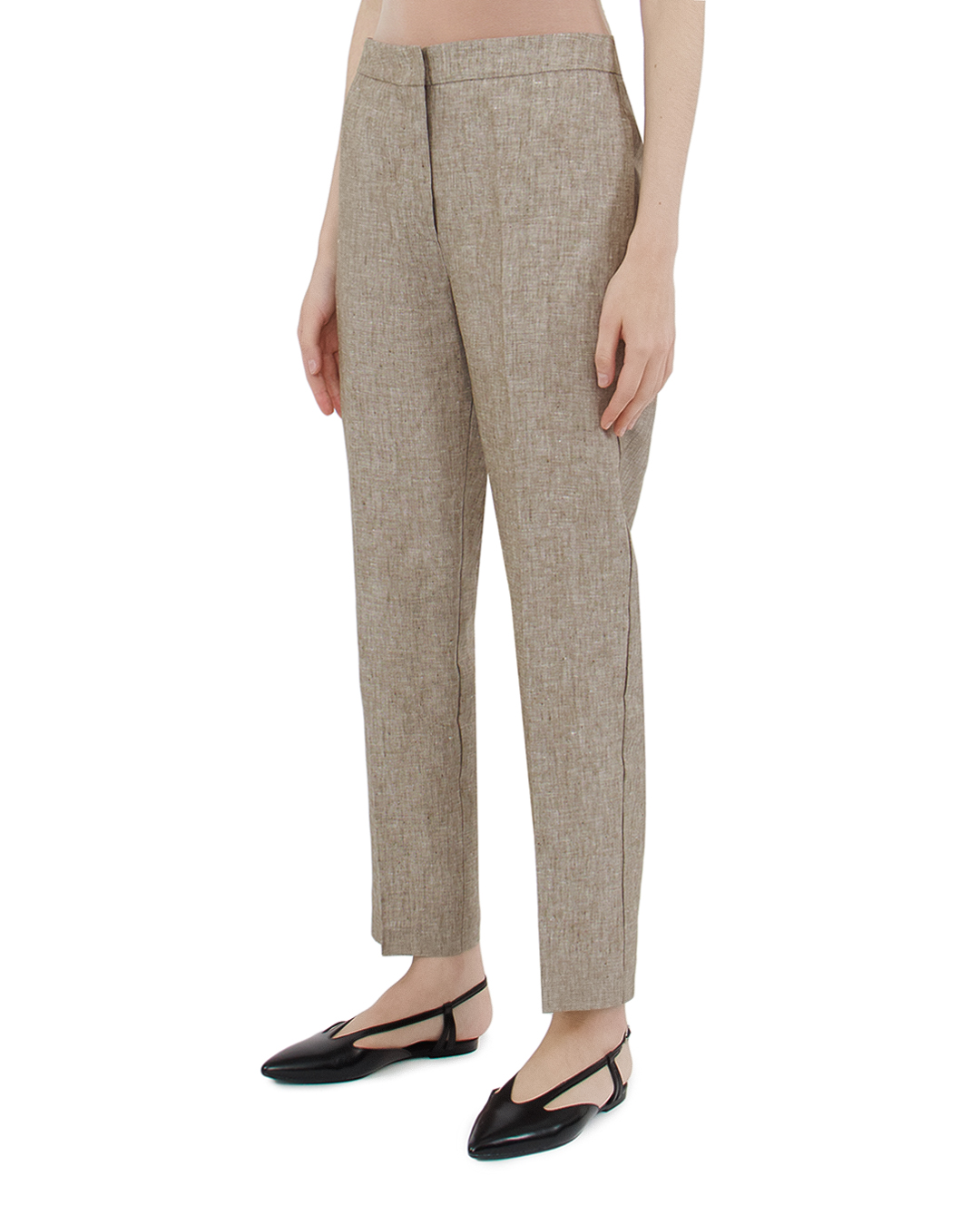 Эти брюки – идеальное сочетание элегантности и минимализма. Изготовленные из лёгкой ткани с текстурой, они представляют собой образец современного офисного стиля. Приталенный крой акцентирует силуэт, обеспечивая изящный и сдержанный вид. Нейтральный бежевый оттенок позволяет легко сочетать их с различными элементами гардероба, добавляя универсальности. Минималистичный пояс и плоский перед создают аккуратный и опрятный вид, идеально подходящий для деловых встреч. Отделка подчёркнута точностью и аккуратностью швов. Скрытая застёжка сохраняет чистоту линии, не отвлекая внимания от общего стиля. Брюки отлично сидят по фигуре благодаря безукоризненно выверенной посадке и мягкому прилеганию к ноге. Это идеальный выбор для тех, кто ценит стиль и комфорт в каждодневной одежде.