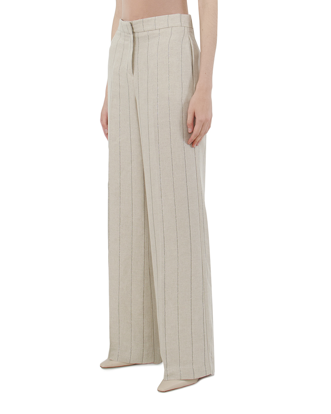 Эти брюки выполнены в элегантном, классическом стиле. Они имеют безупречно подчеркнутую линию талии типом покроя со скрытой застёжкой, что добавляет изделию утончённости. Прямой силуэт брюк изящно сужается по длине, создавая ощущение лёгкости и свободы движения. Ткань бежевого цвета с лёгкой текстурой и вертикальной полоской, что визуально удлиняет силуэт, обеспечивая гармонию пропорций. Тонкие, аккуратные швы подчеркивают высокое качество исполнения. Отдельного внимания заслуживает использование двойного прокладывания строчек вдоль основных швов, что не только усиливает прочность, но и добавляет стильный акцент в общий дизайн. Брюки идеально подойдут для создания как офисного, так и повседневного образа, сочетая в себе современные тенденции и классическую эстетичность.