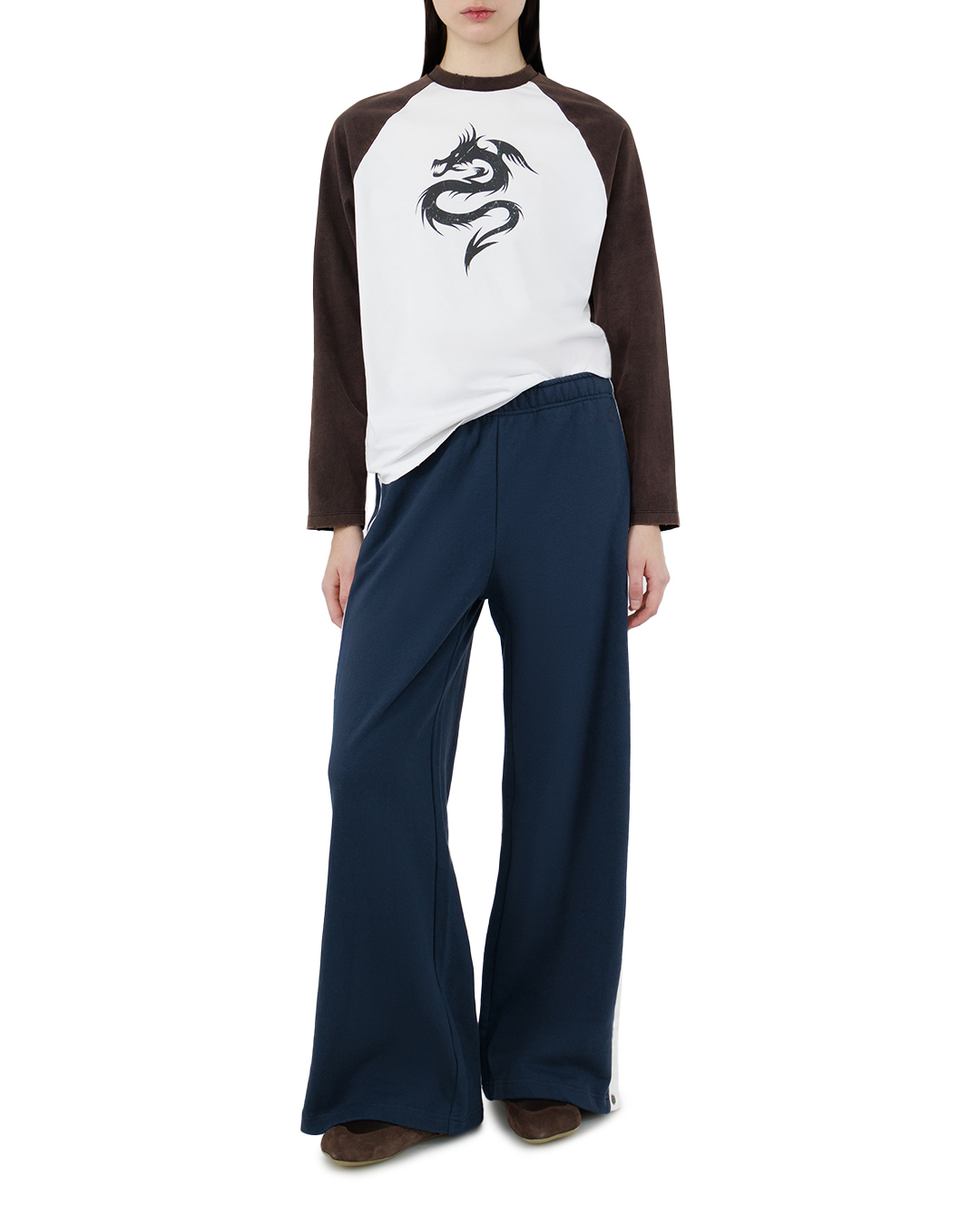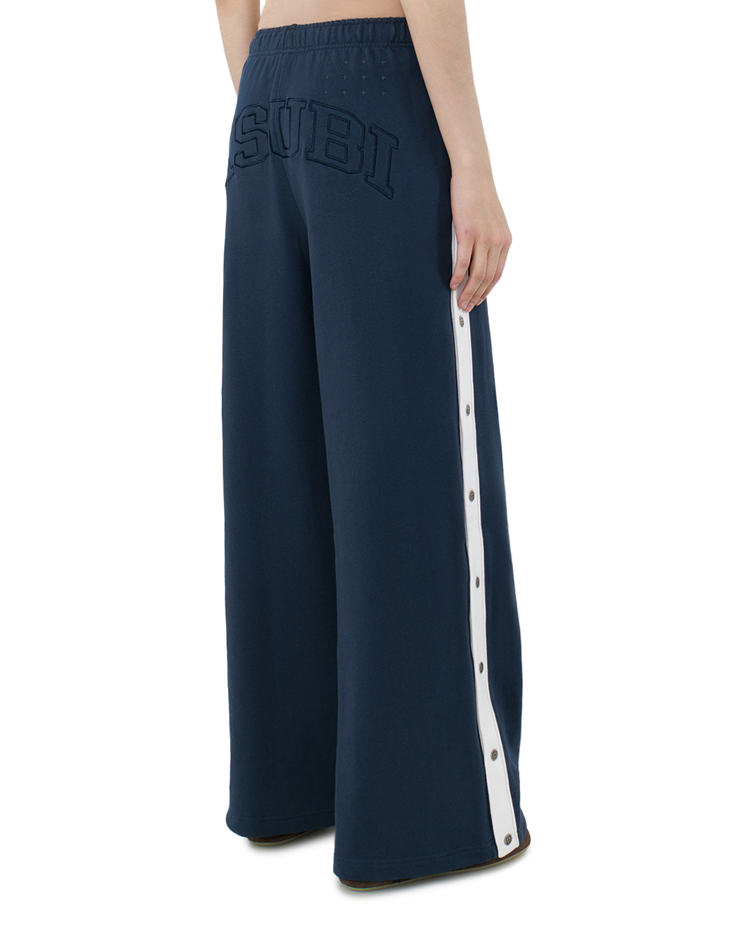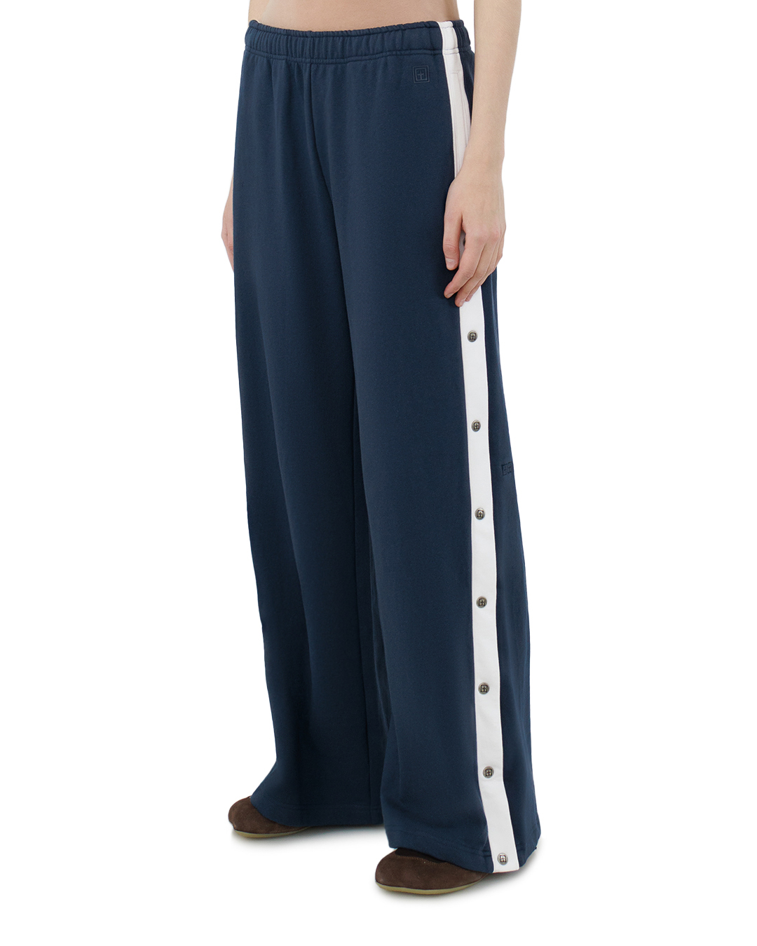 Эти брюки воплощают идеальное сочетание комфорта и модного шика, интегрируя спортивные элементы в повседневный образ. Выполненные из мягкой ткани глубокого синего оттенка, они подчеркивают лёгкость и элегантность движения. Широкий крой брюк обеспечивает свободу и удобство, создавая непринужденный силуэт. Эластичный пояс добавляет комфорта и универсальности, позволяя создать идеальную посадку на талии без компромиссов. Контрастные белые лампасы по бокам добавляют динамику дизайну, привнося яркий акцент и визуальную стройность. Кнопки вдоль лампасов позволяют регулировать степень открытости штанин, обеспечивая адаптируемость образа к разным событиям. Эти брюки станут стильным дополнением гардероба, позволяя легко сочетать их с различными верхами от классических рубашек до спортивных топов, создавая модные образы на каждый день.