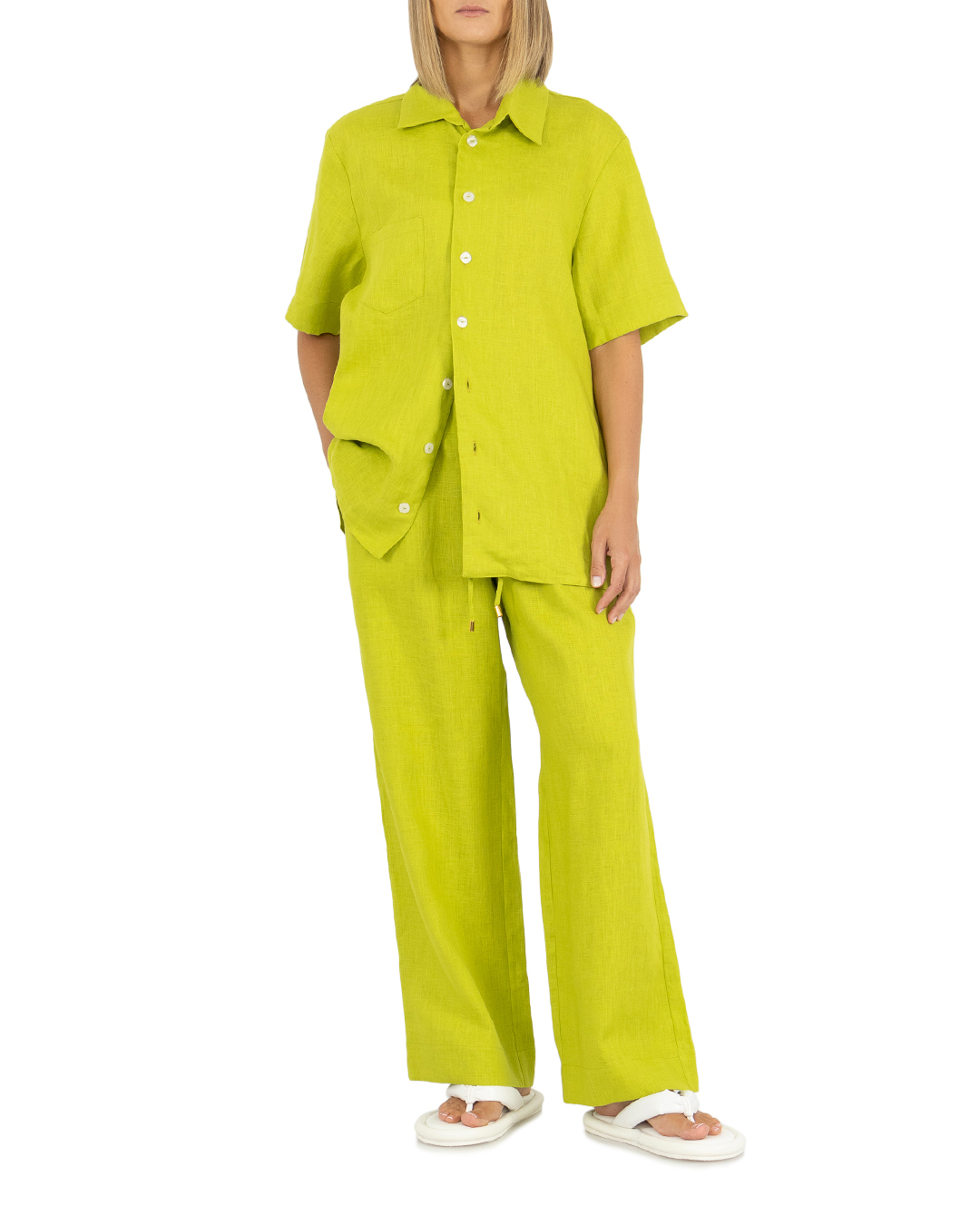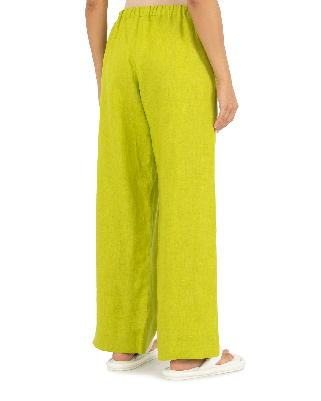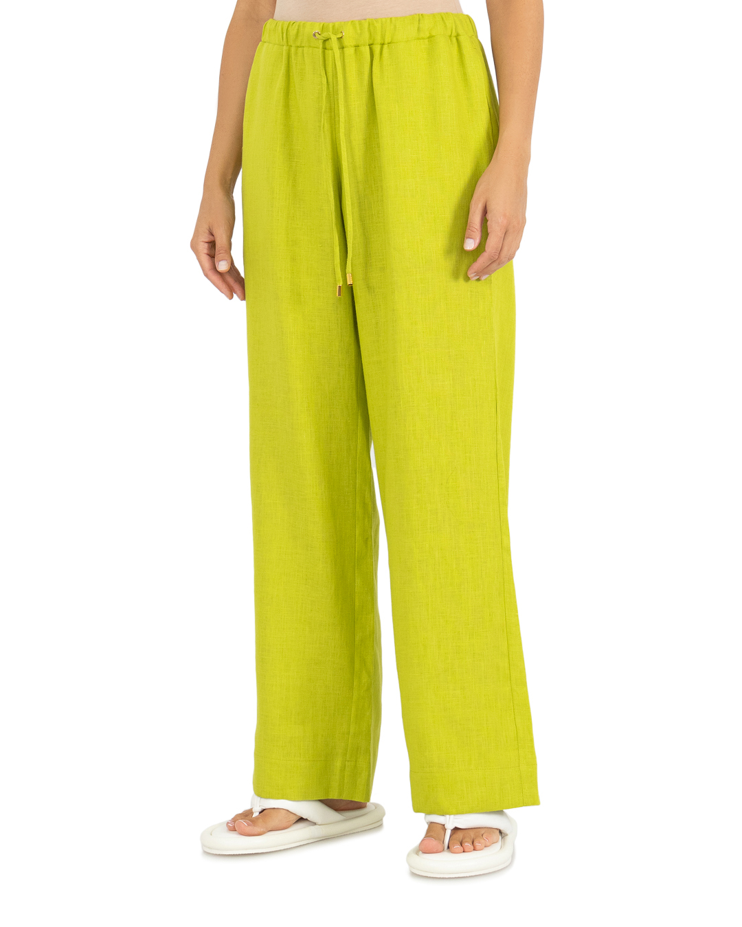 Брюки LEAH сшиты из натурального льна. Модель прямого силуэта с широкими брючинами и эластичной линией пояса с завязками.