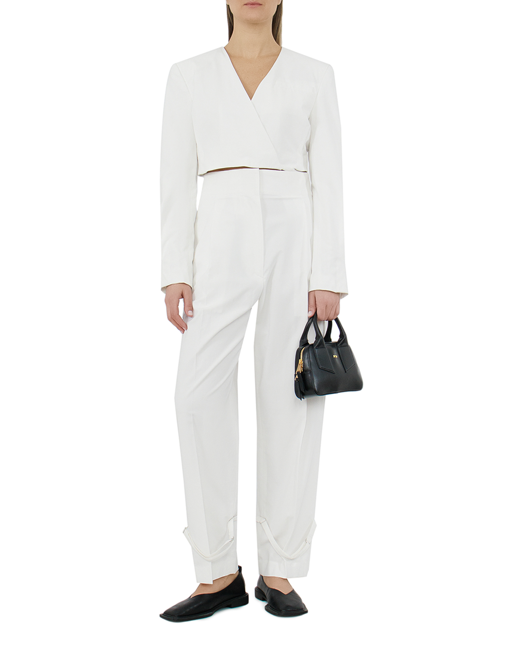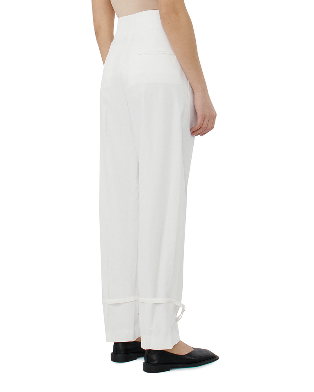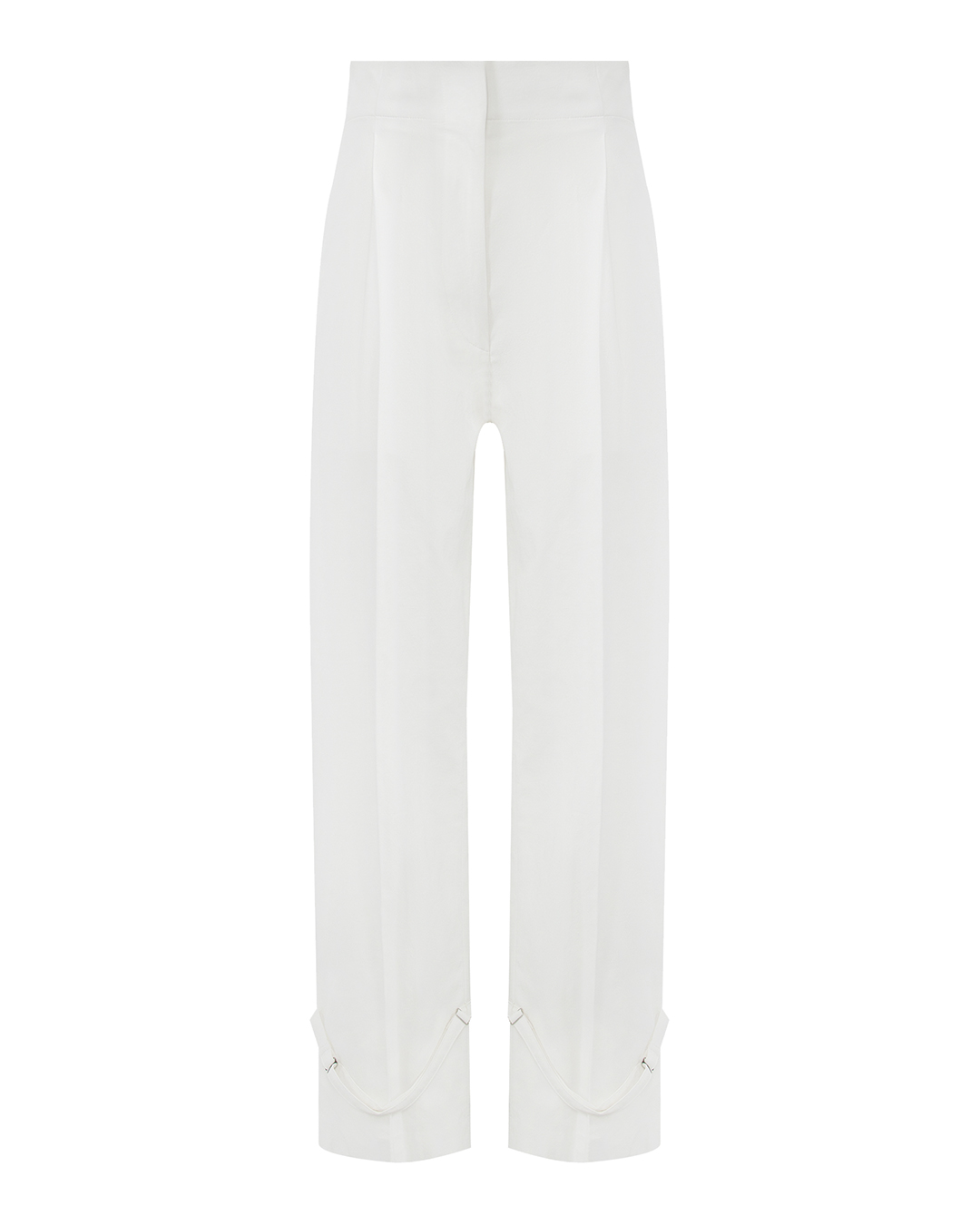 Прямые классические брюки нейтрального молочного оттенка одинаково органично дополнят образ для офиса или выхода в театр. Для изготовления модели с завышенной посадкой использовали легкую фактурную вискозу. Материал не деформируется и не подвержен пилингу, поэтому изделие надолго сохранит безупречный вид.