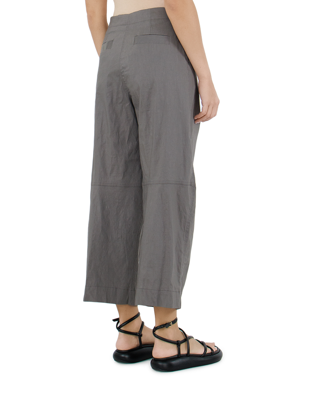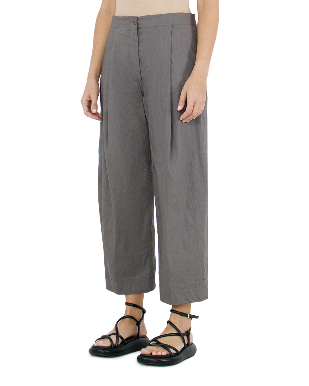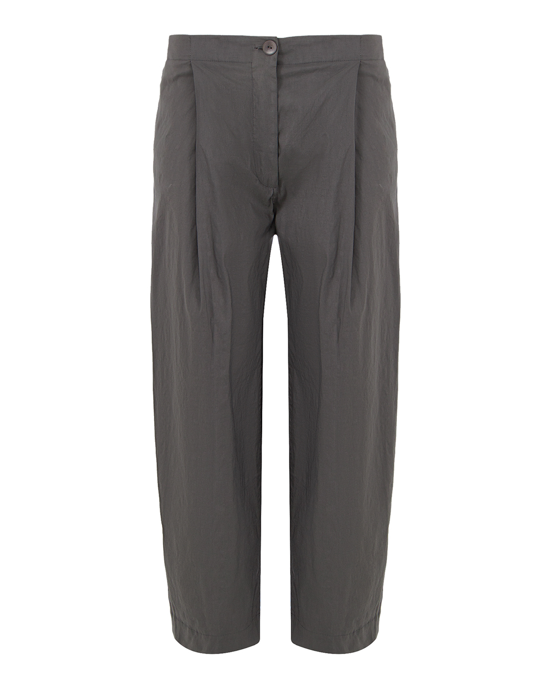 Эти брюки Malloni — безупречный пример современного дизайна с нотками утонченной небрежности. Мягкий серый оттенок добавляет глубины и универсальности, делая их идеальным выбором для повседневного гардероба. Широкий крой с защипами создает расслабленный силуэт и придает модели объем, обеспечивая комфорт и свободу движений. Высокая посадка подчеркивает линию талии, добавляя структурированности и изысканности в базовый силуэт. Застежка на пуговице и молнии выполнена аккуратно, гармонируя с общим минималистичным декором. Укороченные штанины открывают щиколотки, что позволяет обуви стать заметным акцентом в ансамбле. Эти брюки идеально сочетаются как с легкими блузами и рубашками, так и с объемными свитерами, создавая стильные и непринужденные образы для любого случая.