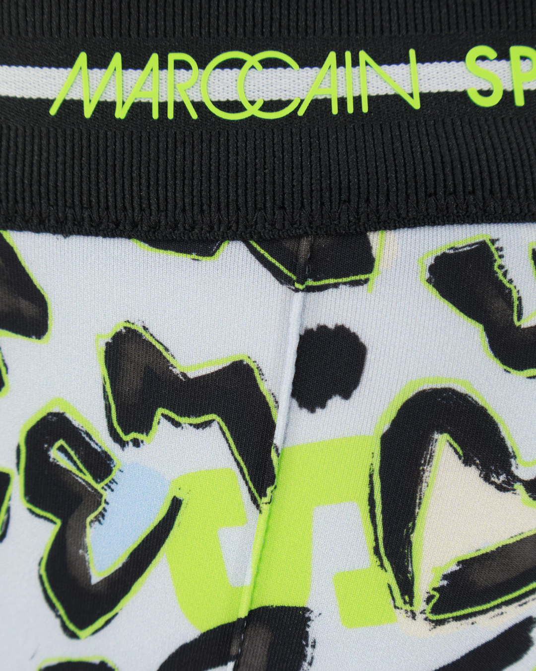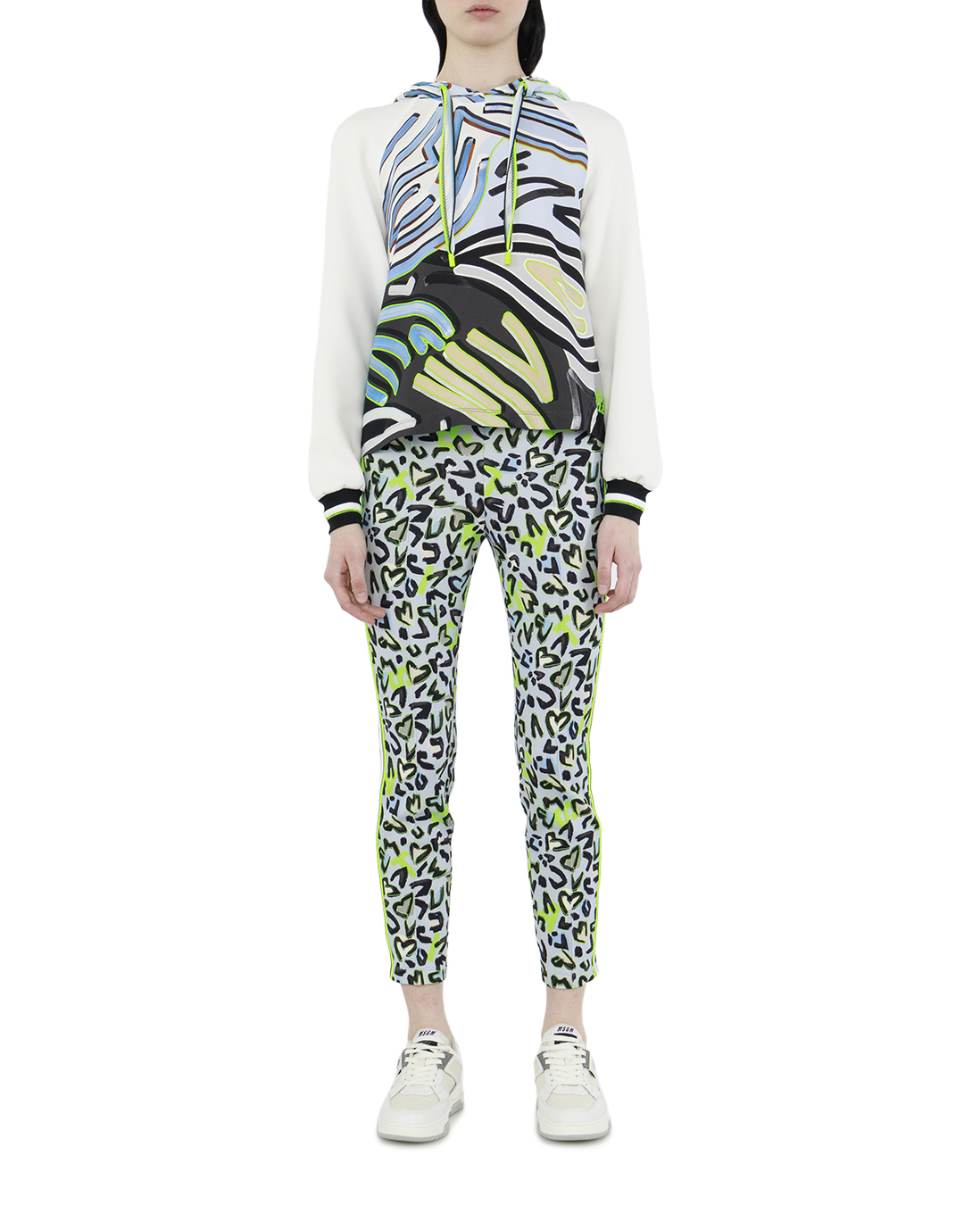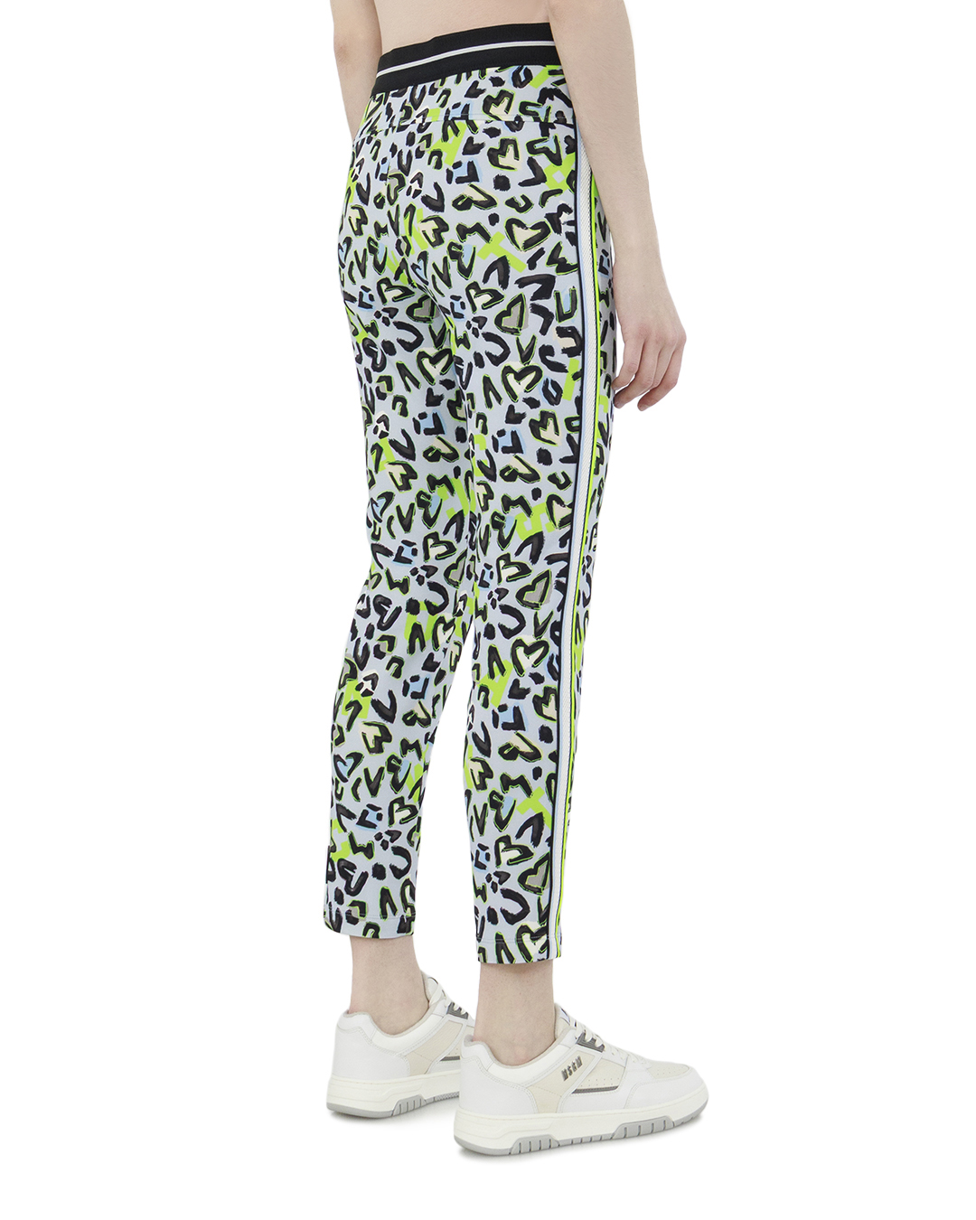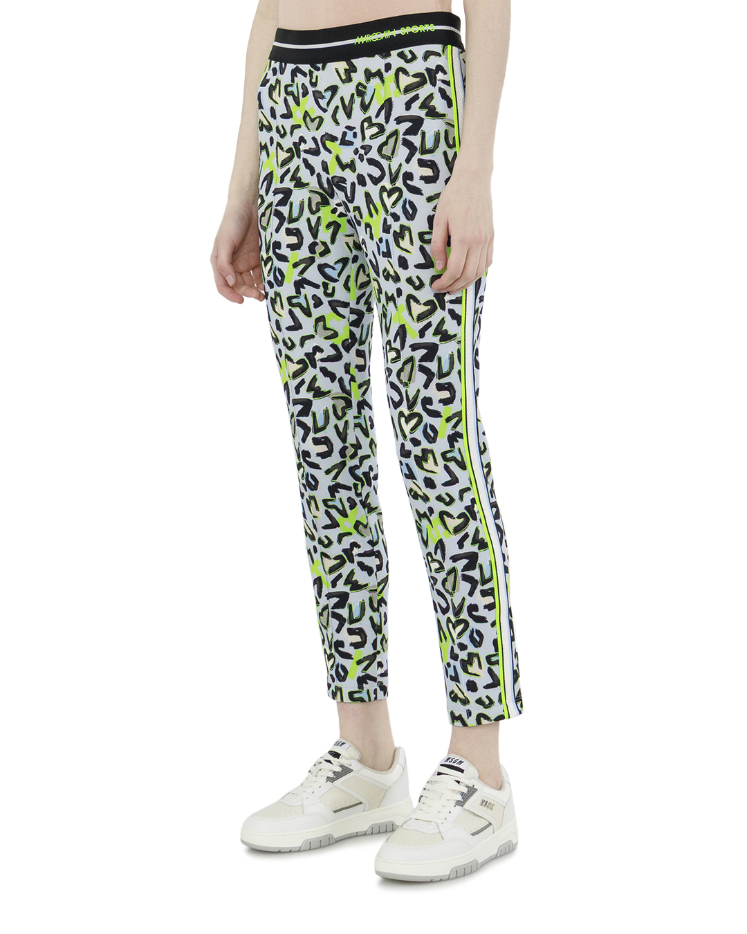 Брюки Sofia в стиле леггинсов выполнены из эластичного трикотажа в рубчик и имеют эластичный пояс для максимального комфорта. Украшены сплошным динамичным принтом в стиле граффити из нарисованных кисточкой сердечек и букв. Дополнены лампасами из сетки с контрастной окантовкой, прошитыми стрелками и фирменным логотипом.