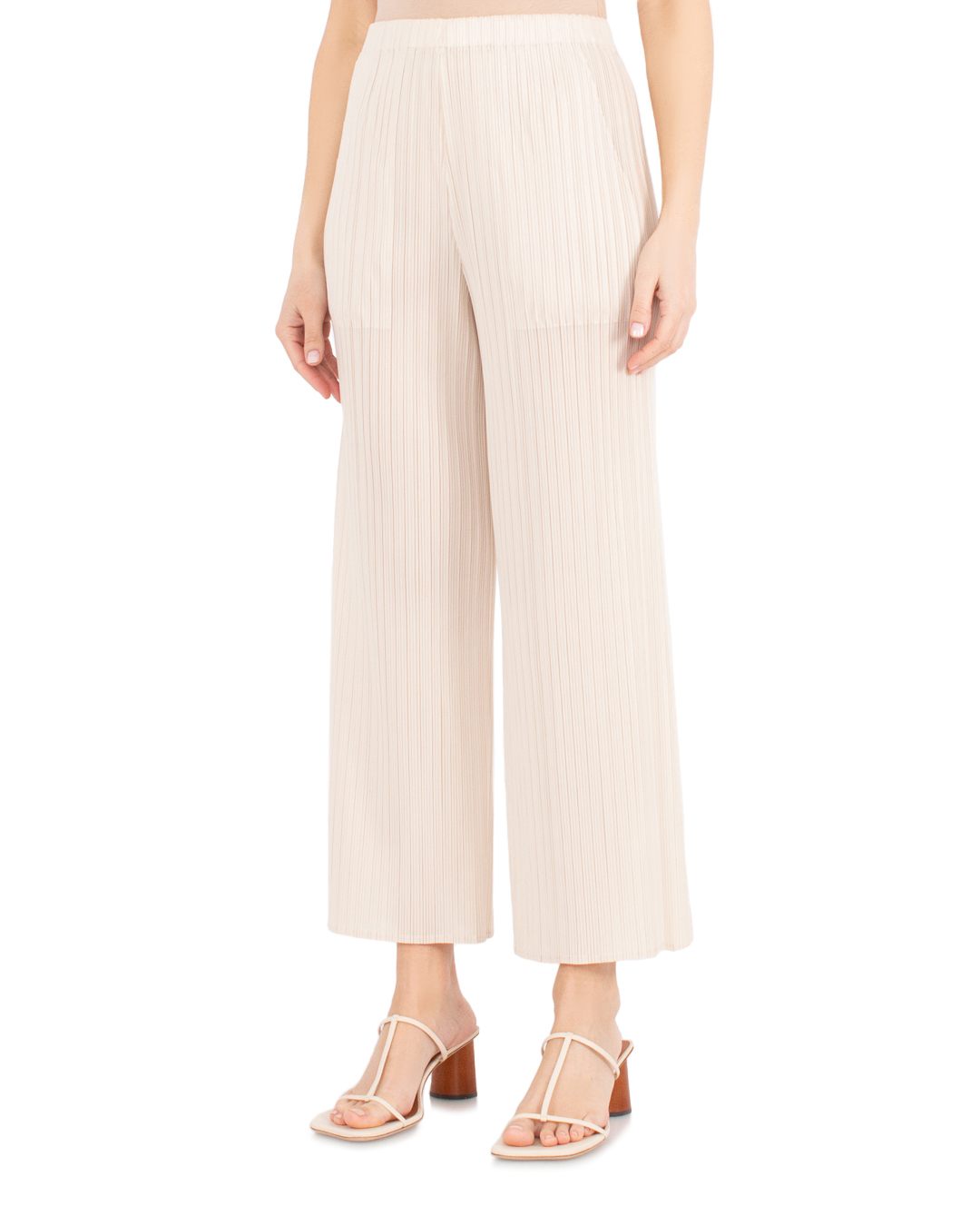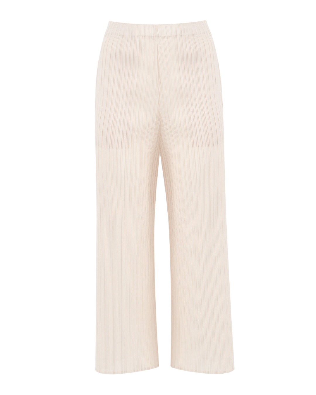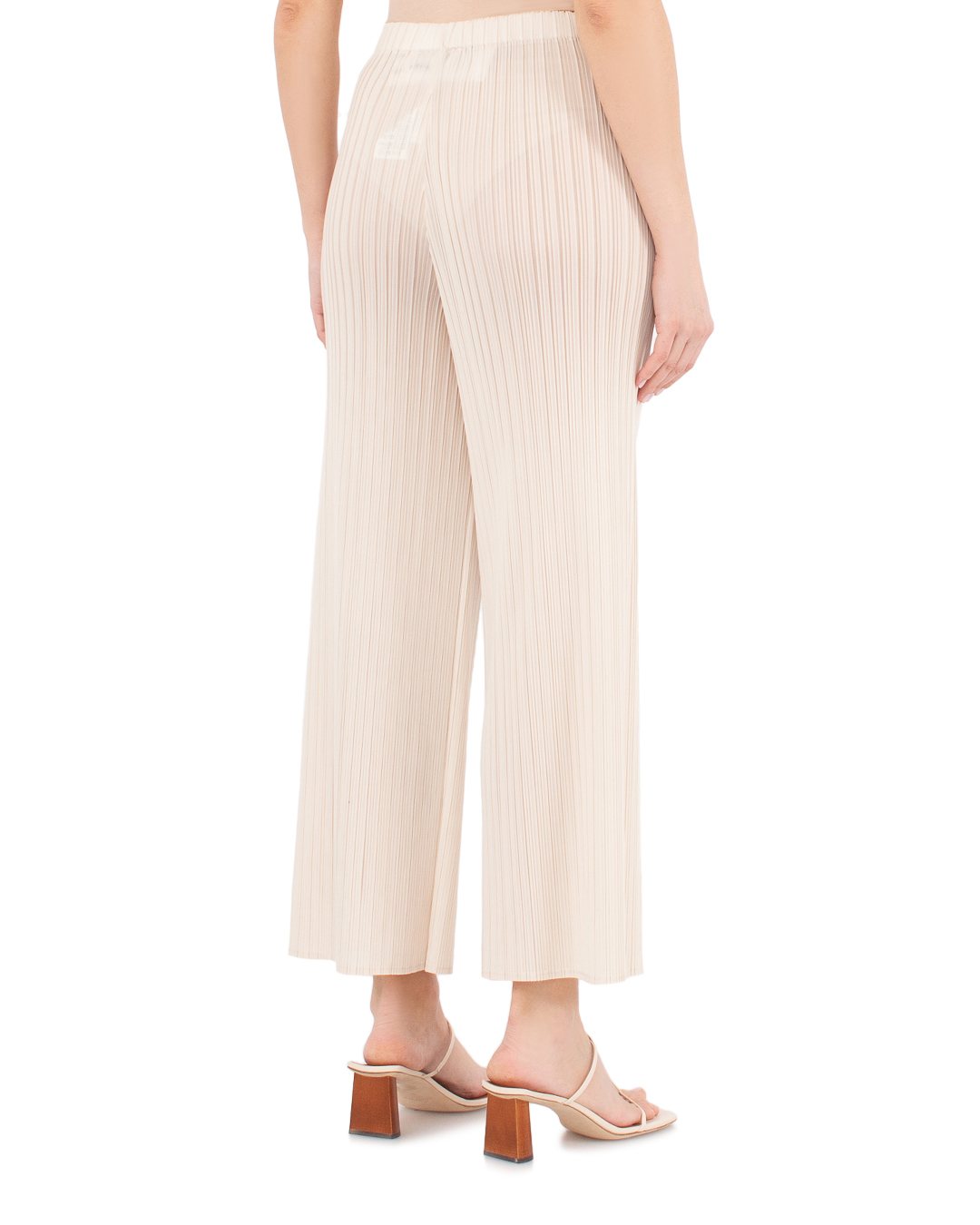 Брюки MEIMEIJ сшиты из плиссированного материала черного цвета. Модель прямого свободного силуэта с эластичной линией пояса.