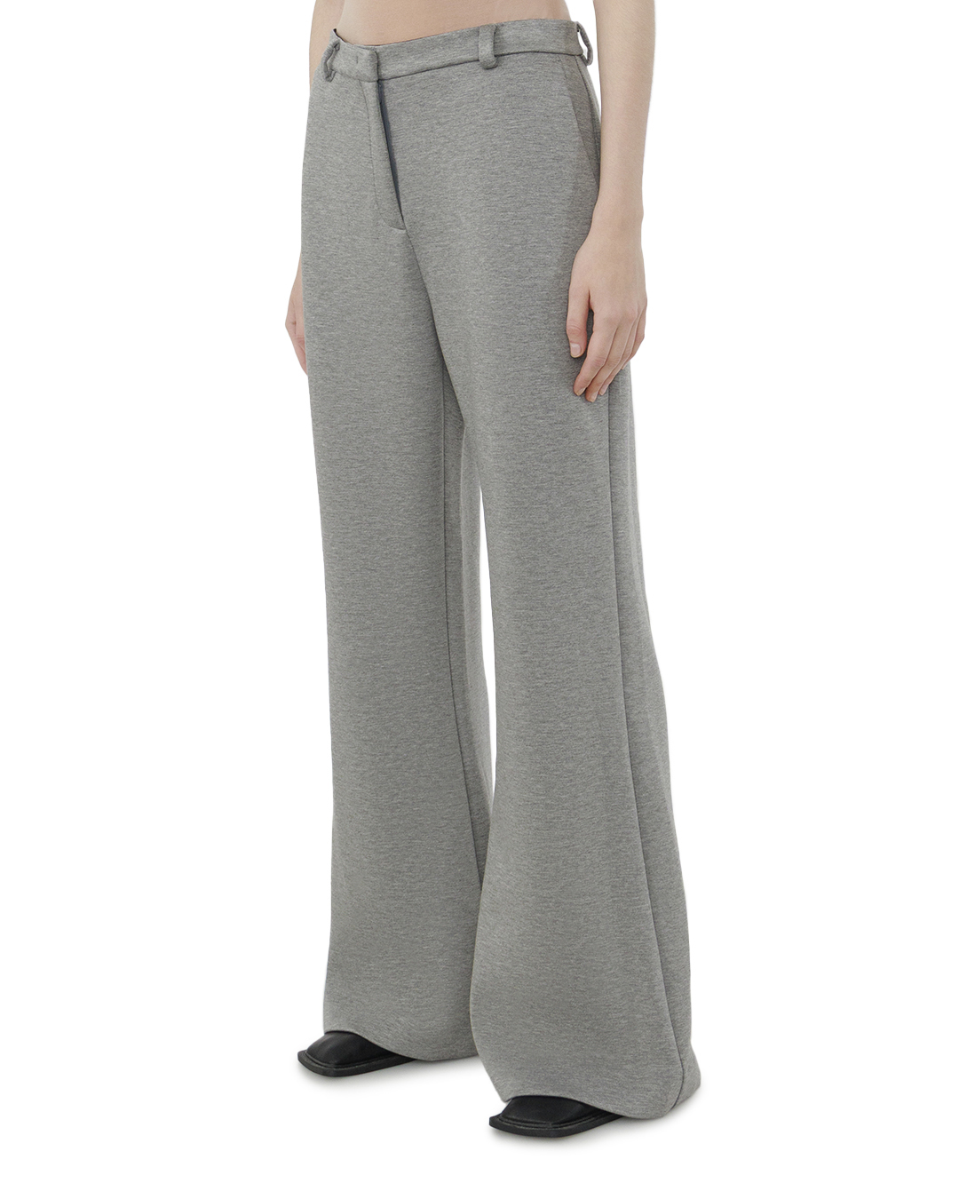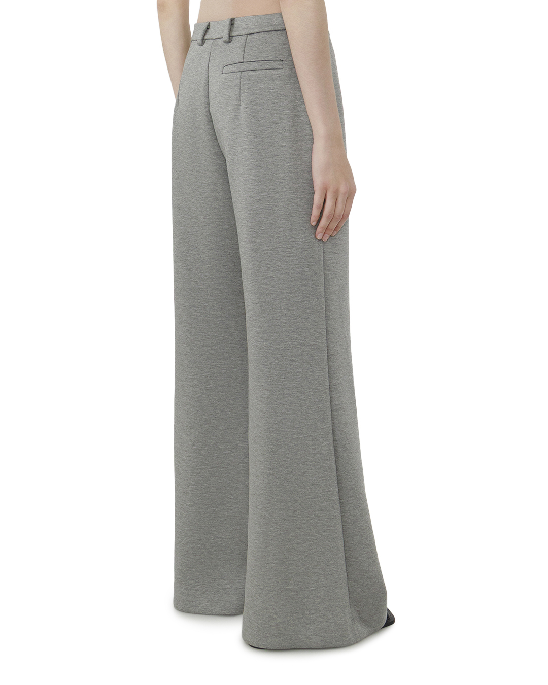 Эти брюки представляют собой идеальный баланс между комфортом и стильной элегантностью. Серый меланжевый оттенок добавляет современный и утончённый вид, легко сочетающийся с различными элементами гардероба. Свой свободный крой и широкие брючины создают эффектный, драпированный силуэт, который визуально удлиняет ноги и придаёт образу современную динамику. Высокая посадка подчёркивает талию, а широкий пояс со шлёвками добавляет возможность разнообразить образ ремнём. Нижняя линия брюк плавно расширяется к низу, что позволяет сочетать их как с каблуками, так и с плоской обувью. Элегантные боковые карманы добавляют функциональности и стильности, а скрытая застёжка-молния и пуговица обеспечивают аккуратный и цельный вид. Детали отделки включают аккуратные внутренние швы и подгибы, выполненные с безупречной точностью, что отражает высокое качество пошива и внимание к деталям. Эти брюки — идеальный выбор для создания уверенного и актуального образа на каждый день.