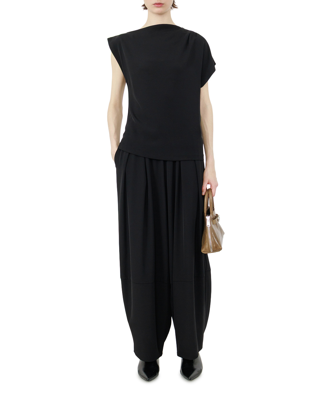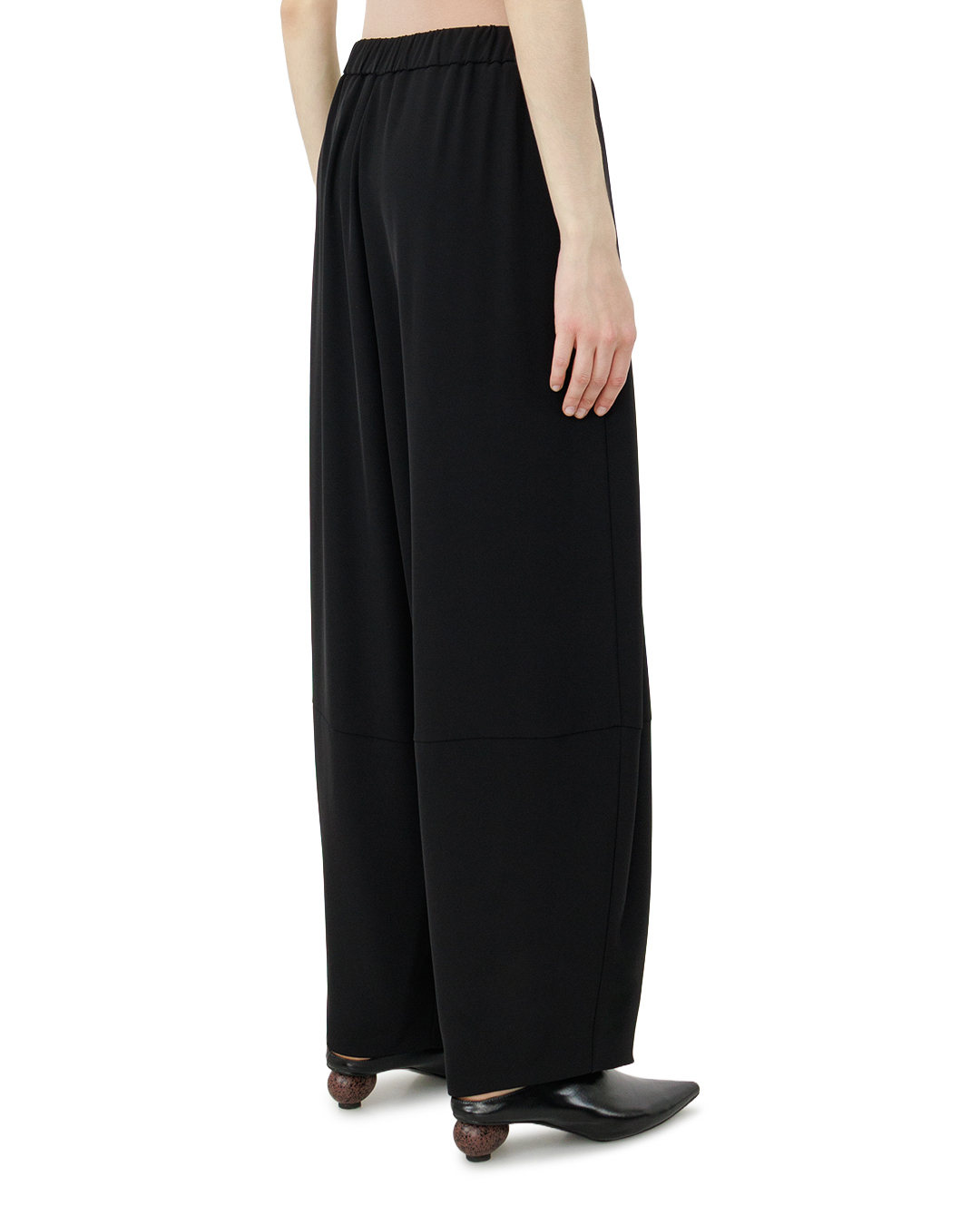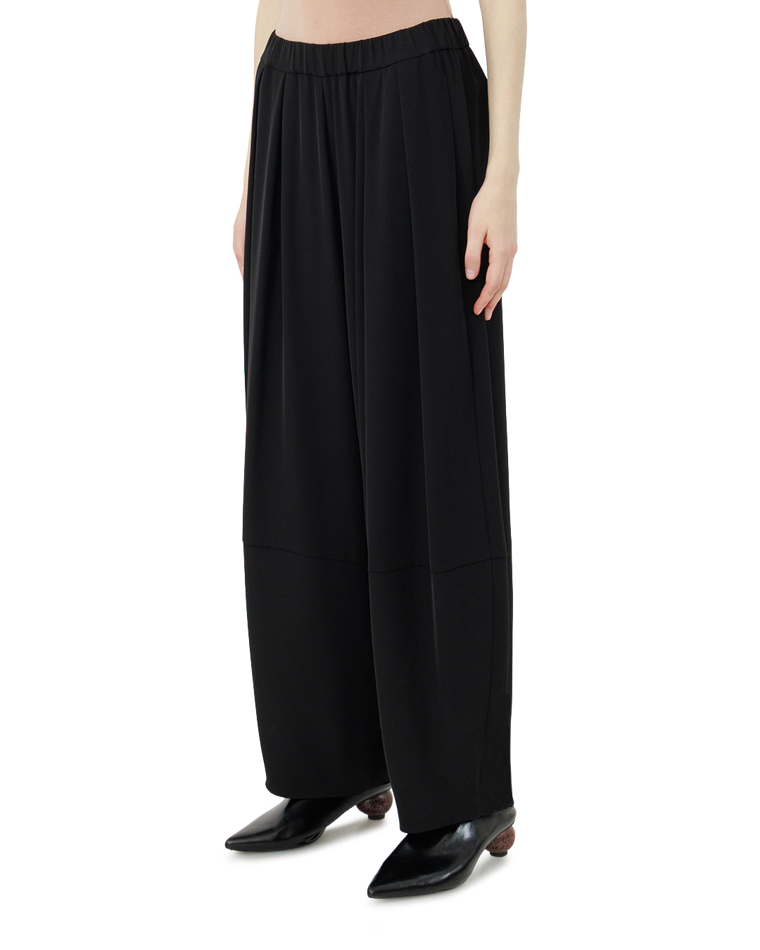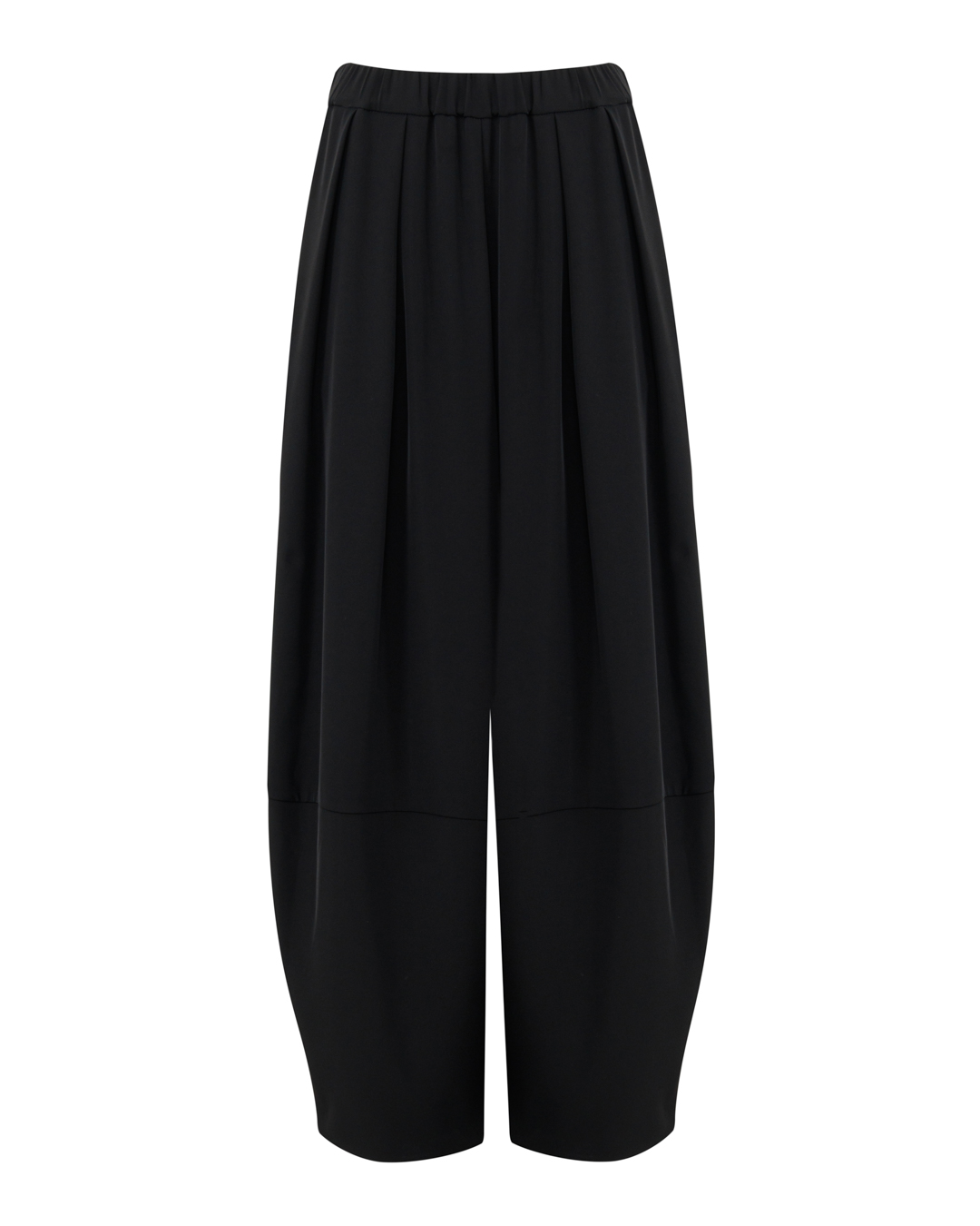 Эти чёрные брюки — воплощение современной элегантности с намёком на авангард. Свободный, утрированно широкий крой создаёт эффект лёгкости, не утрачивая при этом благородной сдержанности. Эластичный пояс обеспечивает комфортную посадку, мягко подчёркивая линию талии. Глубокие защипы спереди добавляют объём и динамику, придавая модели скульптурность. Укороченная длина балансирует между утончённостью и смелостью, а лаконичная отделка без излишеств делает вещь универсальной: она легко впишется как в строгий, так и в более артистичный образ. Чёрный цвет подчёркивает безупречный вкус, превращая брюки в выразительный акцент гардероба.