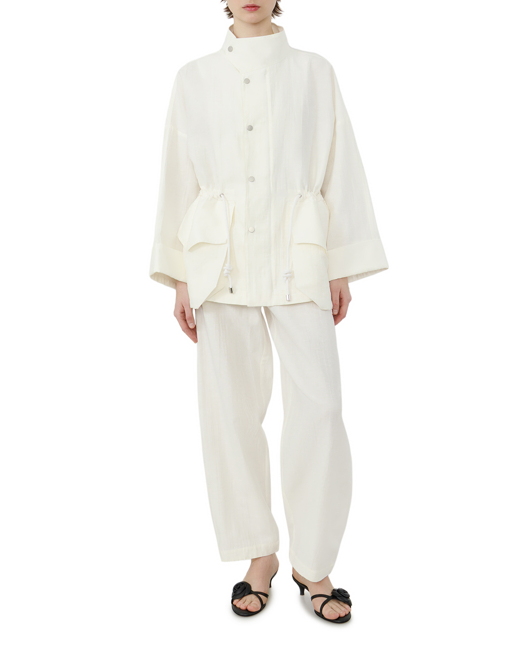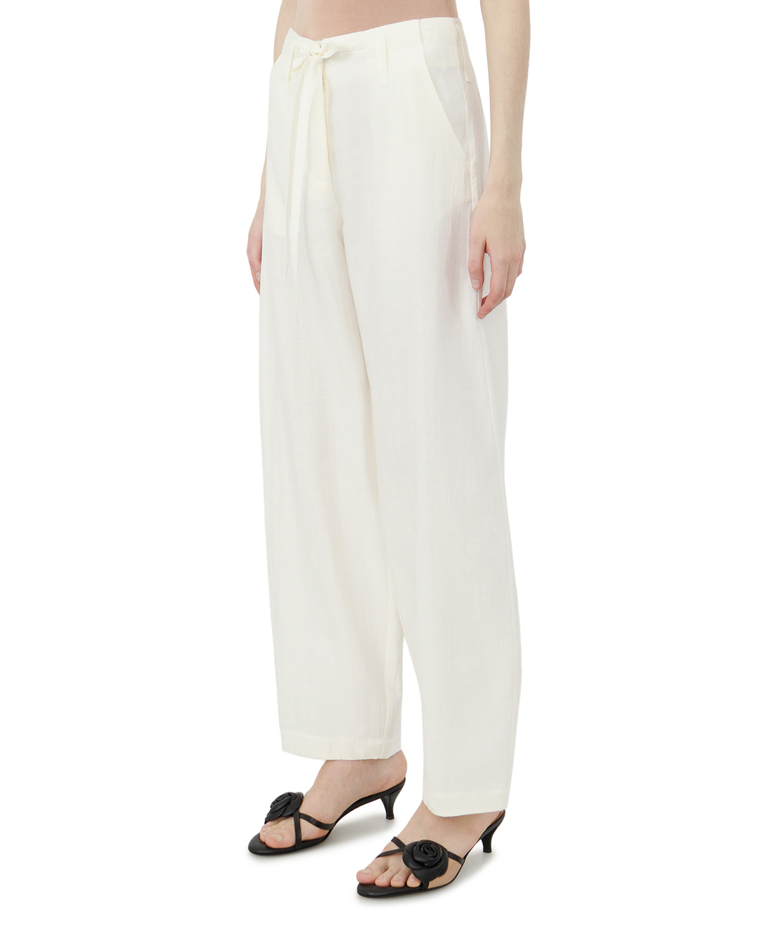Эти брюки — воплощение лаконичной элегантности. Свободный, утрированно широкий крой создаёт ощущение лёгкости, не утрачивая при этом благородной сдержанности. Высокая посадка с завязками подчёркивает линию талии, добавляя силуэту утончённости. Чистые, плавные линии кроя без излишней детализации делают модель универсальной: она легко впишется как в расслабленный, так и в более собранный образ. Нежный молочный оттенок придаёт вещи особую изысканность, а минимализм отделки подчёркивает художественную простоту и безупречный вкус.