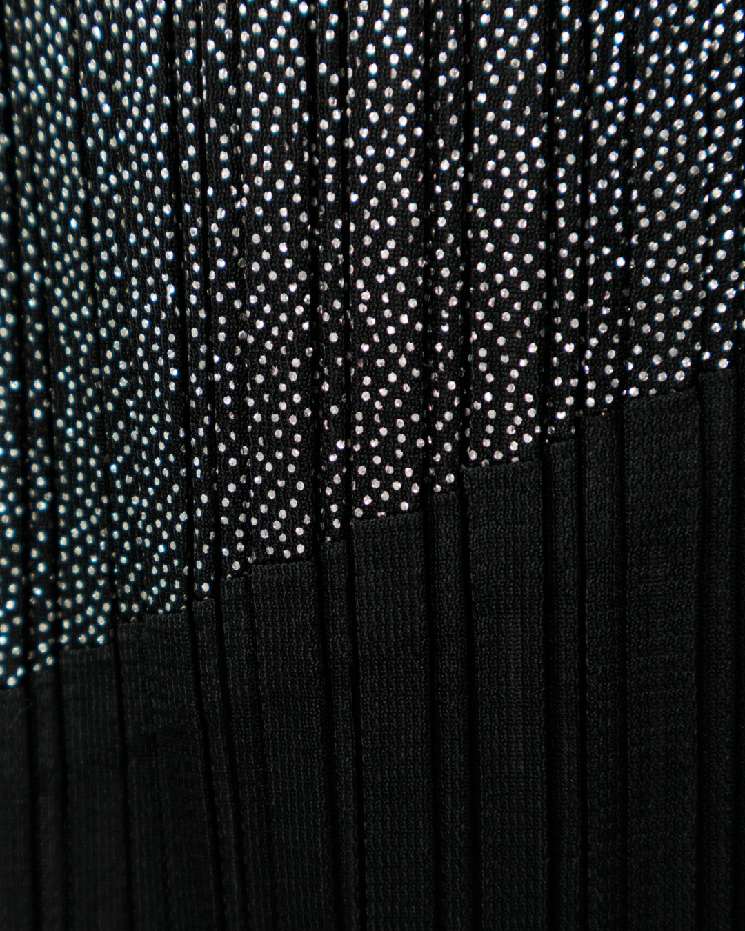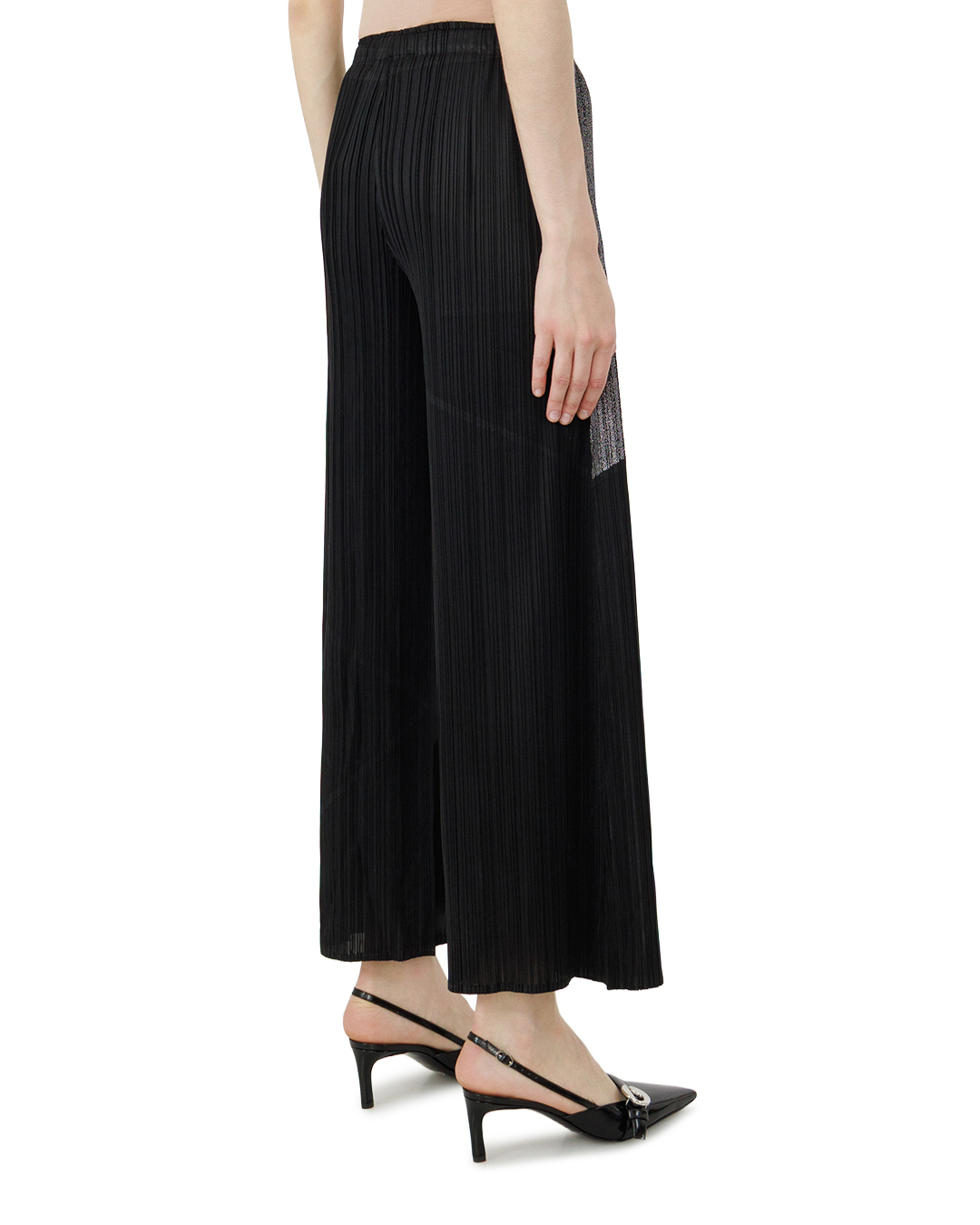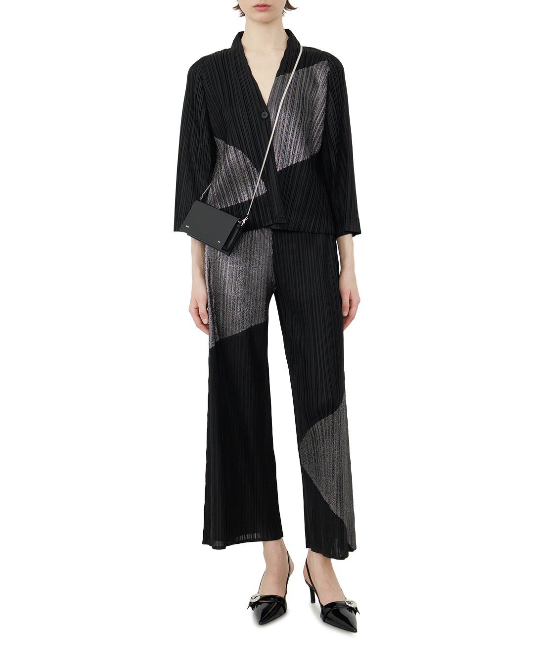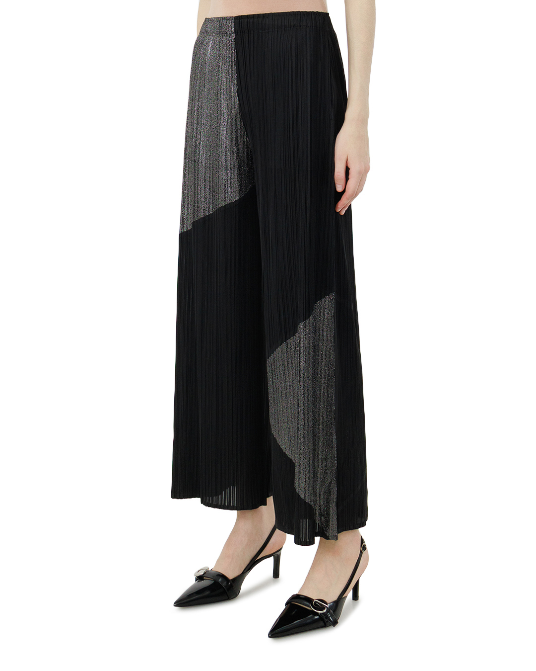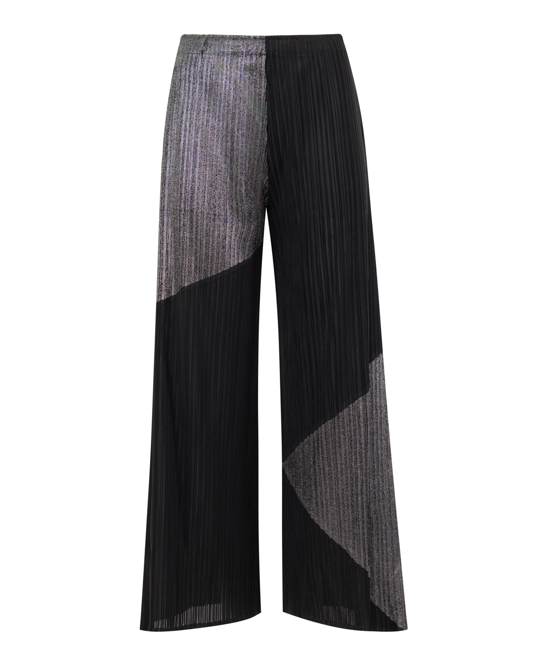 Эти брюки — воплощение современной элегантности. Широкие штанины с выразительной плиссировкой создают эффект лёгкости и динамики, подчёркивая силуэт без излишней строгости. Контрастное сочетание тёмных и мерцающих серых участков формирует геометрический рисунок, придающий модели художественную выразительность. Высокая посадка визуально вытягивает фигуру, а плавные линии кроя обеспечивают гармонию между свободой движения и утончённостью. Асимметричные цветовые блоки добавляют нотку авангарда, делая эти брюки центральным элементом образа.