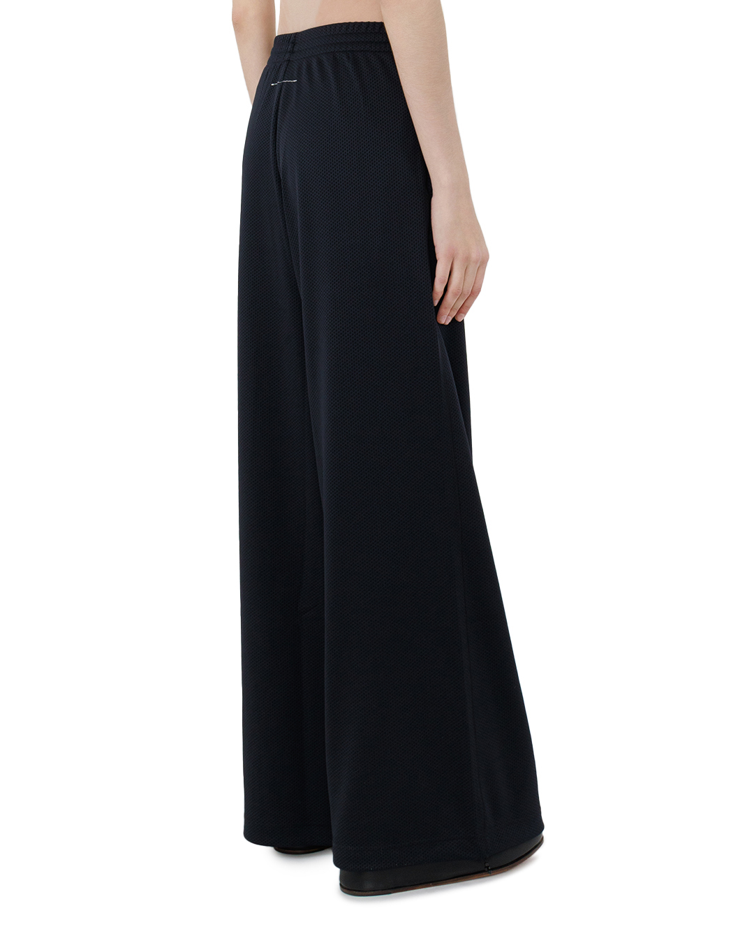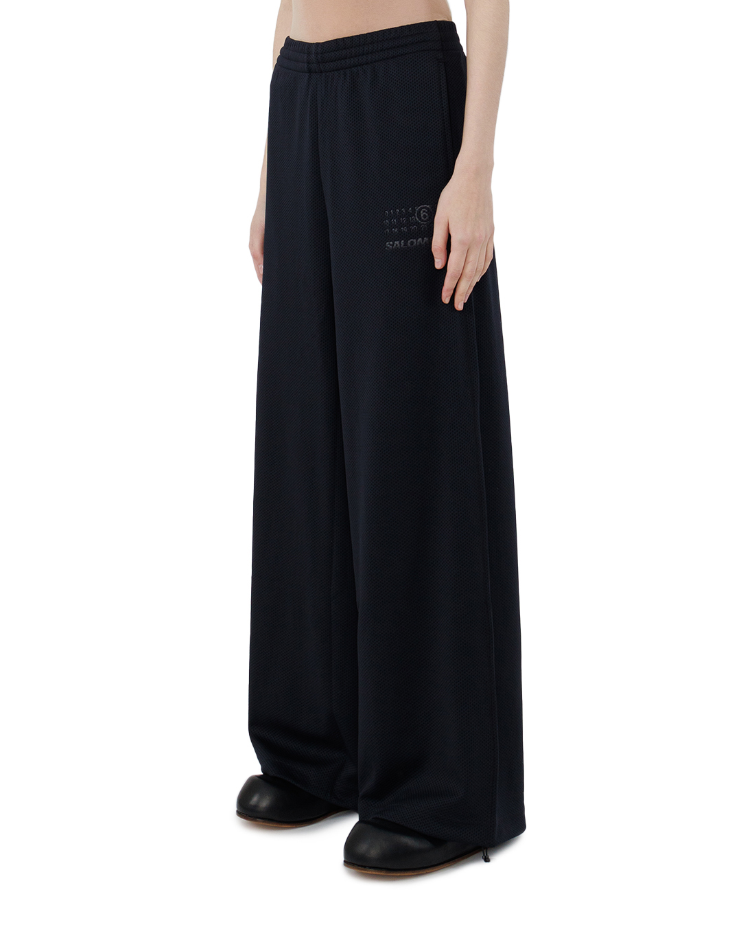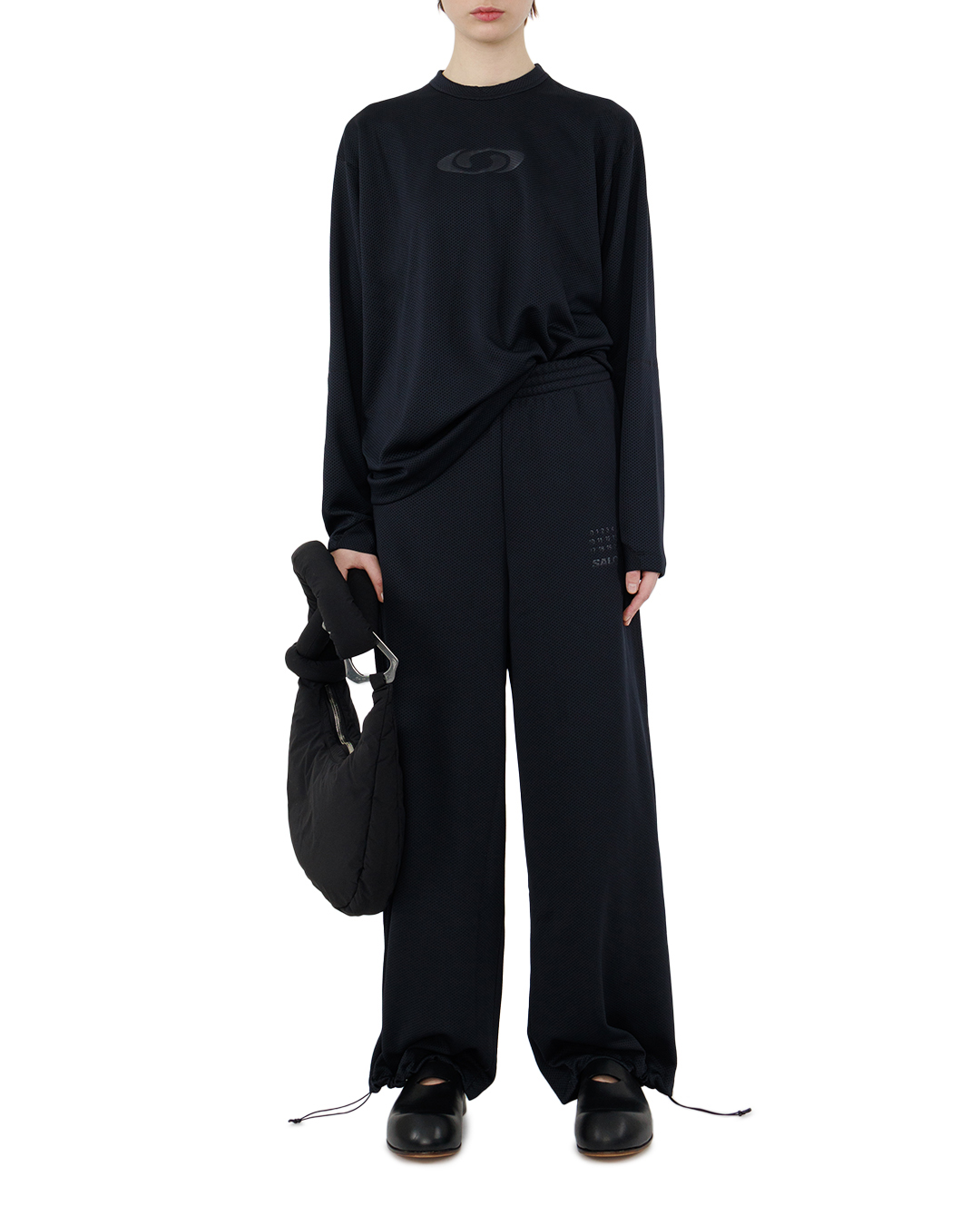 Эти брюки представляют собой идеальное воплощение современной функциональной роскоши. Выполненные в глубоком чёрном оттенке, они делают акцент на универсальности и элегантности, прекрасно вписываясь как в повседневный, так и в более формальный гардероб. Материал изделия отличается высокой технологичностью: текстура напоминает сетчатую структуру, обеспечивая дышащие свойства и комфорт. Брюки имеют широкий, расклешённый крой, создающий эффект свободного движения и визуальной лёгкости, что особенно актуально в рамках современных трендов. Эластичный пояс гарантирует удобную посадку и легкость в ношении, подчеркивая практичность дизайна. Детали отделки акцентированы минималистичными логотипами, аккуратно нанесенными сбоку, что добавляет изделию фирменный шарм и подлинность. Низ брючин оснащён утяжками, которые позволяют регулировать силуэт, добавляя элемент кастомизации и подчёркивая индивидуальный стиль. Эти брюки станут идеальным выбором для тех, кто ценит стиль, комфорт и современный подход к классике.