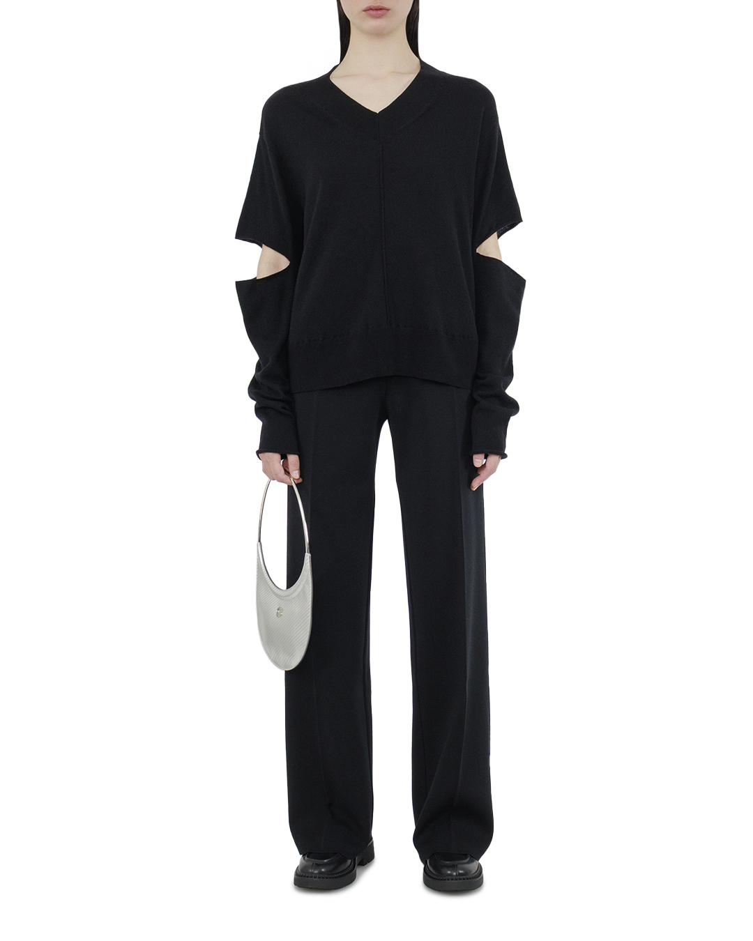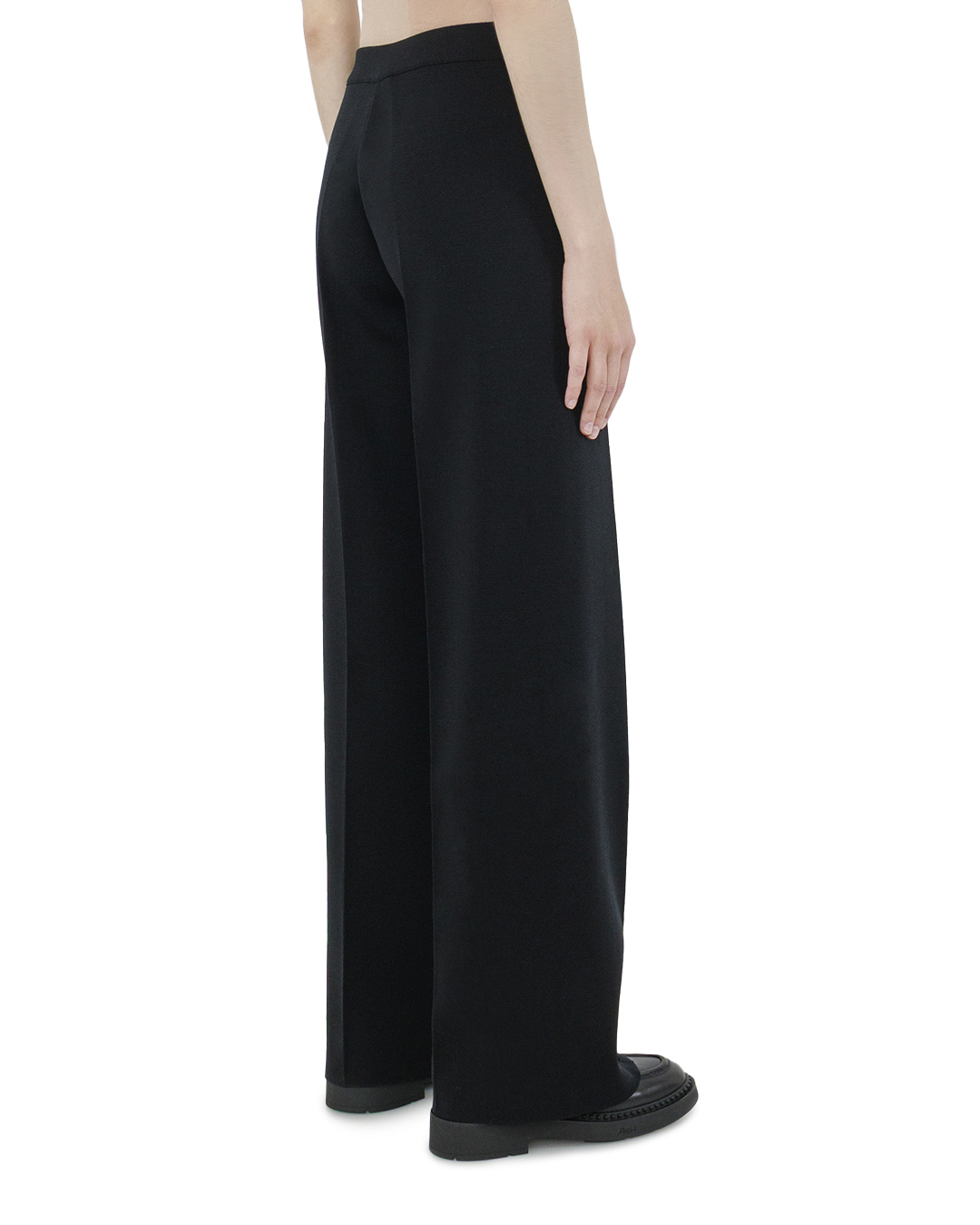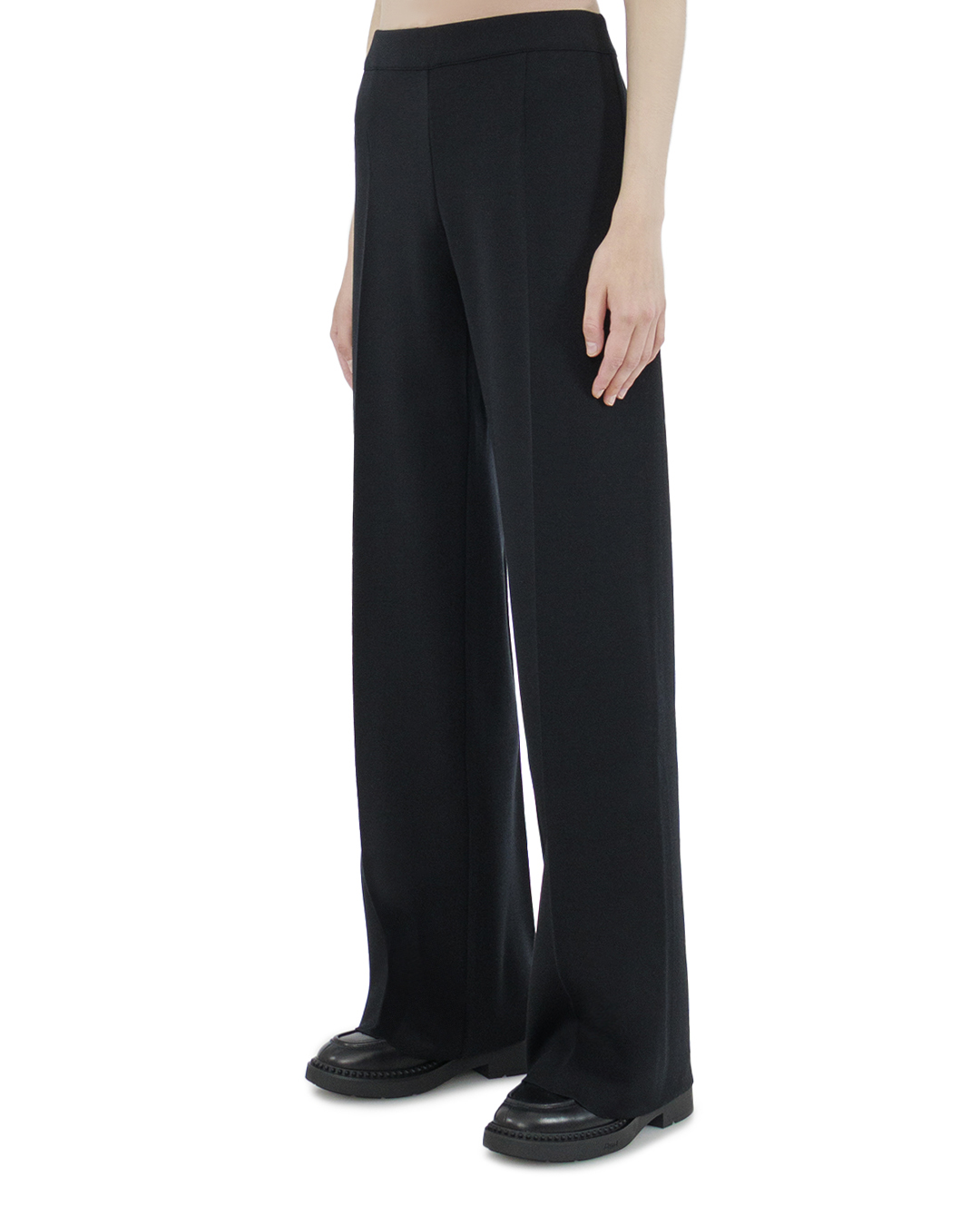 Эти брюки воплощают собой идеал современной классики с элементами смелого дизайна. Изготовленные из гладкой, плотной ткани, они создают впечатление структурированности и устойчивости формы. Широкий крой брюк, подчеркивающий силуэт, дарит свободу движений и элегантную драпировку. Линия талии акцентирована плоским поясом, обеспечивающим чистоту и лаконичность образа без излишних деталей. Длинные, плавные линии брючин создают эффект легкости, в то время как глубокие стрелки по всей длине подчеркивают формальную изысканность и вытягивают силуэт. Идеально отполированные застежки и потайные швы демонстрируют мастерство исполнения, привнося нотку высокого стиля в ваш гардероб. Эти брюки станут великолепной базой как для делового ансамбля с жакетом и рубашкой, так и для вечернего выхода с утонченной блузкой и аксессуарами.