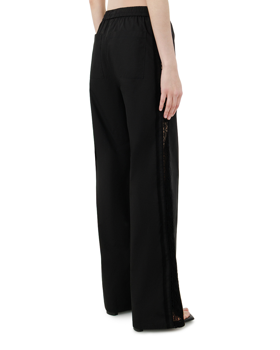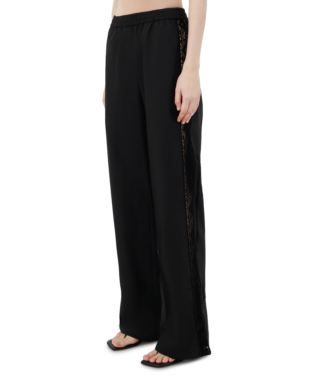 Эти элегантные чёрные брюки — воплощение утончённой лаконичности и современного шика. Свободный, слегка расклёшённый силуэт мягко струится, создавая ощущение лёгкости и непринуждённости, при этом безупречно подчёркивает линии фигуры. Высокая посадка с эластичным поясом деликатно фиксирует брюки на талии, формируя чёткую линию верха и визуально вытягивая силуэт. Особая изюминка модели — изысканная кружевная вставка, проходящая вдоль бокового шва. Этот декоративный элемент добавляет брюкам нотку женственности и загадочности, не перегружая общий образ. Кружево органично вписано в конструкцию, его края аккуратно обработаны, что подчёркивает качество исполнения. Ровный низ брюк оформлен с безупречной тщательностью: срез выполнен точно, без излишнего подгиба, что придаёт модели современный характер. Прямые линии кроя сочетаются с изящной отделкой, создавая гармоничный баланс между строгостью и утончённостью. Эти брюки не просто элемент гардероба — они задают настроение образу, сочетая в себе комфорт и элегантность. Они одинаково органично впишутся и в расслабленный повседневный лук, и в более нарядный ансамбль, добавляя ему изысканности и стиля.