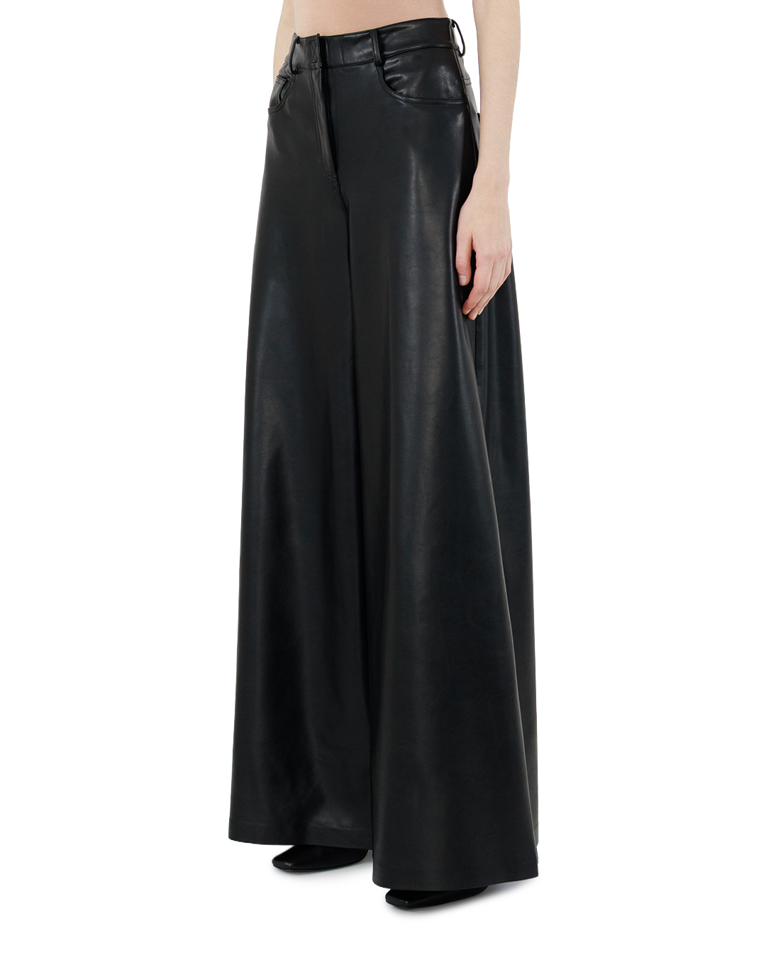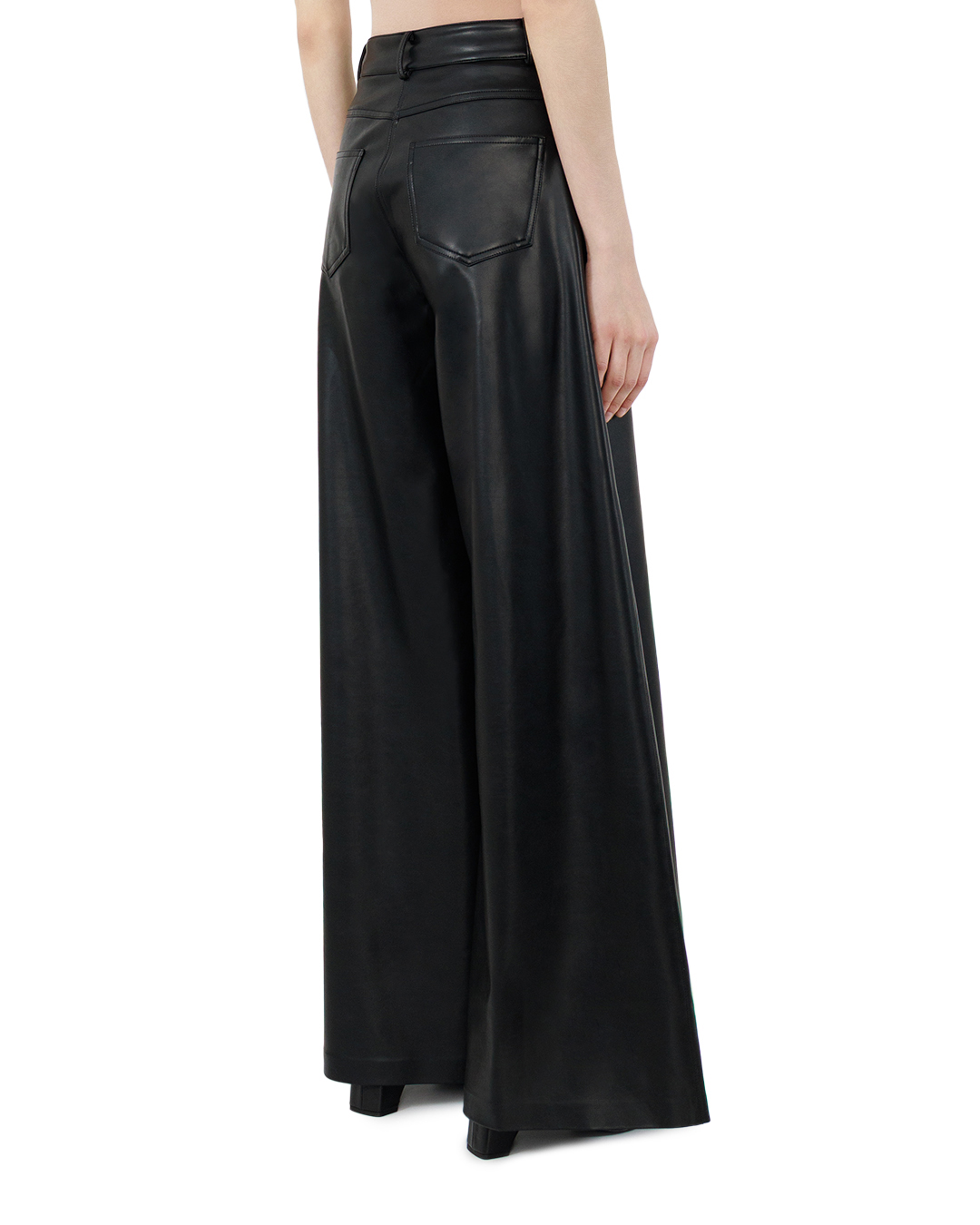 Эти широкие брюки из экокожи — воплощение утончённой дерзости и современного стиля. Глубокий чёрный цвет и глянцевая фактура материала создают завораживающий эффект, превращая каждую линию кроя в выразительный акцент. Модель балансирует между элегантностью и свободой, становясь центральным элементом любого образа. Высокая посадка изящно подчёркивает талию, визуально удлиняя ноги и придавая силуэту графичную чёткость. Широкий крой дарит ощущение лёгкости и непринуждённости, при этом сохраняя безупречную структуру. Такие брюки легко трансформируются из повседневного элемента гардероба в выразительную деталь вечернего лука — всё зависит от выбранного верха и обуви. Эта модель идеально подойдёт тем, кто ценит в одежде сочетание роскоши и функциональности. Они органично впишутся в самые разные стилистические решения: от минималистичного образа с базовой футболкой и ботильонами до эффектного ансамбля с кружевным топом и классическими лодочками. Брюки из экокожи станут настоящей находкой для создания многослойных образов с характером — достаточно добавить объёмный свитер или укороченный жакет. Безупречный крой, выразительная фактура и универсальный чёрный цвет делают эту модель must have в гардеробе современной модницы. Смело экспериментируйте с сочетаниями — эти брюки всегда будут выглядеть актуально и стильно.