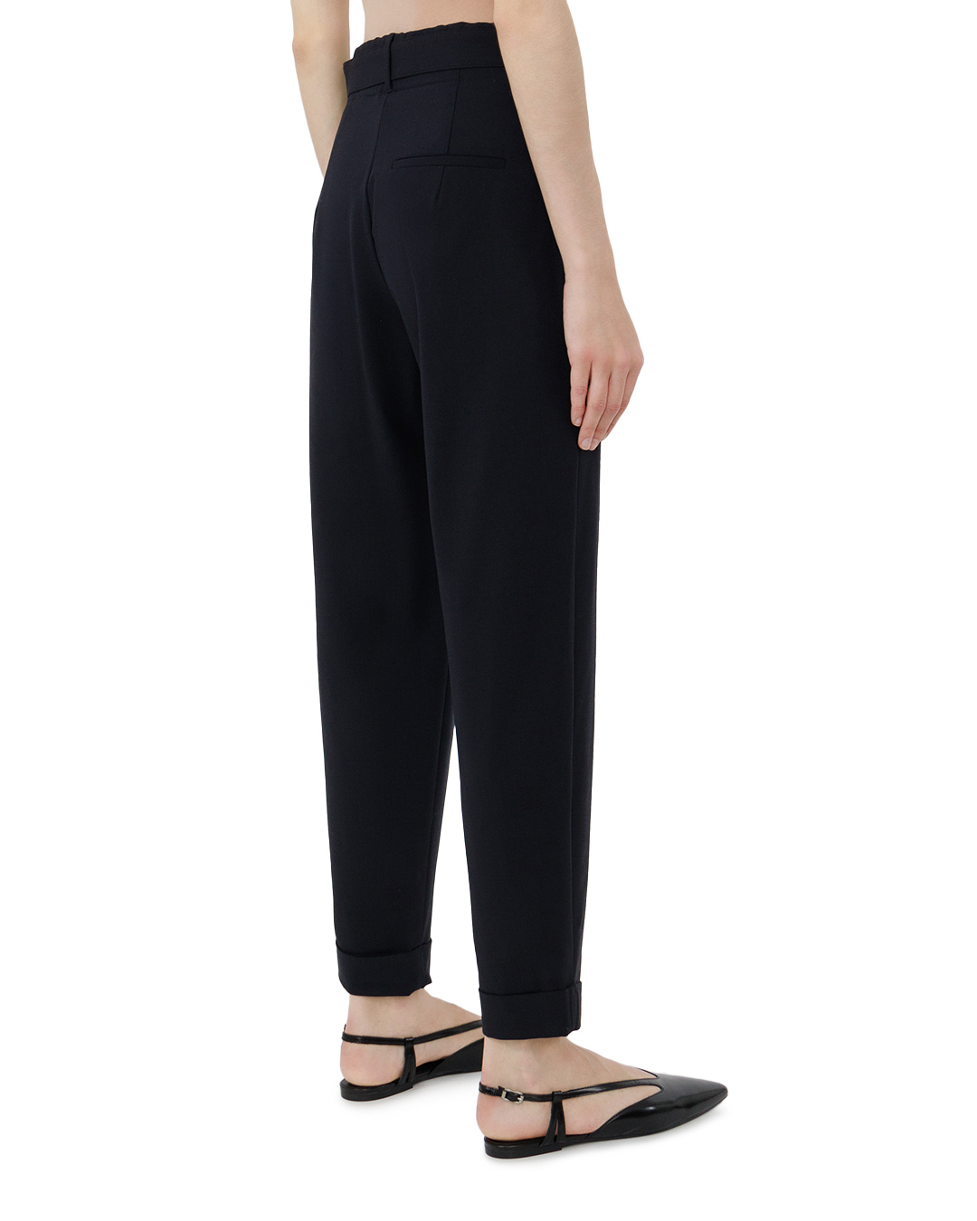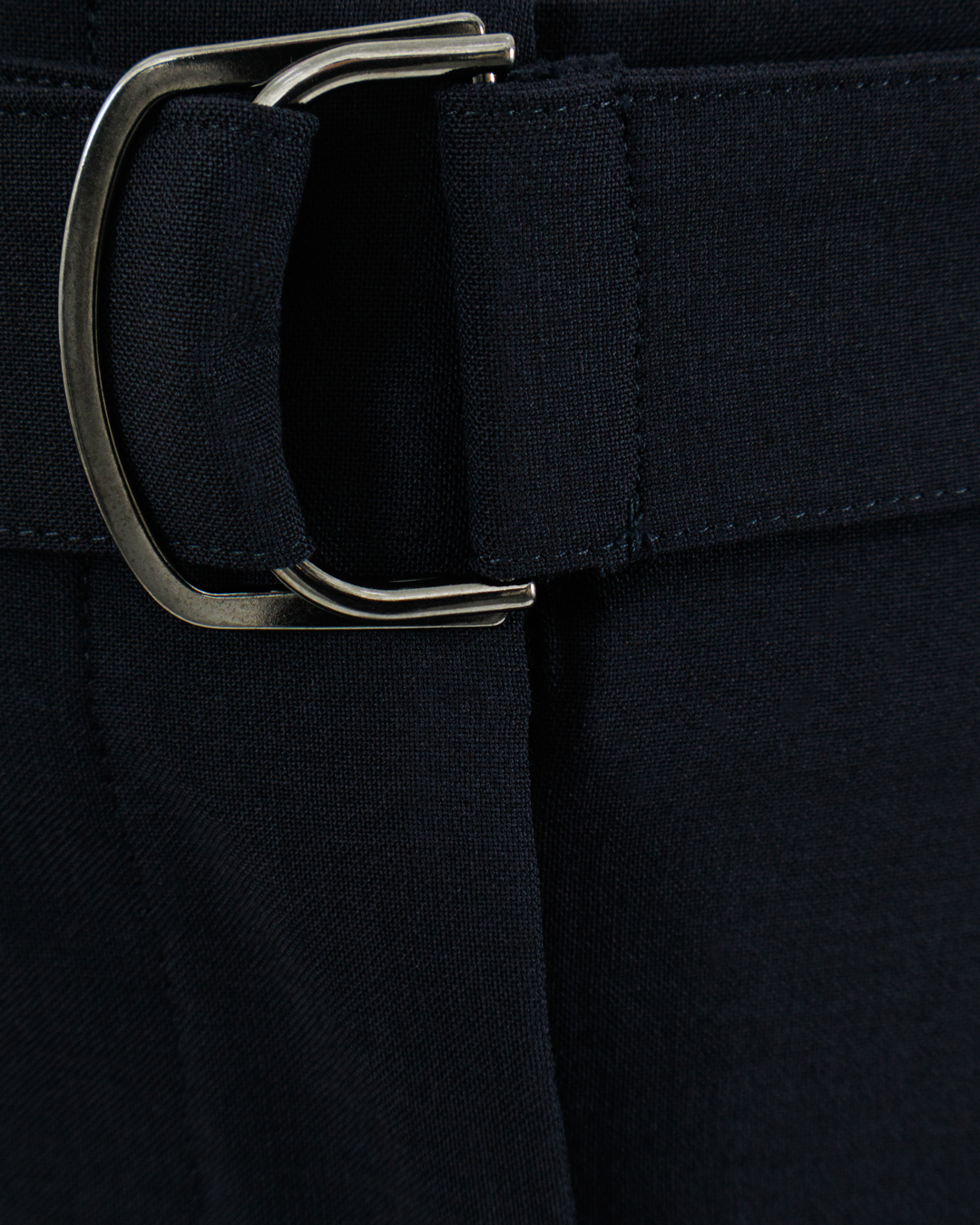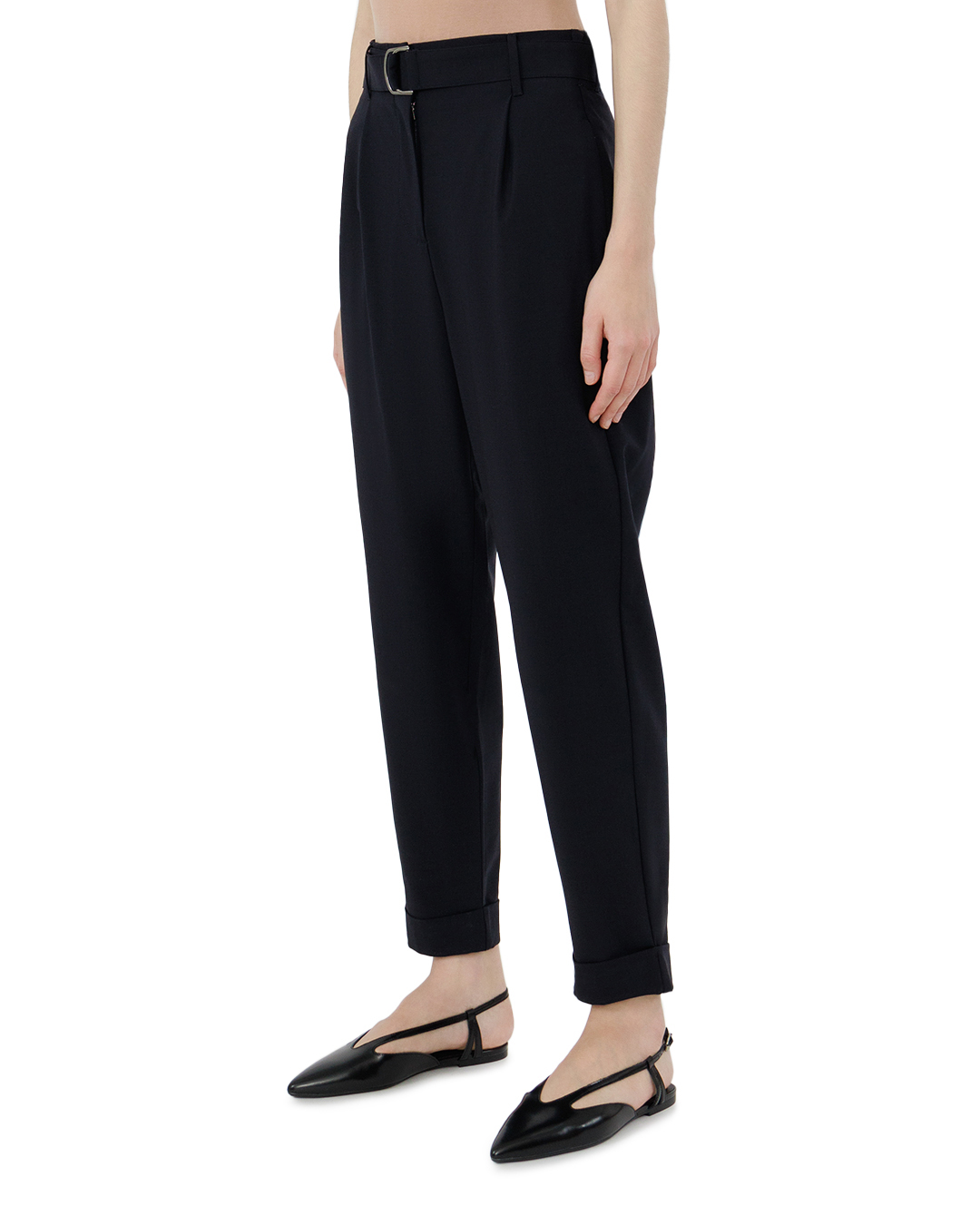 Эти брюки воплощают элегантность и строгость современного стиля. Сшитые из качественной ткани насыщенного темного оттенка, они создают идеальный силуэт с акцентом на классическую изысканность. Высокая посадка подчеркивает линию талии, привнося нотку ретро-шика, а зауженные штанины, заканчивающиеся манжетами, создают актуальный и утонченный образ. Тщательно проработанные стрелки добавляют структуру и визуально удлиняют ноги, придавая фигуре стройность. Эти брюки оснащены поясом с деликатной пряжкой, который не только акцентирует внимание на талии, но и добавляет к дизайну функциональное украшение. Скрытая застежка на молнии и крючках обеспечивает безупречную посадку и удобство. Изумительная детализация и качественное исполнение делают эти брюки универсальным элементом гардероба, подходящим как для деловых встреч, так и для вечерних выходов, сочетая в себе комфорт и стиль на высшем уровне.