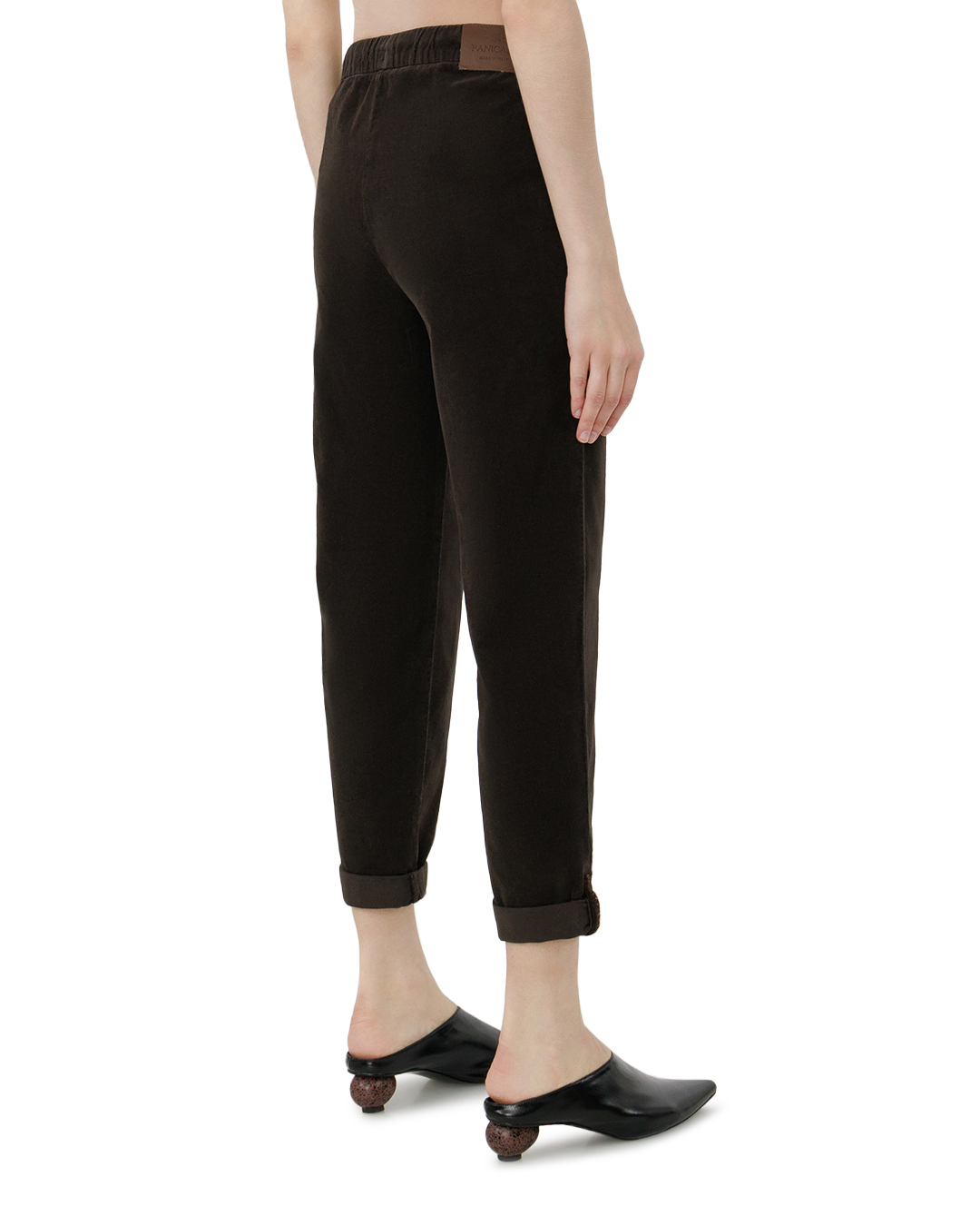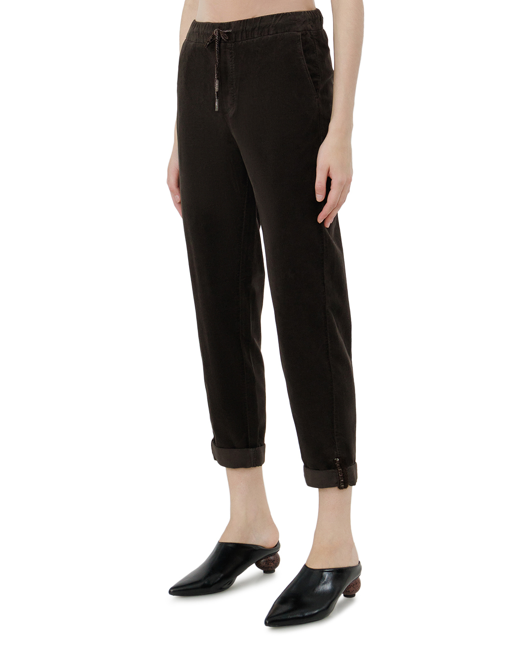 Эти брюки представляют собой идеальное сочетание стиля и комфорта, отражая непринужденную элегантность и современный подход к повседневной моде. Изготовленные из мягкой ткани глубокого, насыщенного оттенка, они обеспечивают комфорт и свободу движений. Эластичный пояс с изысканной завязкой на кулиске позволяет легко регулировать посадку, создавая индивидуальный стиль и обеспечивая удобство. Зауженные штанины добавляют гармонию силуэту, а аккуратные манжеты с регулируемой пряжкой придают модели изысканный акцент. Детали отделки включают в себя швы с тонкой декоративной строчкой, улучшая визуальное восприятие и добавляя штрих изысканности. Такие брюки легко адаптируются к различным стилям, позволяя сочетать их как с кроссовками для расслабленного образа, так и с более формальной обувью для стильного выхода. Эти брюки являются универсальным элементом гардероба, предлагая беспроигрышное сочетание функциональности и утонченного стиля.