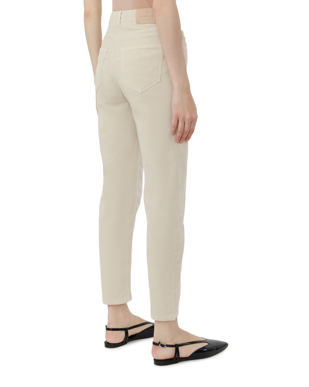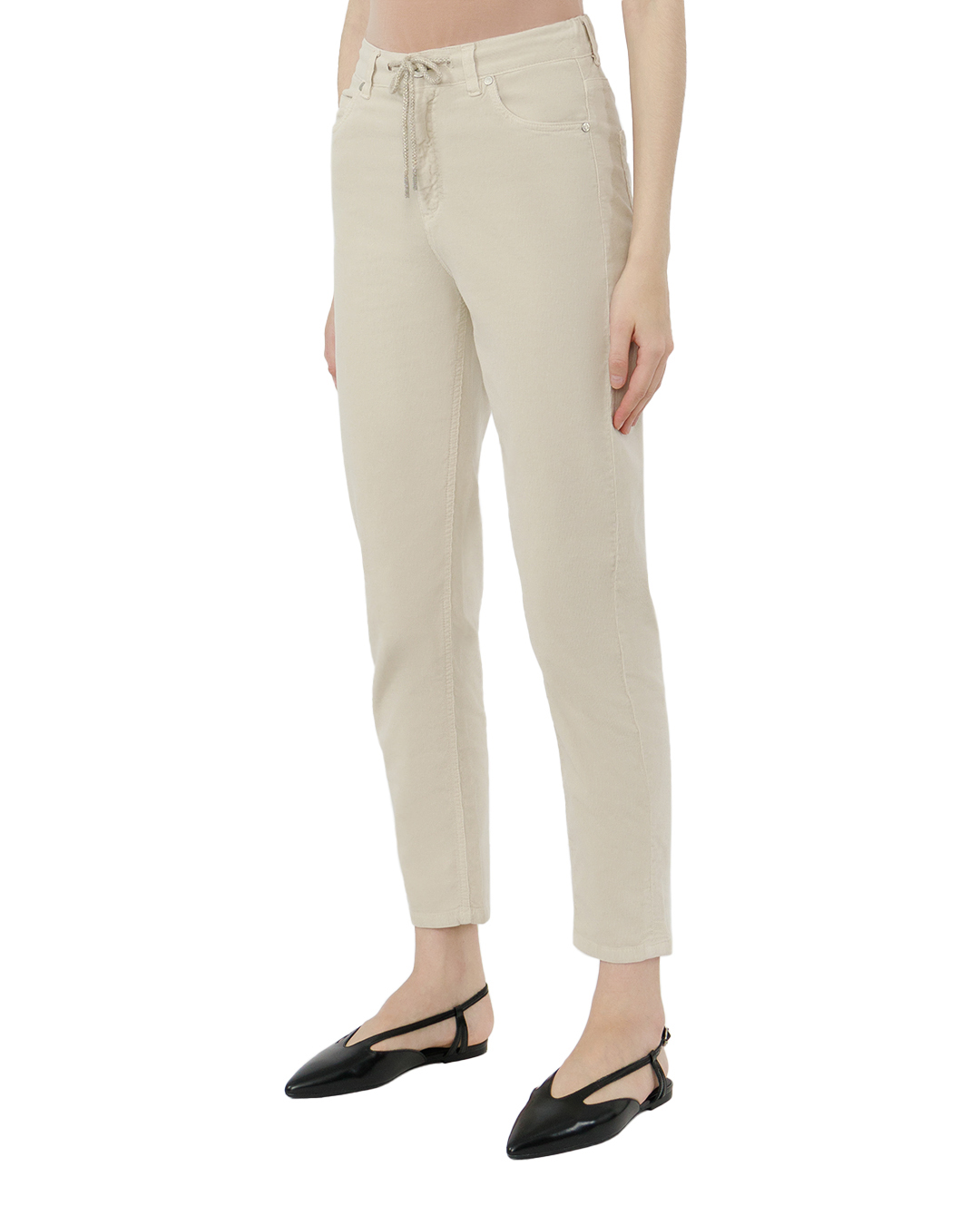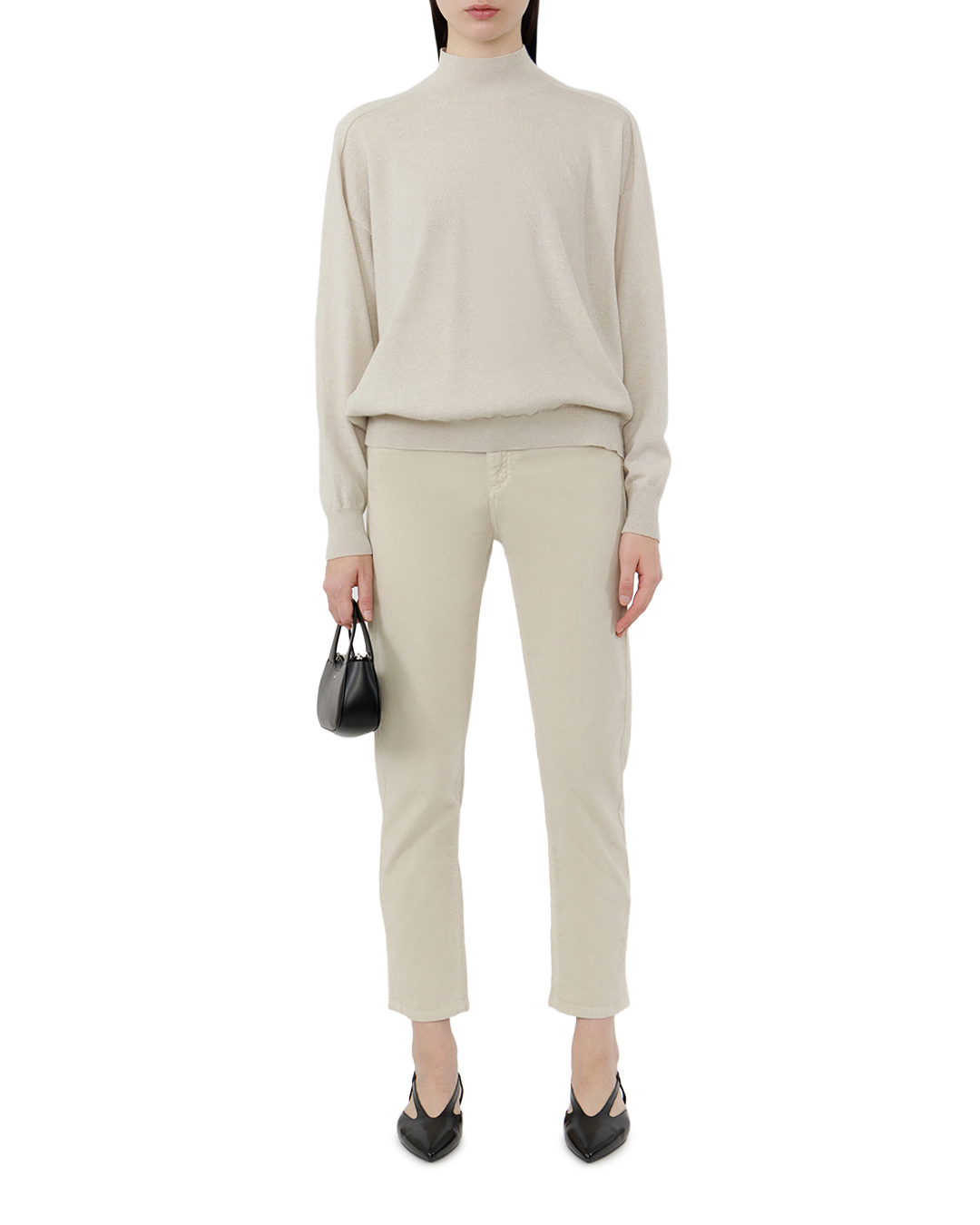 Эти брюки являются воплощением современной легкости и утонченной элегантности. Изготовленные из мягкой ткани благородного светлого оттенка, они привносят в образ свежесть и элегантность, предлагая при этом комфорт и стиль. Высокая талия подчеркивает изящность силуэта и добавляет ретро-шарм, идеально акцентируя внимание на линии живота и талии. Струящиеся линии создают обтекаемость формы, а зауженные штанины визуально удлиняют ноги, придавая фигуре стройность. Пояс с завязкой на шнурке добавляет нотку непринужденности, позволяя регулировать посадку и акцентируя индивидуальный стиль. Декоративные швы и тонированные заклепки добавляют детали, которые подчеркивают высокое качество и продуманность дизайна. Карманные отделки выполнены с минимализмом, сохраняя чистоту силуэта, но в то же время обеспечивая функциональность. Эти брюки предлагают непринужденную универсальность и утонченность, идеально подходя как для городских прогулок, так и для стильных выходов.