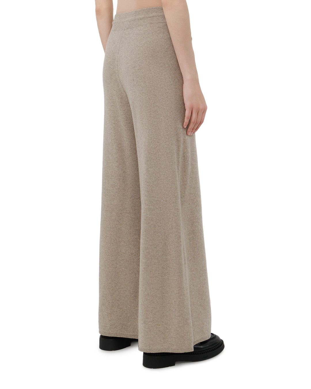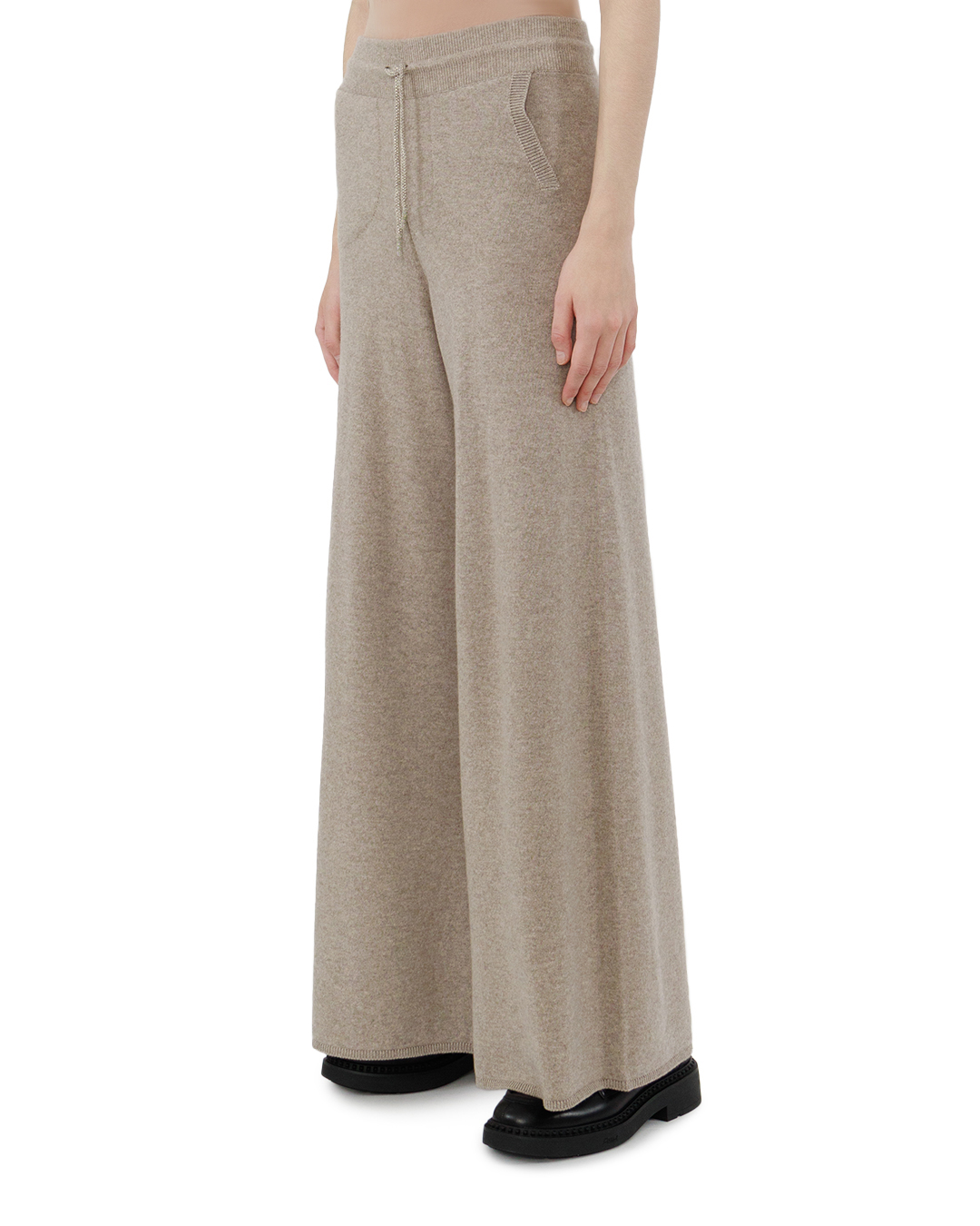 Эти брюки олицетворяют комфорт и современную элегантность, создавая идеальный баланс между расслабленностью и стилем. Изготовленные из мягкого и уютного вязаного материала, они предлагают нежную текстуру и тепло, создавая ощущение уюта и гармонии. Высокий эластичный пояс с завязкой на кулиске позволяет адаптировать посадку для максимального удобства, акцентируя талию и добавляя женственности силуэту. Широкие штанины, свободно ниспадающие к полу, придают образу легкость и непринужденность, обеспечивая свободу и плавность движений. Детали отделки, такие как тщательно обработанные края и деликатные швы, подчеркивают аккуратность и внимание к качеству изготовления. Светлый нейтральный оттенок добавляет универсальности, позволяя легко сочетать эти брюки с разнообразными элементами гардероба. Эти брюки станут незаменимой частью повседневного стиля, готовы подчеркнуть вашу индивидуальность и чувство вкуса в любом образе — от домашнего уюта до стильных прогулок по городу.
