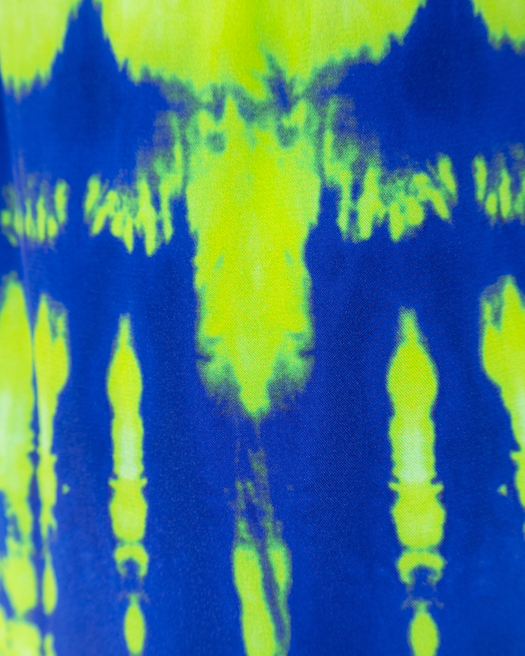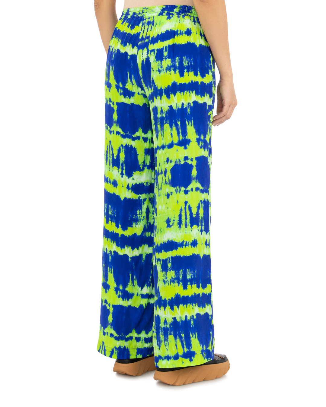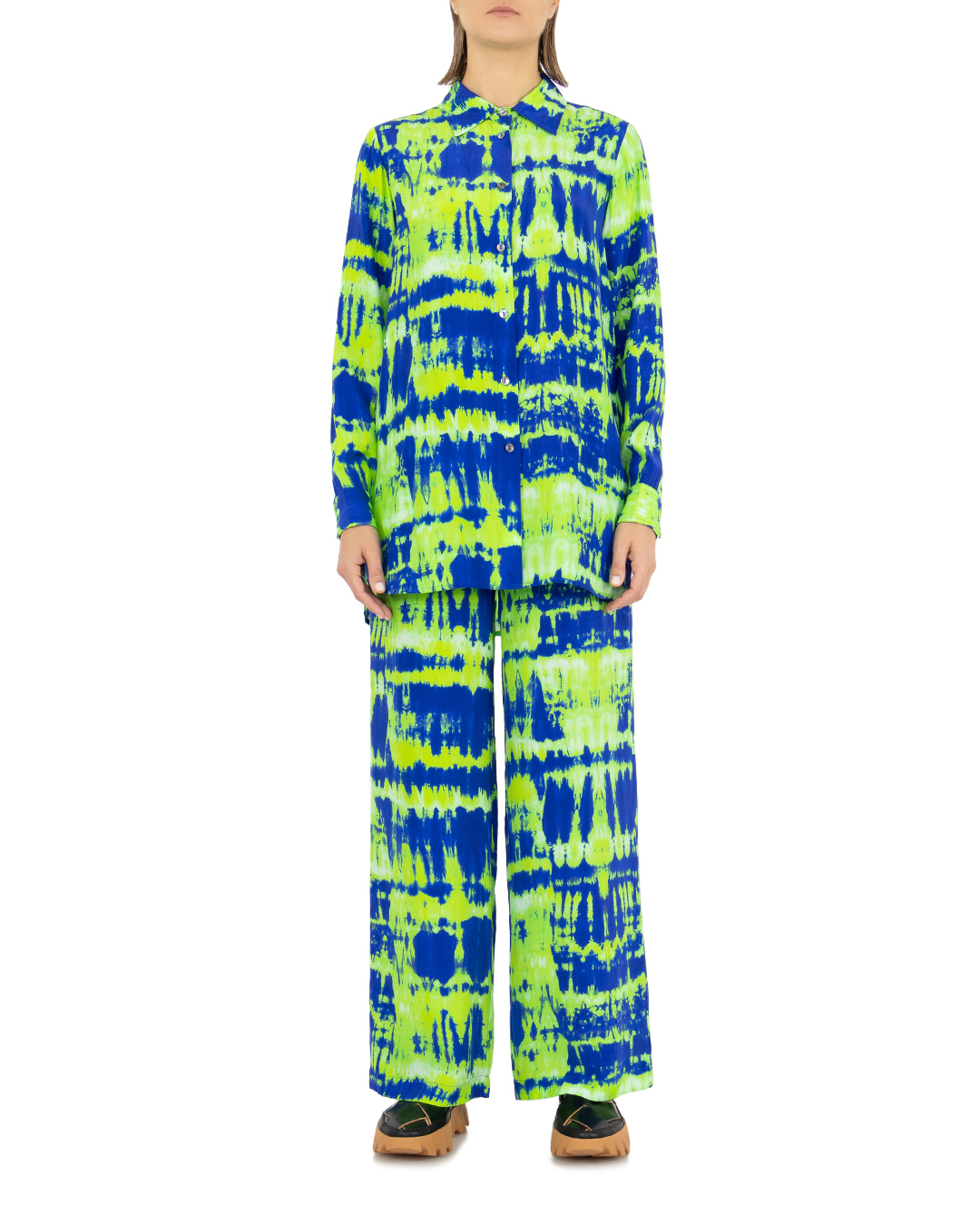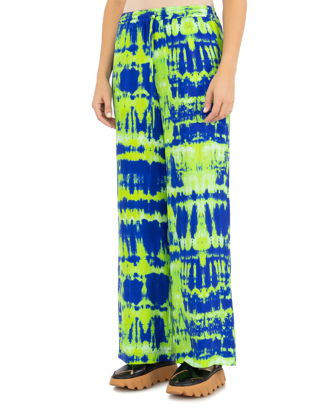 Брюки свободного кроя с ярким принтом из 100% шелка. Модель на широкой эластичной резинке с шнуровкой. Шелк известен таким свойством как высокая воздухопроницаемость и отличная терморегуляция, что гарантирует комфорт.