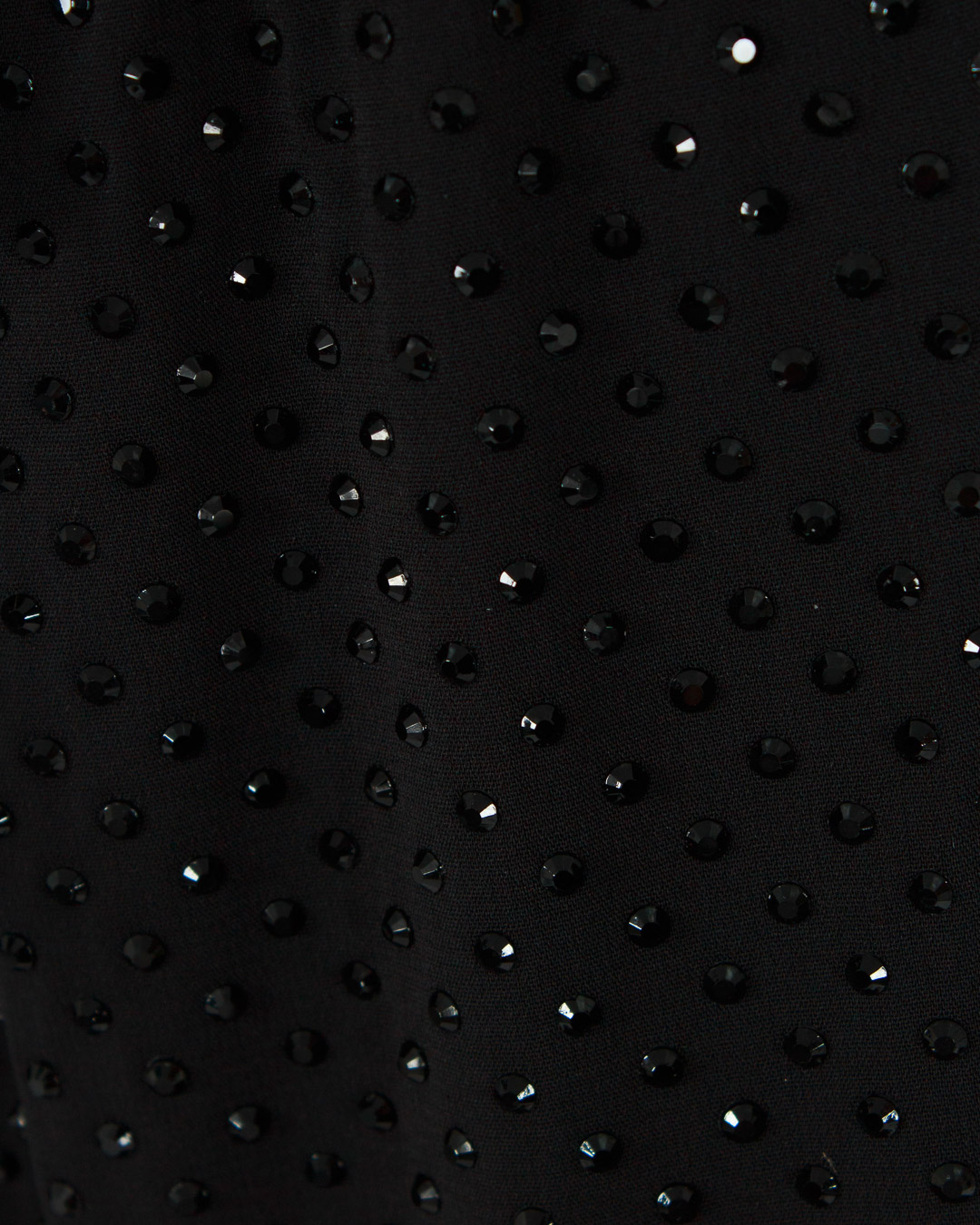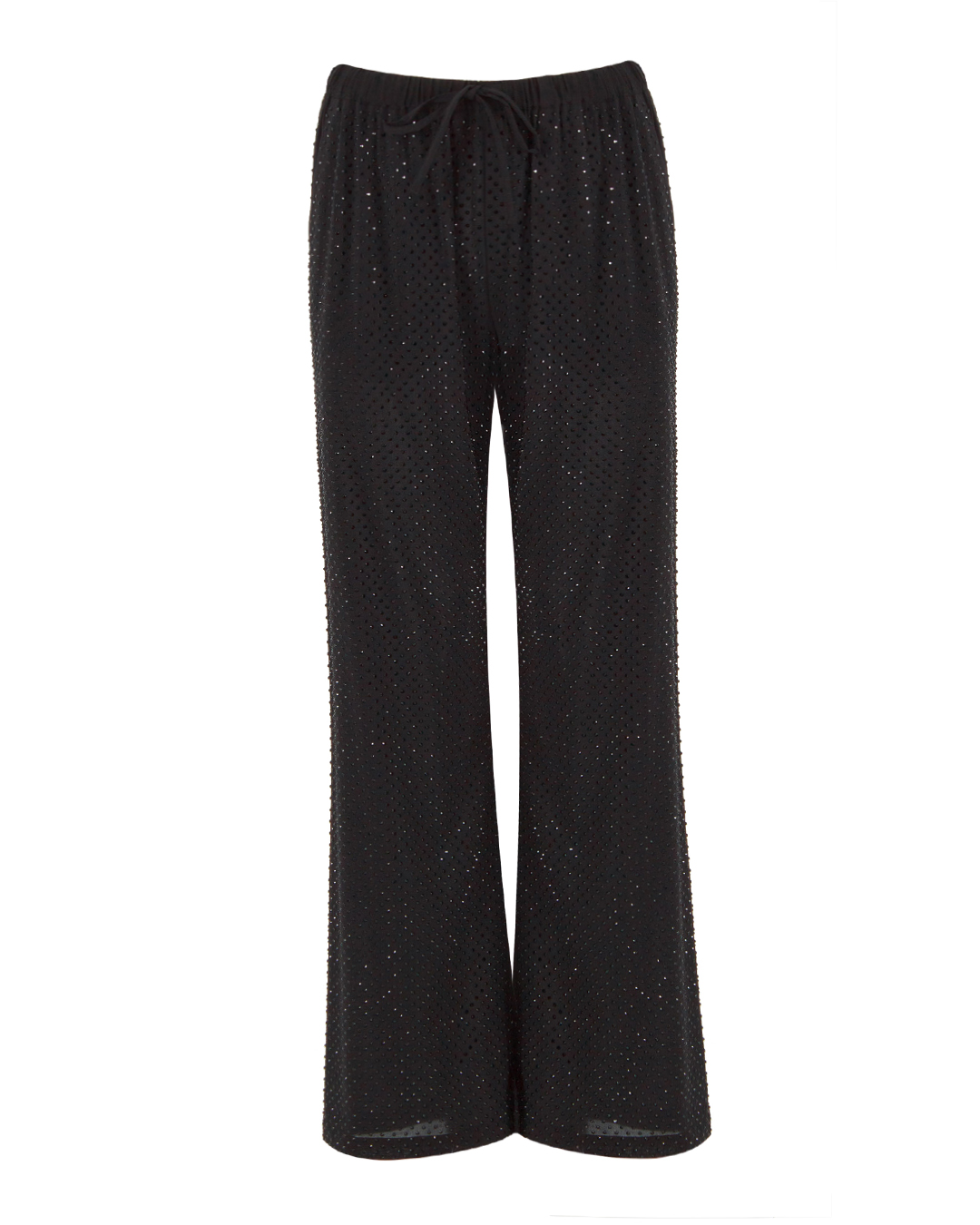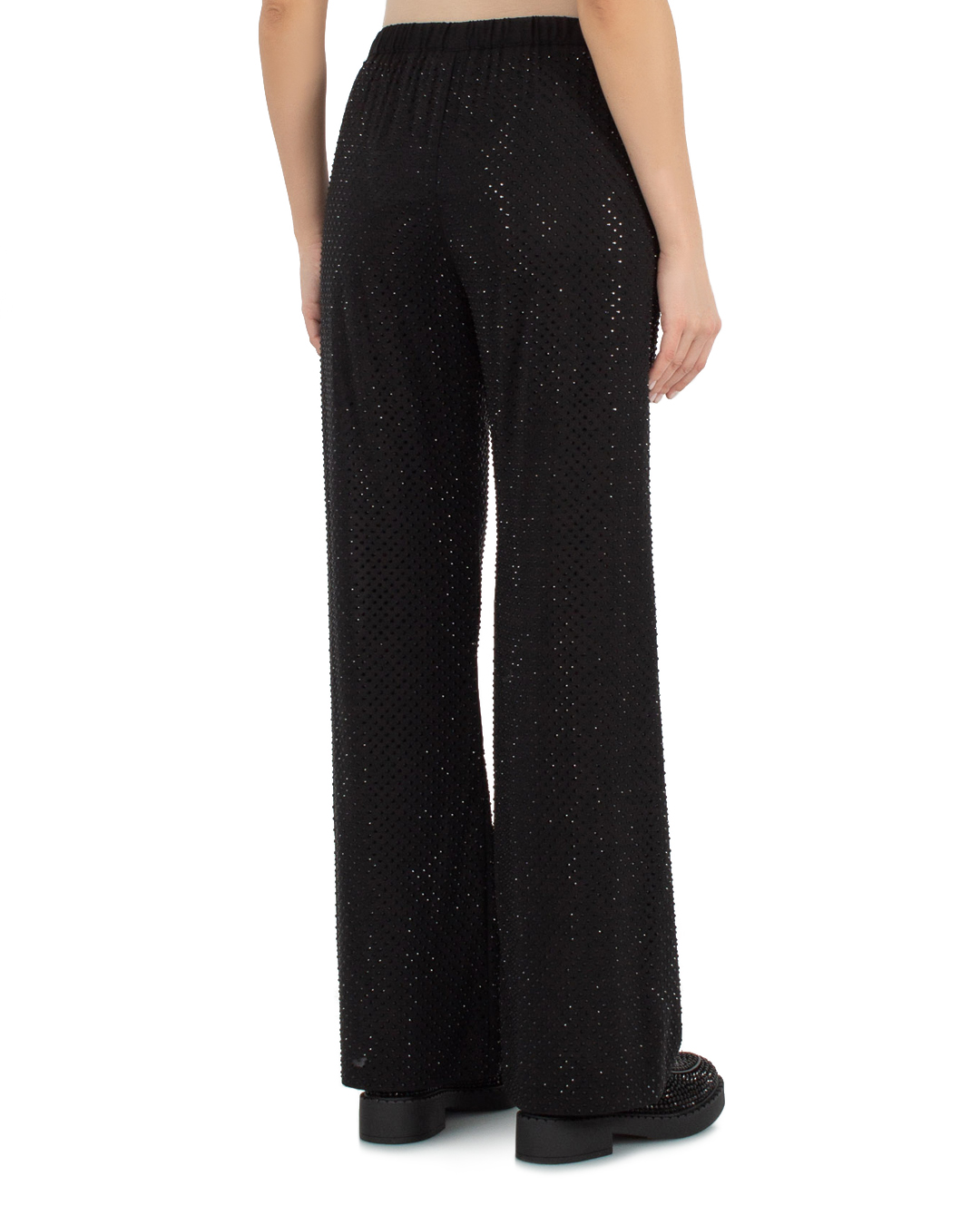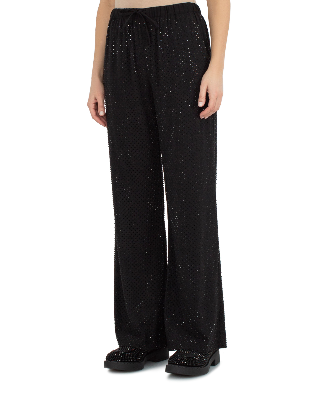 Брюки P.A.R.O.S.H. из крепа черного цвета с отделкой кристаллами. Модель прямого силуэта с широкими брючинами, эластичной линией пояса с завязками.