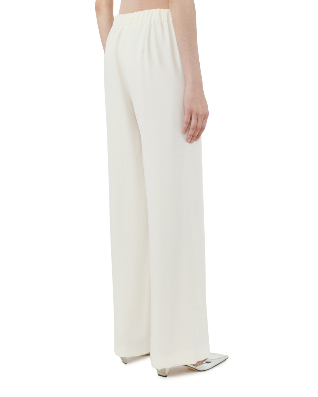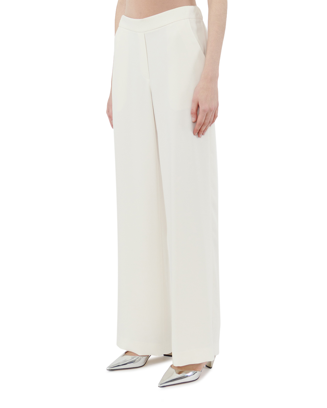 Эти брюки-палаццо словно созданы для того, чтобы подчеркнуть изящество и утончённость образа. Нежный молочно-белый оттенок придаёт модели особую чистоту и свежесть, превращая её в настоящий акцент любого ансамбля. Силуэт поражает своей гармоничной продуманностью: высокая посадка деликатно выделяет линию талии, визуально удлиняя фигуру и добавляя ей стройности. Широкие штанины ниспадают мягкими складками, создавая ощущение лёгкости и непринуждённости. Такой крой — это идеальный баланс между элегантностью и комфортом: брюки не сковывают движения, но при этом выглядят очень стильно. Ткань поражает своей благородной фактурой: матовая поверхность мягко играет со светом, а структура материала позволяет создавать изысканные драпировки. Материал отлично держит форму — не мнётся и не образует лишних заломов, сохраняя безупречный вид в течение всего дня. Лаконичность модели — её главная изюминка. Отсутствие броских декоративных элементов делает брюки универсальными: они легко сочетаются как с классическими блузами и жакетами, так и с более расслабленными топами. Чистые линии кроя и безупречная посадка превращают эту модель в незаменимую основу для самых разных образов — от делового до романтичного. Эти брюки-палаццо не просто дополняют гардероб, а задают настроение всему образу. Они воплощают в себе сдержанную роскошь и безупречный вкус, позволяя своей обладательнице чувствовать себя уверенно и элегантно в любой ситуации.