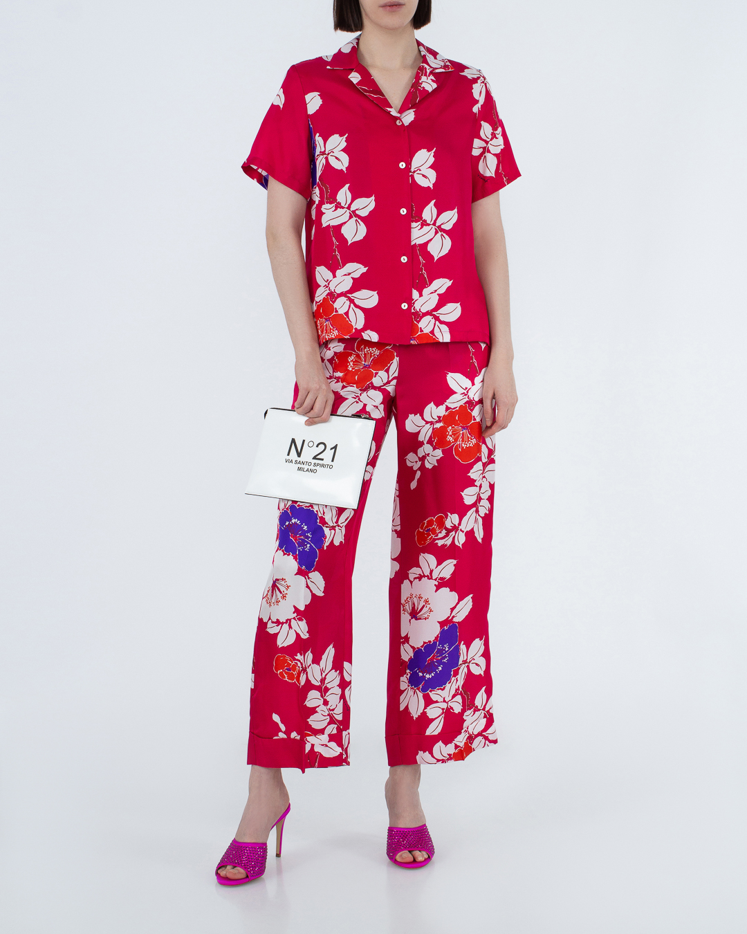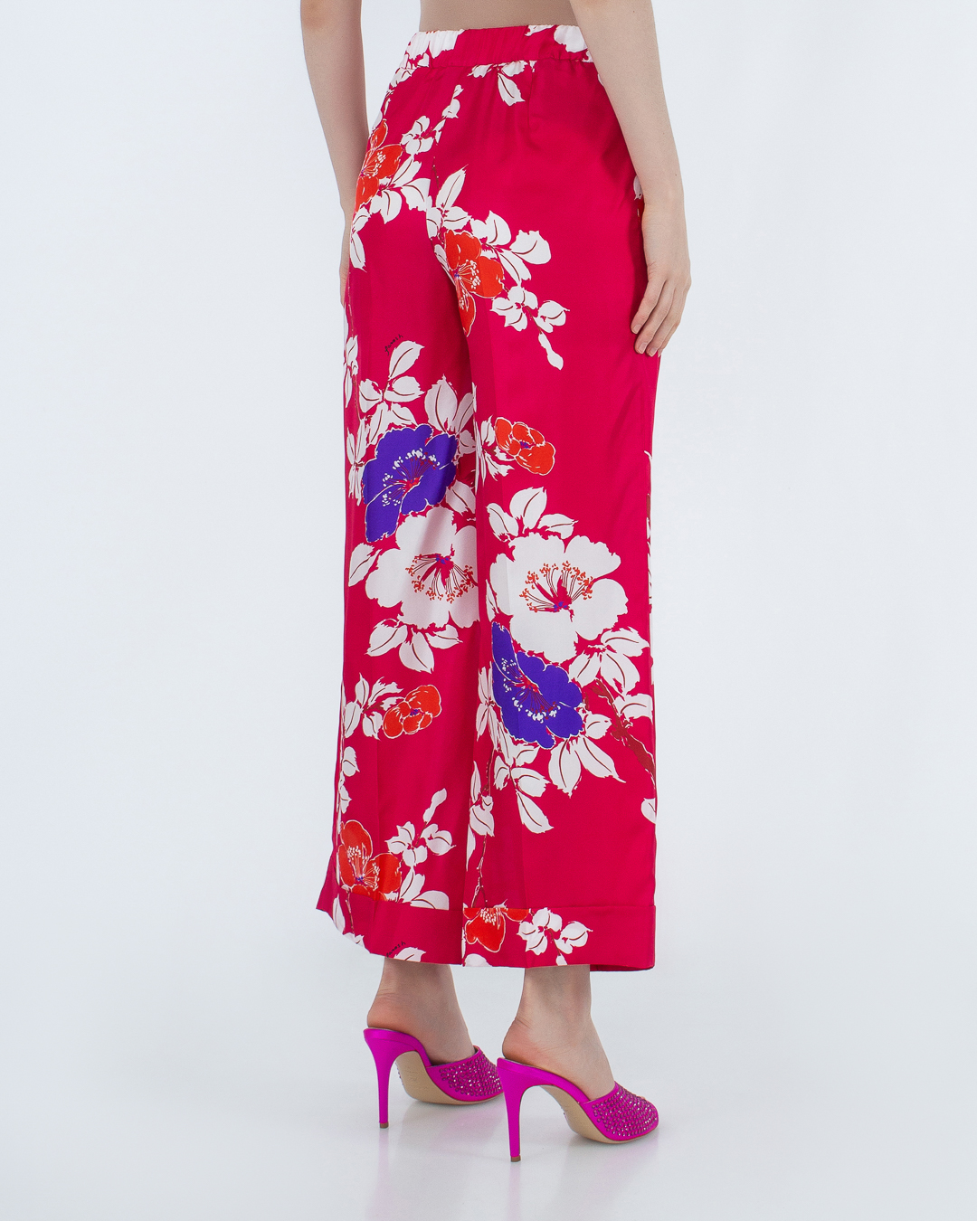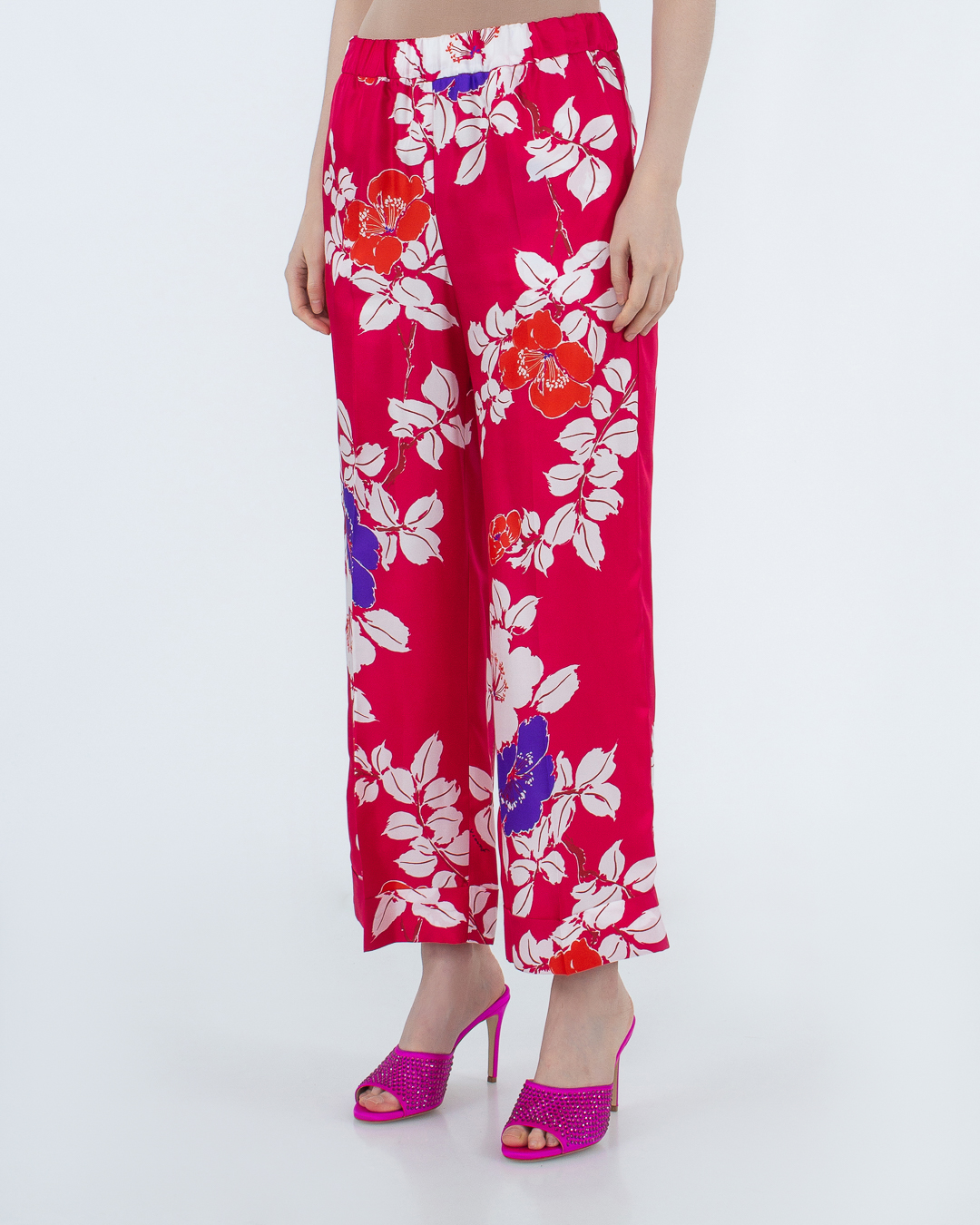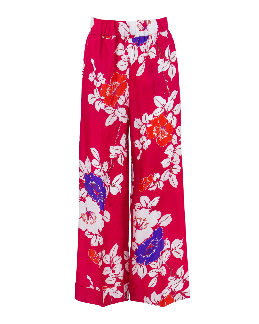 Брюки из принтованного шелка. Модель прямого силуэта с эластичной линией пояса.