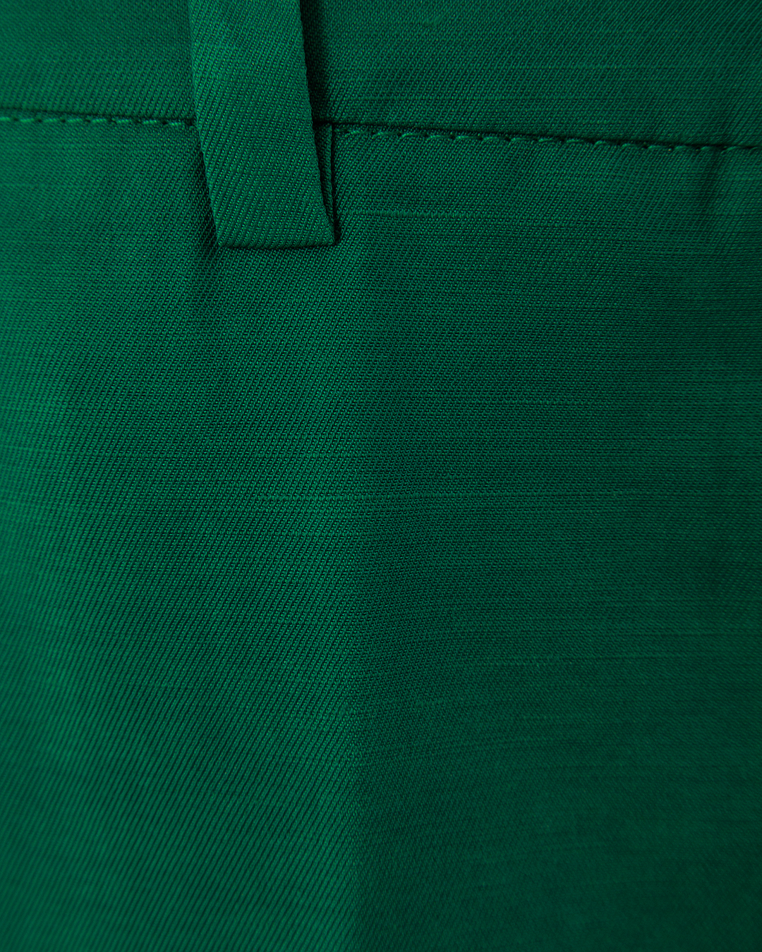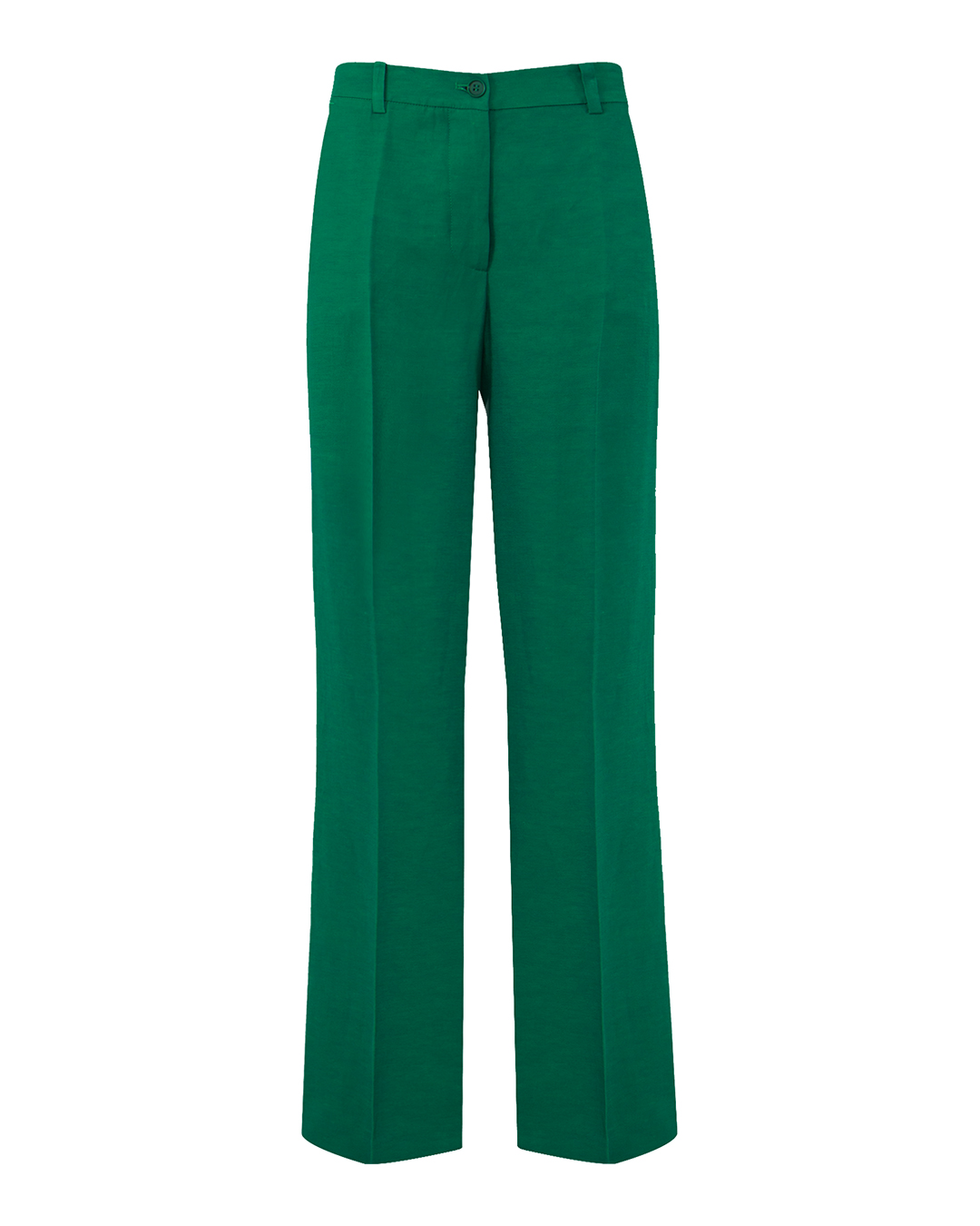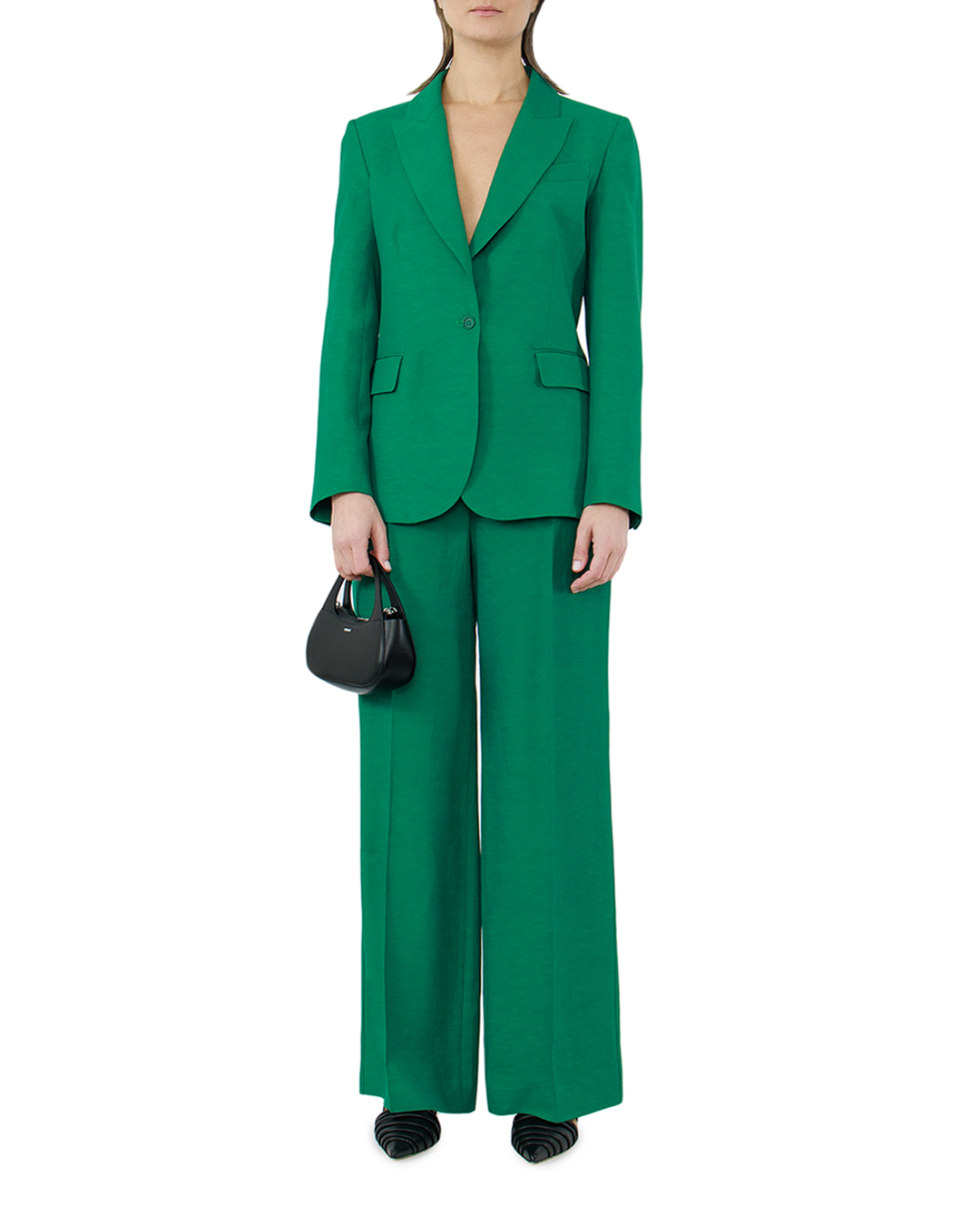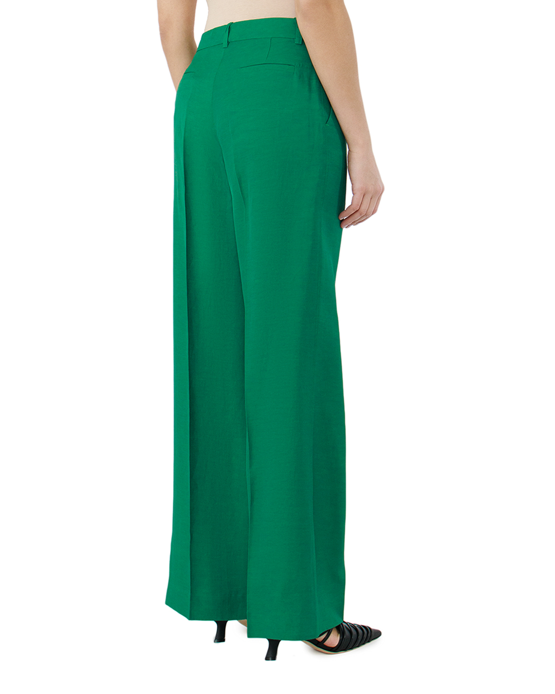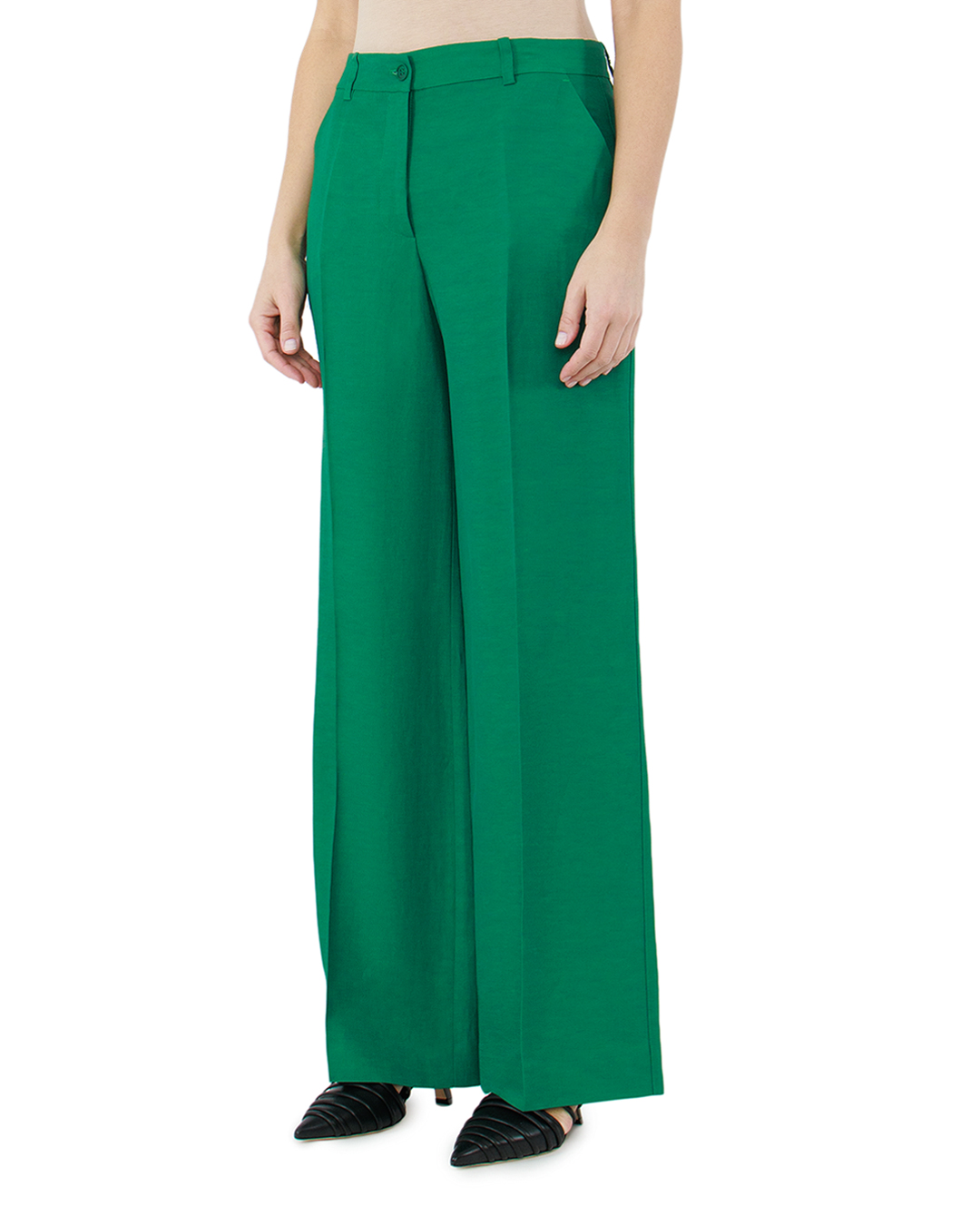 Расклешённые широкие брюки изо льна и вискозы от Parosh. Модель на завышенной талии, со стрелками.