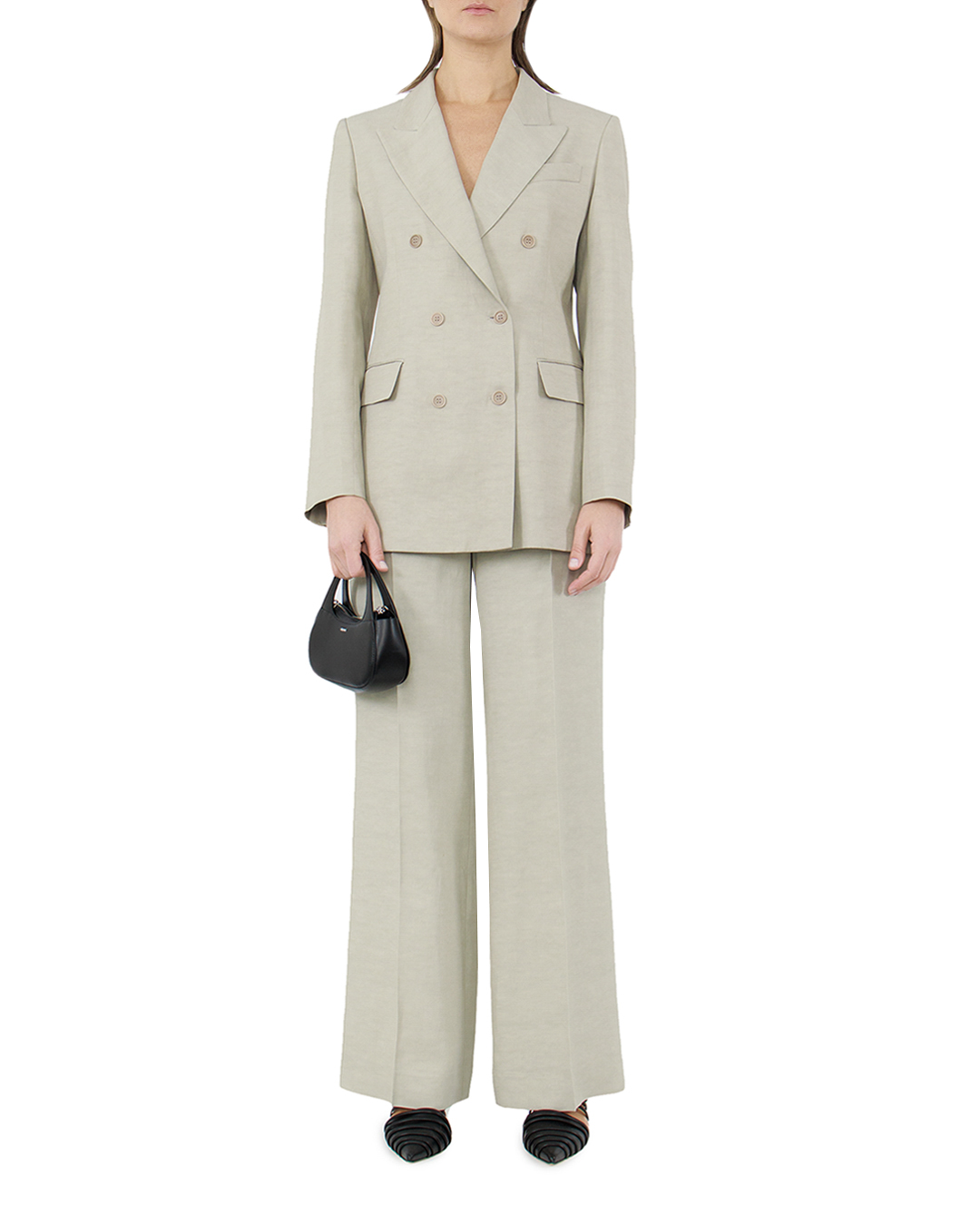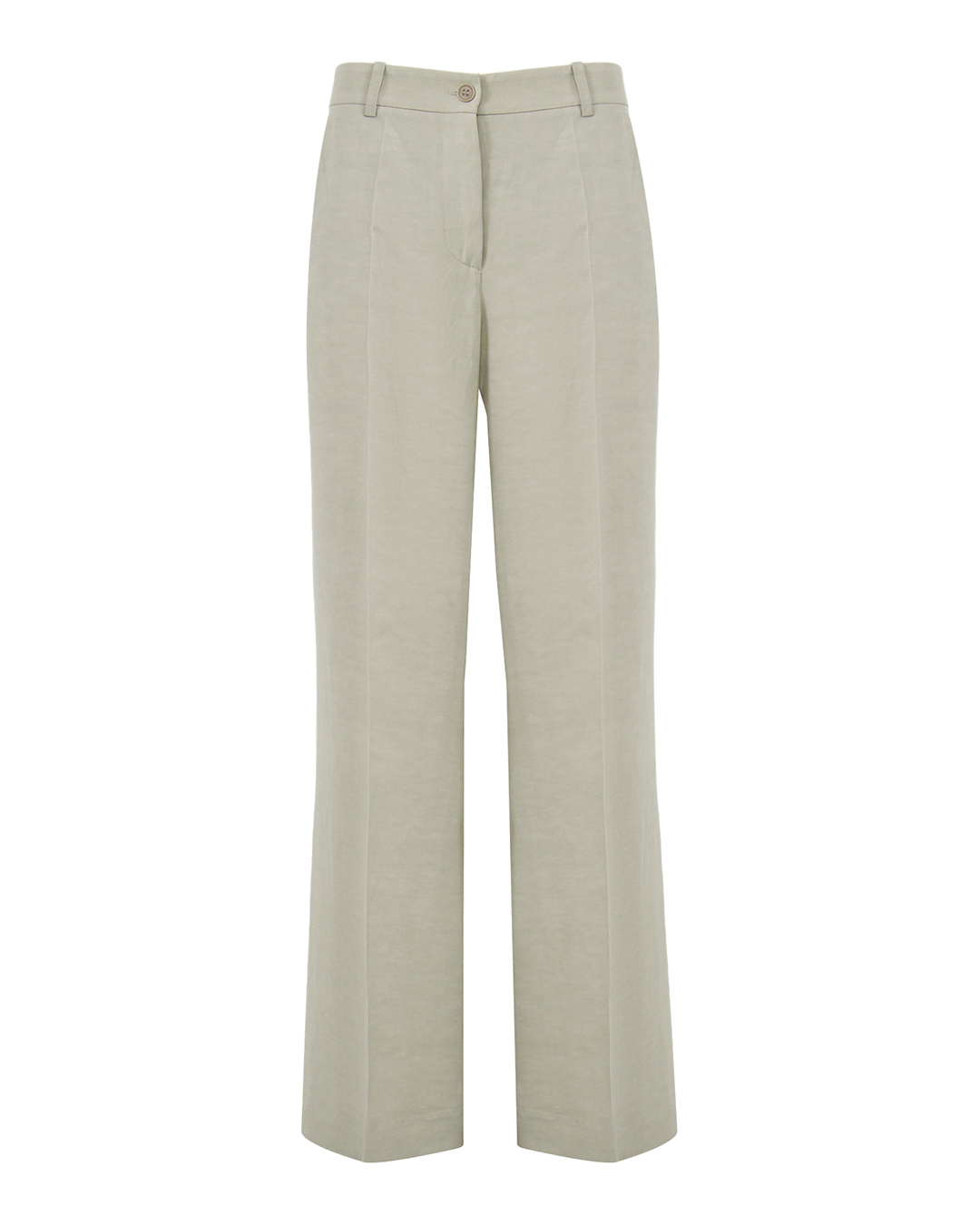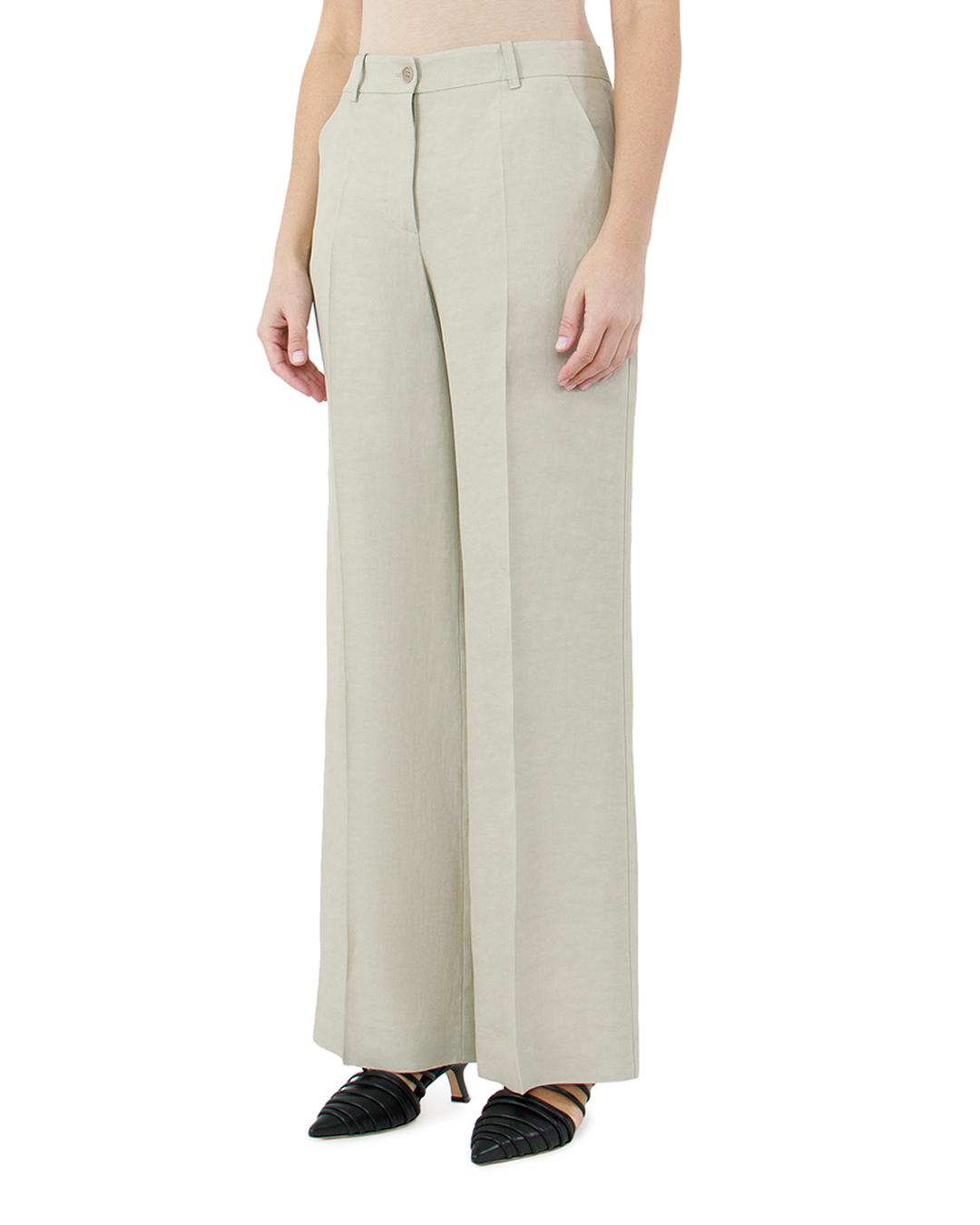Расклешённые широкие брюки изо льна и вискозы от Parosh. Модель на завышенной талии, со стрелками.