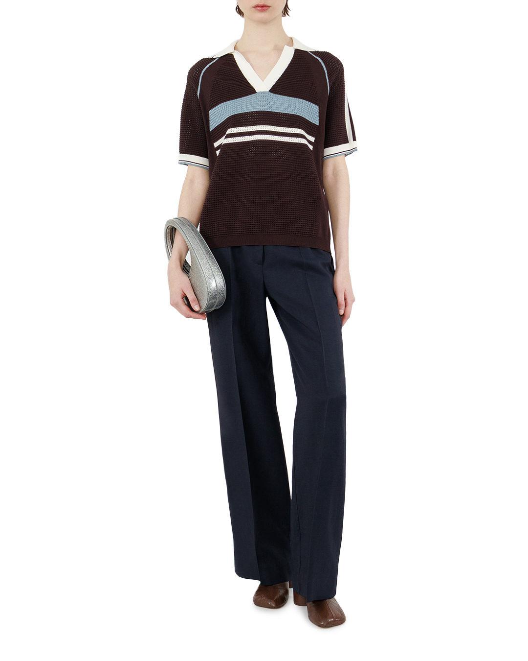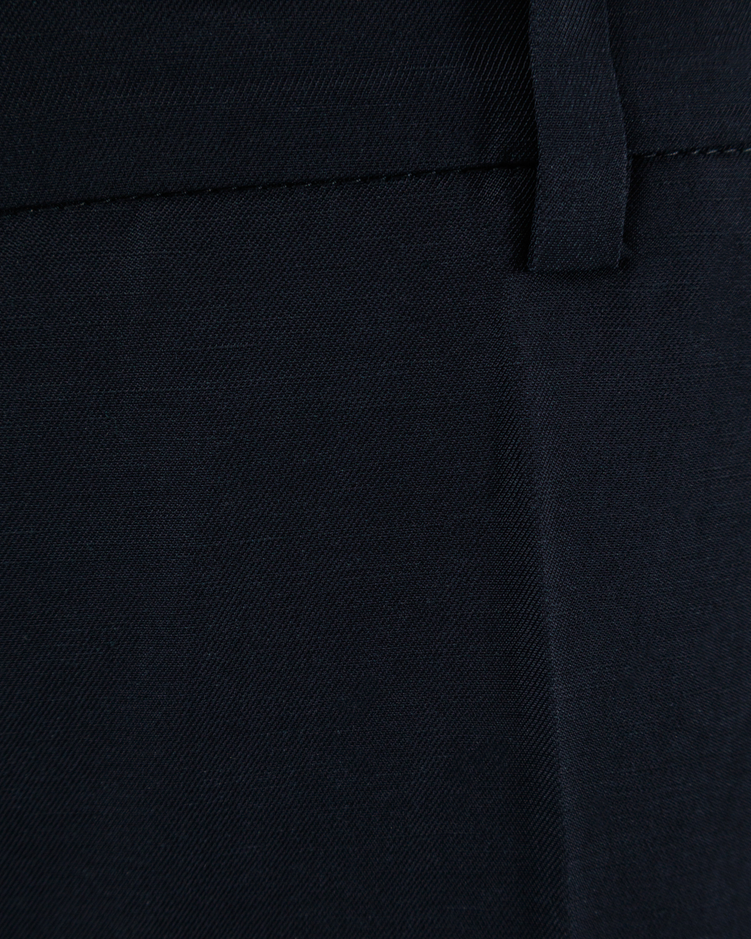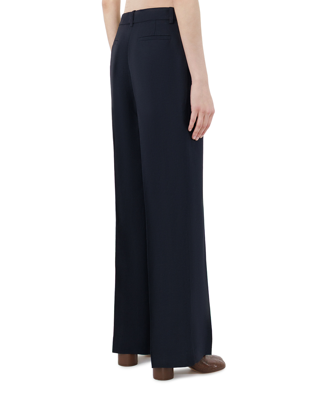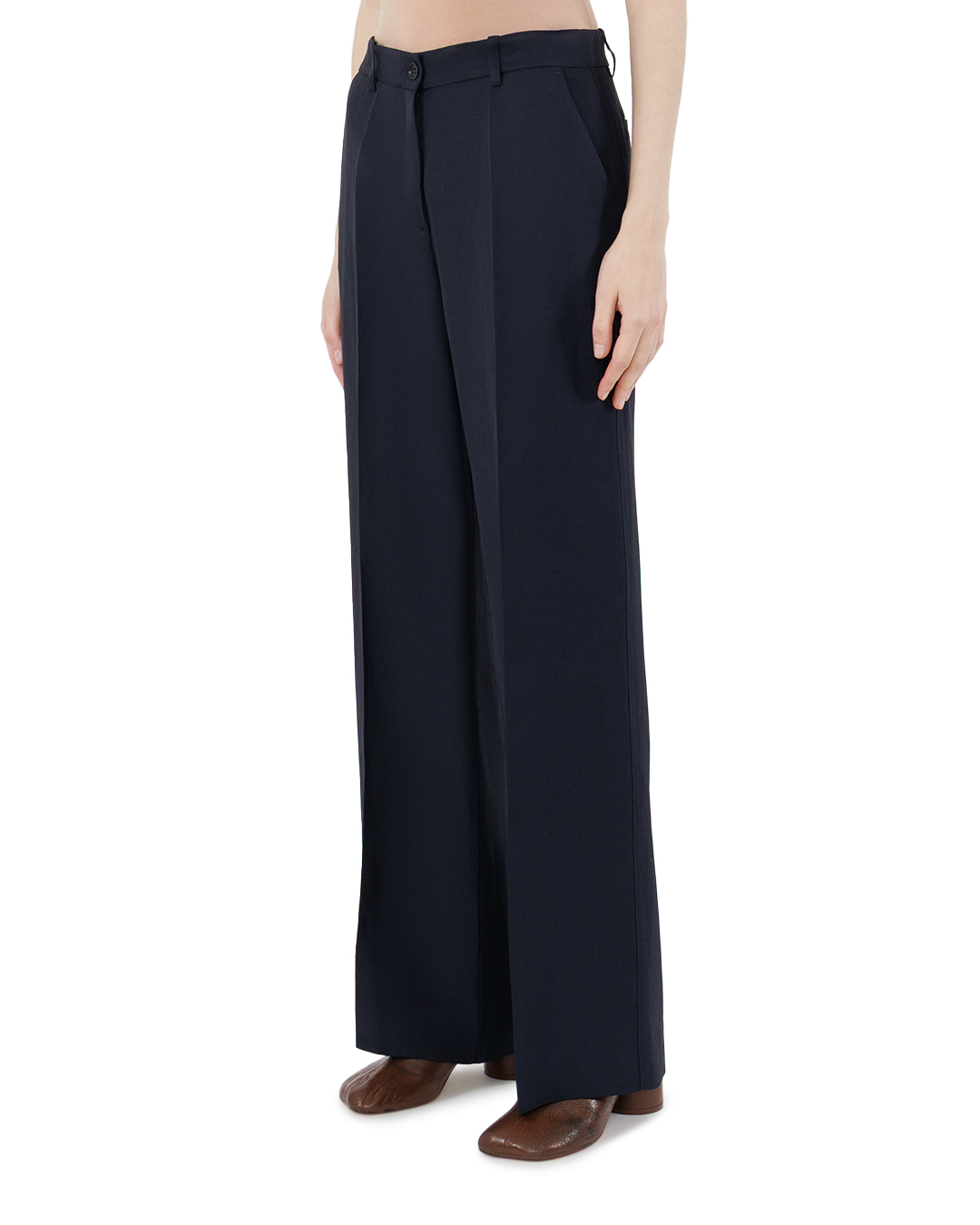 Эти брюки воплощают в себе изысканность и лаконичность — их силуэт словно создан для того, чтобы подчеркнуть природную элегантность. Тёмно-синий цвет придаёт образу глубину, создаёт ощущение сдержанной роскоши, не перегружая визуальное восприятие. Высокая посадка изящно выделяет линию талии, визуально удлиняя фигуру и добавляя силуэту грации. Прямой крой штанин балансирует между строгостью делового стиля и непринуждённостью повседневного образа. Плавные линии создают ощущение лёгкости, а продуманная геометрия кроя делает эти брюки универсальной базой для самых разных стилистических решений.