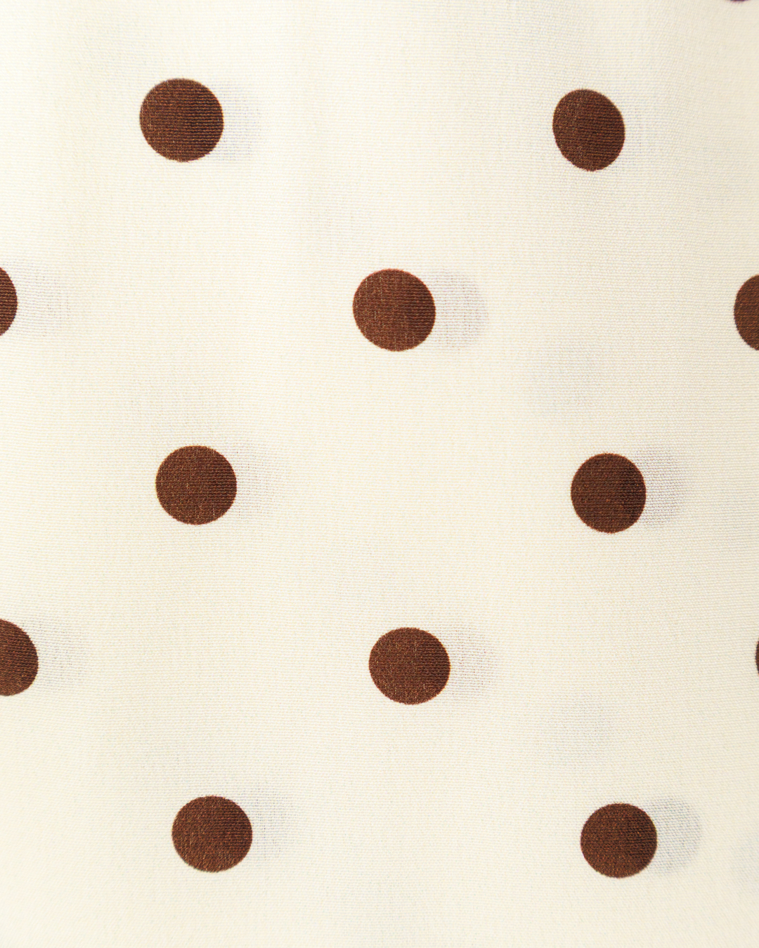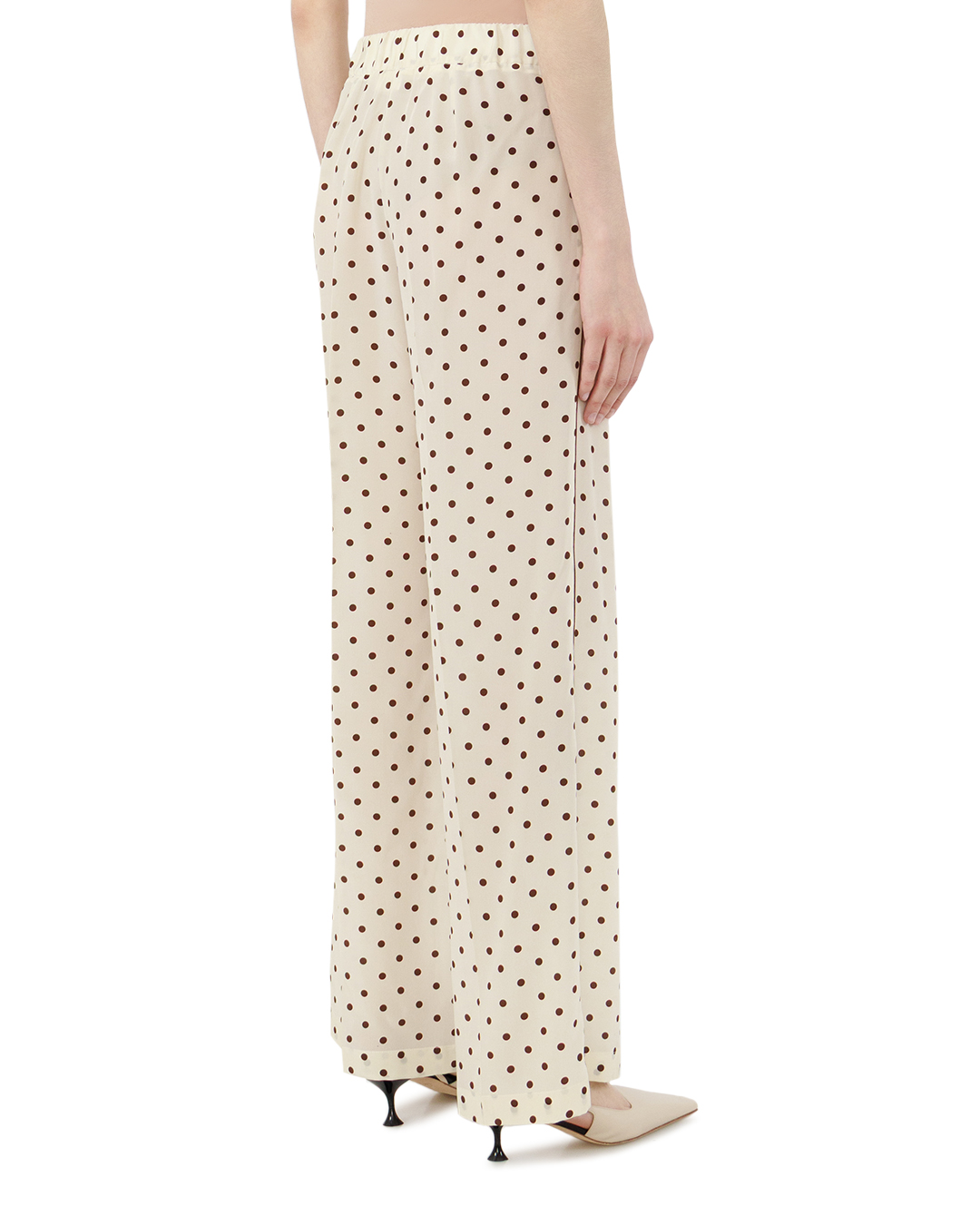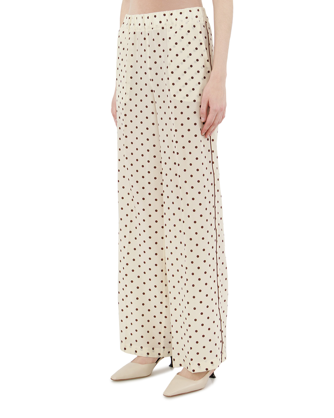 Данные брюки выполнены из лёгкой, струящейся ткани светлого оттенка с акцентным узором в виде равномерных контрастных горошин. Фактура материала придаёт модели эффект мягкой пластики и идеальную посадку по фигуре. Силуэт свободный, прямой, с высокой линией талии, что в сочетании с широкими штанинами создаёт ощущение непринуждённого шика и визуально удлиняет ноги. Ластовица талии оформлена эластичной тесьмой, обеспечивающей комфорт и адаптацию по объёму без потери формы. Линии отстрочки вертикального рельефа, проходящего вниз по средней части передних половинок, визуально стройнят и подчёркивают структуру изделия. Боковые швы дополнены аккуратной контрастной отделочной строчкой, которая служит изящным декоративным элементом, сохраняя при этом лаконичность и стиль. Низ обработан классическим подгибом с плотной фиксацией шва, гарантирующим долговечность. Эта модель прекрасно сочетается как с деловым, так и с повседневным гардеробом, подчёркивая изысканность и женственность образа.