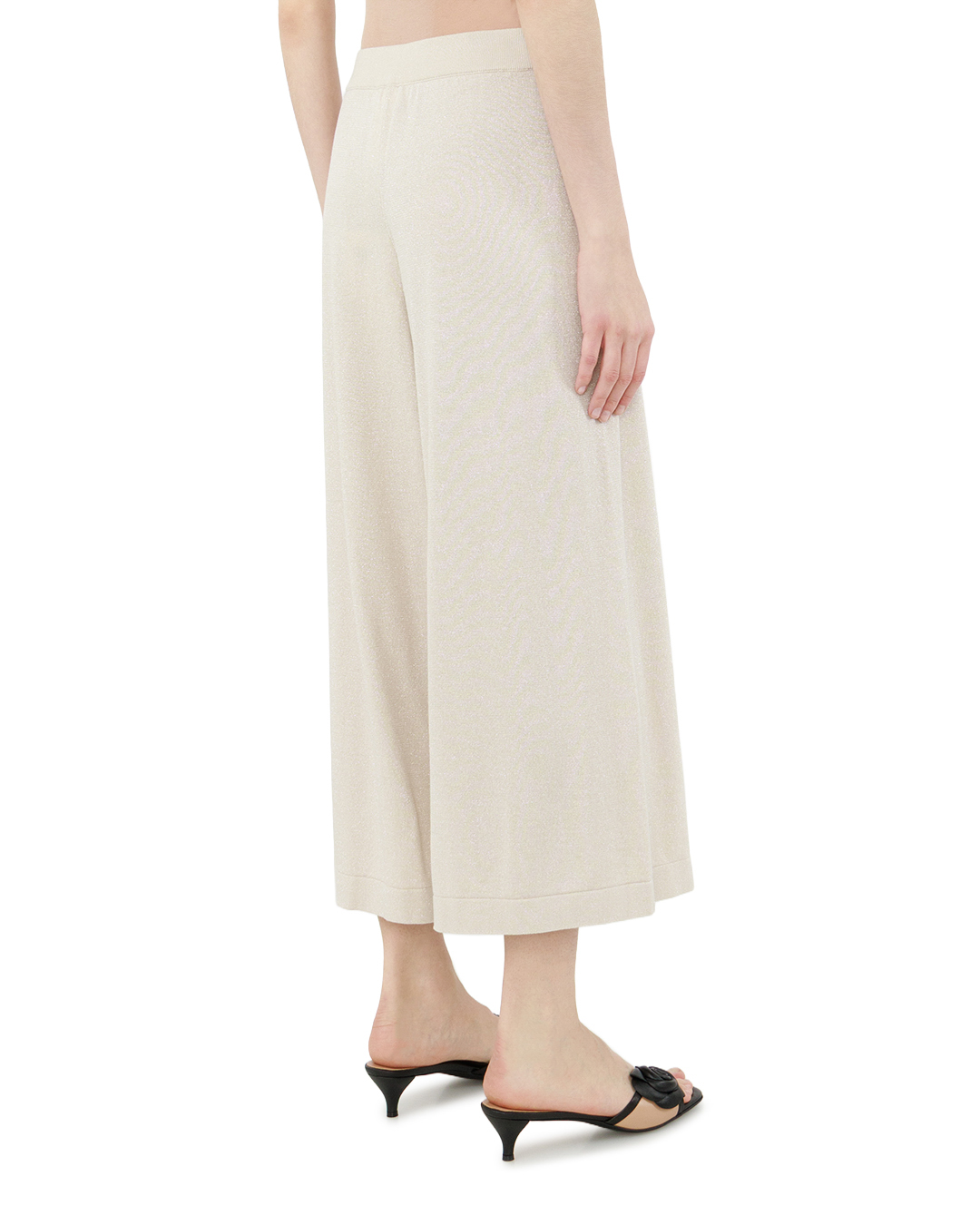 Эти изысканные кюлоты в нежном молочном оттенке — воплощение утончённой лёгкости и комфорта. Свободный, слегка расклёшенный крой создаёт воздушный, непринуждённый силуэт, который подчёркивает женственность и дарит ощущение свободы движений. Высокая посадка с эластичной резинкой мягко облегает талию, визуально удлиняя ноги и формируя изящный контур. Центральная складка на передней части каждой штанины придаёт модели лаконичную строгость, гармонично сочетаясь с общим расслабленным характером изделия. Боковые швы выполнены аккуратно, без излишней асимметрии — это делает вещь универсальной и практичной. Низ брюк оформлен чётко, с аккуратной подгибкой, что сохраняет чистоту линий и позволяет сочетать кюлоты как с изящной обувью на каблуке, так и с лёгкими сандалиями. Отсутствие обильного декора делает эти брюки идеальной базой для создания многослойных образов: от элегантного ансамбля с приталенной блузой до непринуждённого лука с простым топом. Сдержанный оттенок и продуманный крой делают эту модель находкой для тех, кто ценит баланс между стилем и удобством. Кюлоты подчёркивают индивидуальность, добавляют облику лёгкости и непринуждённой элегантности, оставаясь при этом функциональными и удобными в носке. Эта вещь способна стать центральным элементом гардероба, преображая любой образ своей изысканной простотой.