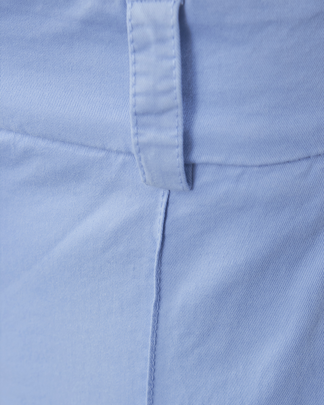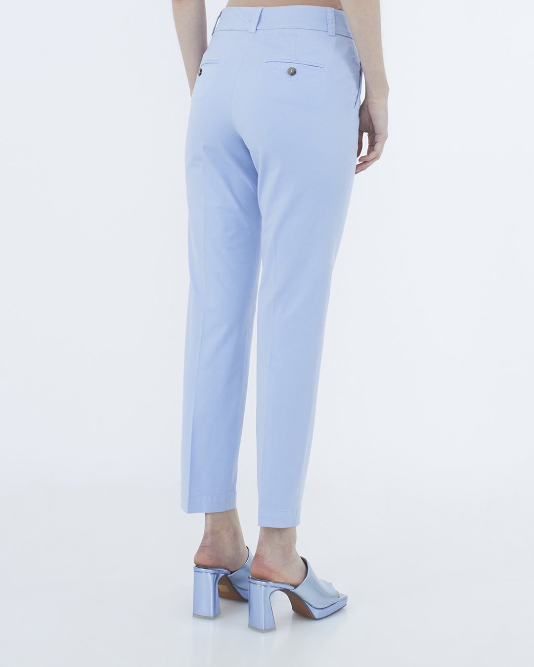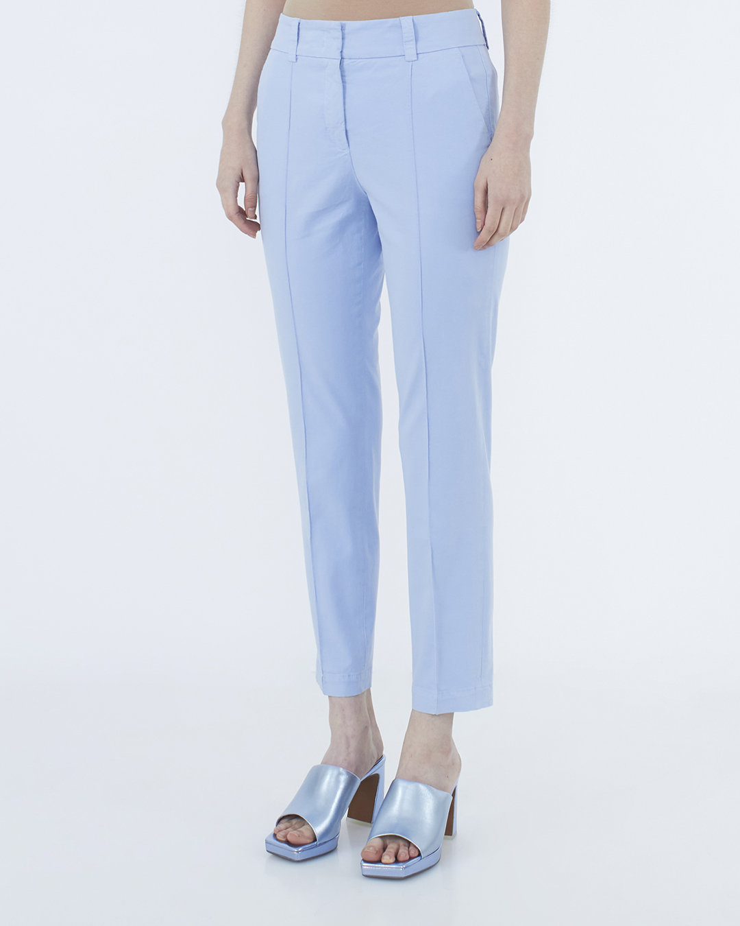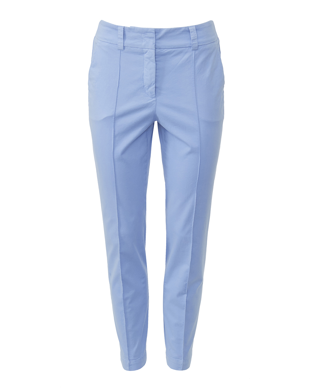 Брюки Peserico сшиты из хлопка голубого оттенка. Модель прямого силуэта полуприлегающего силуэта с комфортной высокой посадкой и застежкой на молнию и крючок. Брюки дополнены двумя карманами по бокам.