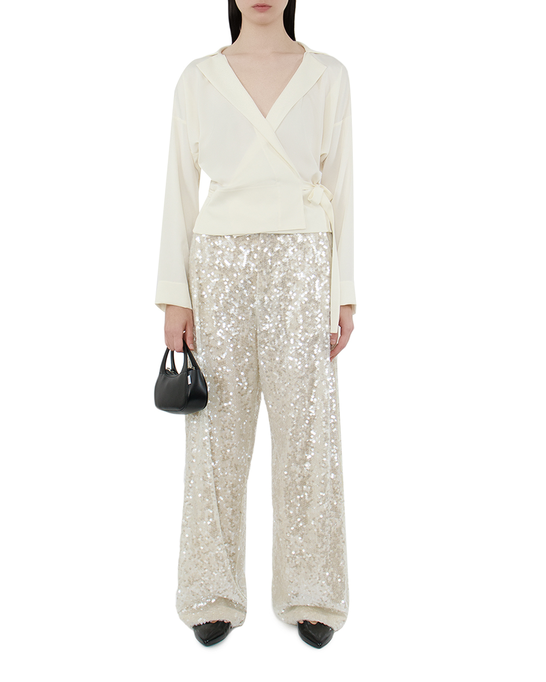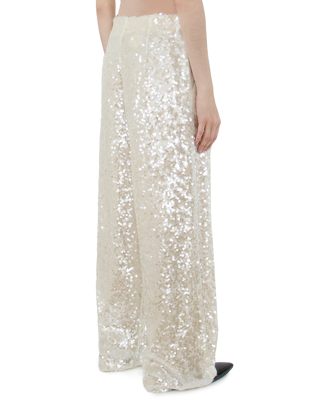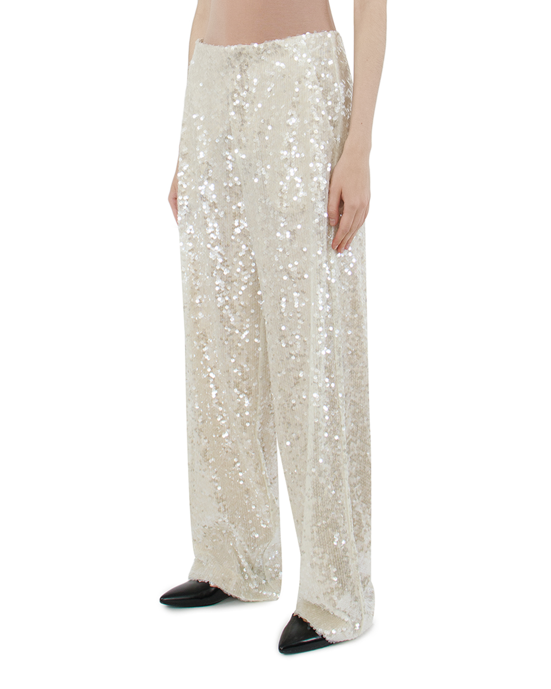 Эти роскошные брюки украшают каждый образ своими сияющими деталями, которые привлекают внимание и создают атмосферу праздника. Изготовленные из высококачественного материала, они обтягивают силуэт, и придают утончённую элегантность всем движениям. Главная особенность – полное покрытие пайетками, которое добавляет изделию яркости и текстурной глубины, создавая эффект непрерывной волны блеска при каждом шаге. Широкие брючины обеспечивают свободный крой, что вкупе с завышенной талией формирует вытянутый и стройный силуэт, визуально удлиняя ноги. Эти брюки идеально подходят для вечерних выходов, сочетаясь как с изысканными блузами, так и с лаконичными топами, предлагая неограниченные варианты для создания запоминающихся образов. Брюки станут настоящим звёздным элементом гардероба, придавая атмосфере мерцание и светский гламур.