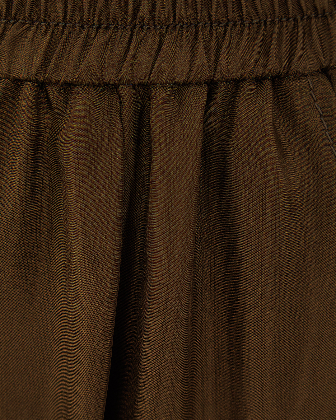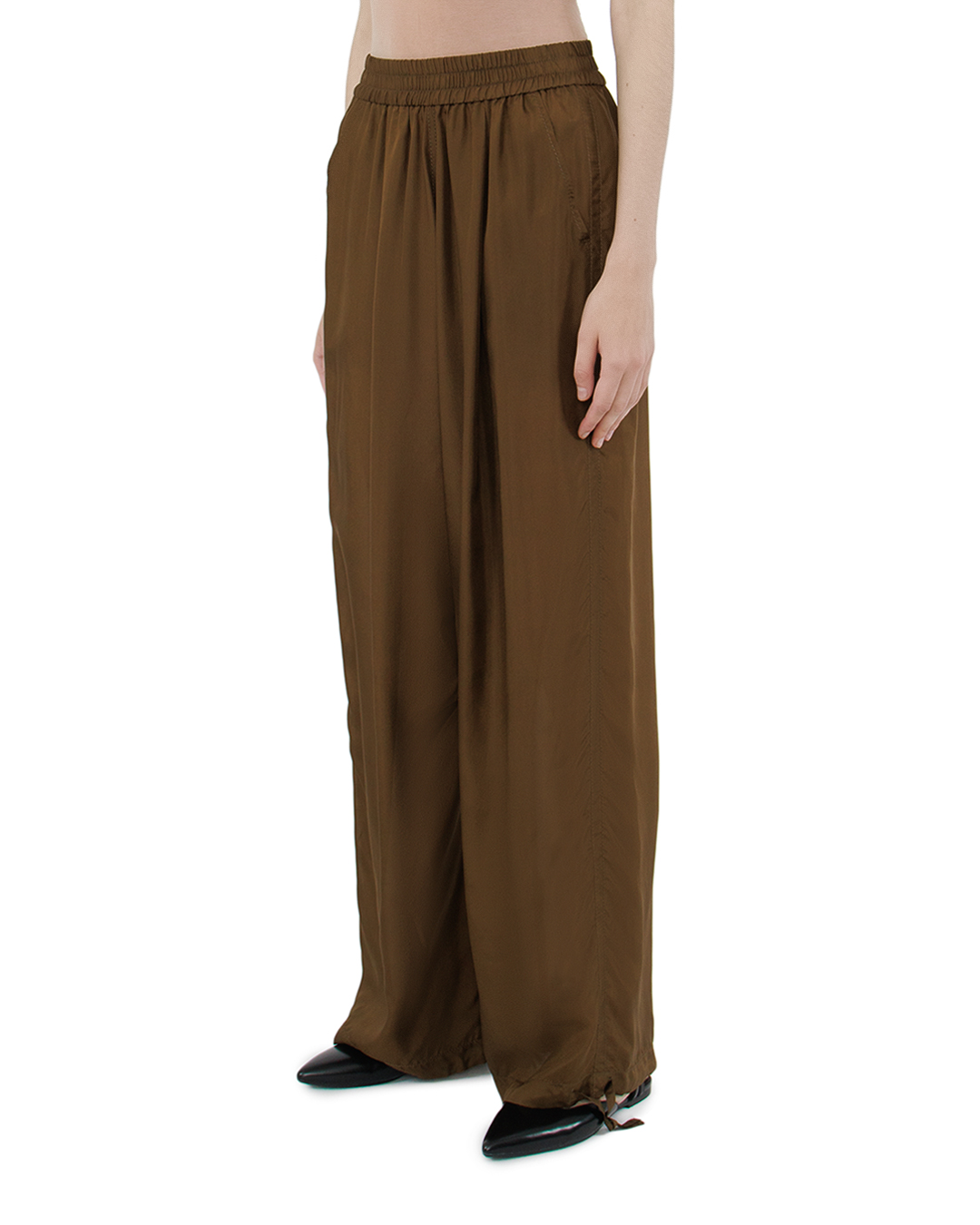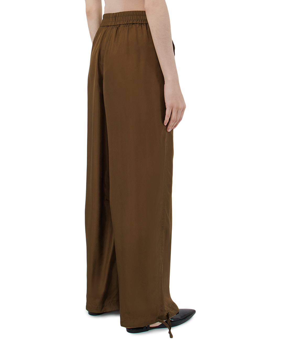 Эти брюки привносят в образ изысканную непринужденность и актуальный стиль. Изготовленные из мягкой, струящейся ткани, они создают впечатление комфорта и лёгкости, что делает их идеальным выбором для повседневной носки. Эластичная талия обеспечивает идеальную посадку и адаптируется к фигуре, добавляя комфорта. Свободный крой и широкие брючины создают ощущение непринуждённости и лёгкости, придавая образу динамику и современность. Регулируемая кулиска внизу брючин добавляет функциональности и позволяет варьировать длину, создавая модные акценты и добавляя индивидуальность. Скрытые боковые карманы подчёркивают практичность и минимализм дизайна. Эти брюки легко комбинируются с различными топами и аксессуарами, позволяя создавать разнообразные стильные аутфиты, которые подойдут как для городской суеты, так и для отдыха.